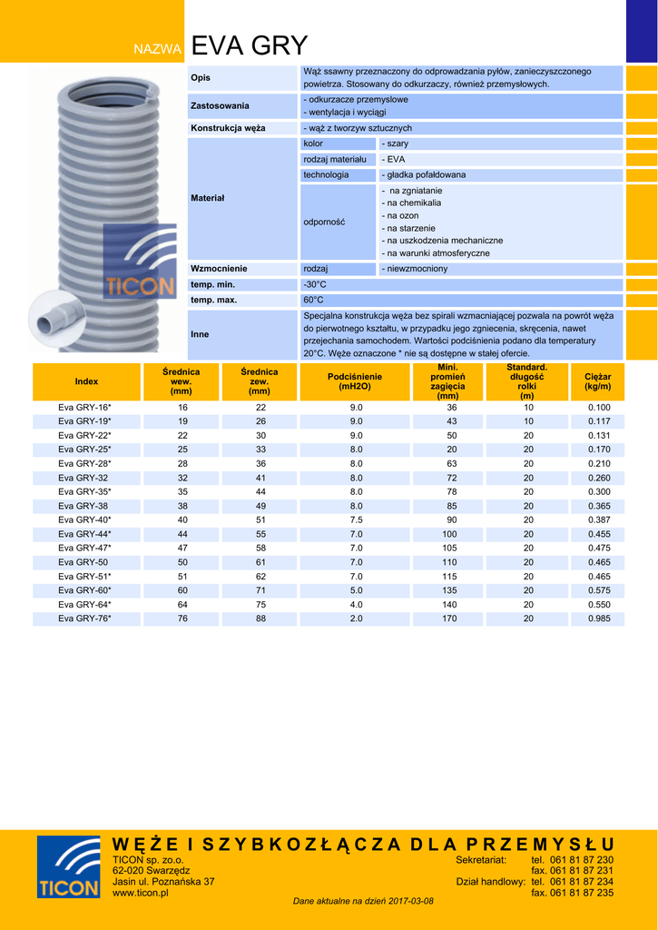 NAZWA EVA GRY Opis Wąż ssawny przeznaczony do odprowadzania pyłów, zanieczyszczonego powietrza. Stosowany do odkurzaczy, również przemysłowych. Zastosowania - odkurzacze przemyslowe - wentylacja i wyciągi Konstrukcja węża - wąż z tworzyw sztucznych kolor - szary rodzaj materiału - EVA technologia - gładka pofałdowana odporność - na zgniatanie - na chemikalia - na ozon - na starzenie - na uszkodzenia mechaniczne - na warunki atmosferyczne Wzmocnienie rodzaj - niewzmocniony temp. min. -30°C temp. max. 60°C Inne Specjalna konstrukcja węża bez spirali wzmacniającej pozwala na powrót węża do pierwotnego kształtu, w przypadku jego zgniecenia, skręcenia, nawet przejechania samochodem. Wartości podciśnienia podano dla temperatury 20°C. Węże oznaczone * nie są dostępne w stałej ofercie. Materiał Standard. Standard. długość długość rolki rolki (m) (m) 10 Ciężar Ciężar (kg/m) (kg/m) 43 10 0.117 50 20 0.131 8.0 20 20 0.170 36 8.0 63 20 0.210 32 41 8.0 72 20 0.260 Eva GRY-35* 35 44 8.0 78 20 0.300 Eva GRY-38 38 49 8.0 85 20 0.365 Eva GRY-40* 40 51 7.5 90 20 0.387 Eva GRY-44* 44 55 7.0 100 20 0.455 Eva GRY-47* 47 58 7.0 105 20 0.475 Eva GRY-50 50 61 7.0 110 20 0.465 Eva GRY-51* 51 62 7.0 115 20 0.465 Eva GRY-60* 60 71 5.0 135 20 0.575 Eva GRY-64* 64 75 4.0 140 20 0.550 Eva GRY-76* 76 88 2.0 170 20 0.985 Index Index Średnica wew. (mm) Średnica zew. (mm) Podciśnienie Podciśnienie (mH2O) (mH2O) Eva GRY-16* 16 22 9.0 Eva GRY-19* 19 26 9.0 Eva GRY-22* 22 30 9.0 Eva GRY-25* 25 33 Eva GRY-28* 28 Eva GRY-32 Mini. Mini. promień promień zagięcia zagięcia (mm) (mm) 36 0.100 WĘŻE I SZYBKOZŁĄCZA DLA PRZEMYSŁU TICON sp. zo.o. 62-020 Swarzędz Jasin ul. Poznańska 37 www.ticon.pl Sekretariat: Dane aktualne na dzień 2017-03-08 tel. 061 81 87 230 fax. 061 81 87 231 Dział handlowy: tel. 061 81 87 234 fax. 061 81 87 235