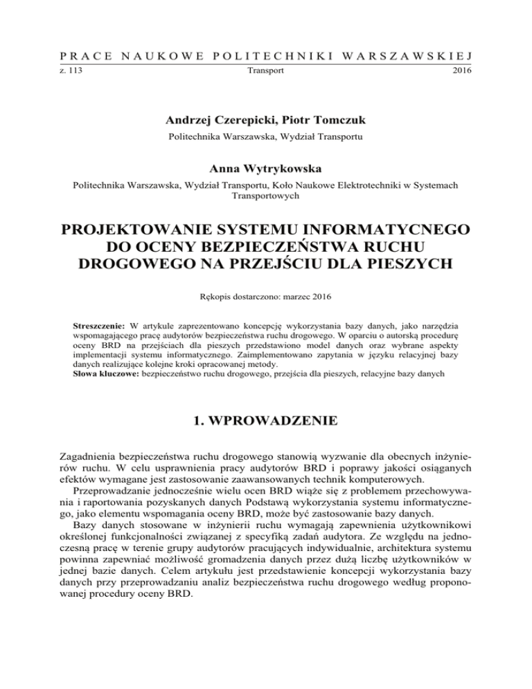techniki Warszawskiej, Transport, Wybrane problemy ekonomiczne, organizacyjne i techniczne w transporcie, z. 108, str. 109- 121, Oficyna Wydawnicza Politechniki Warszawskiej, Warszawa, 2015.