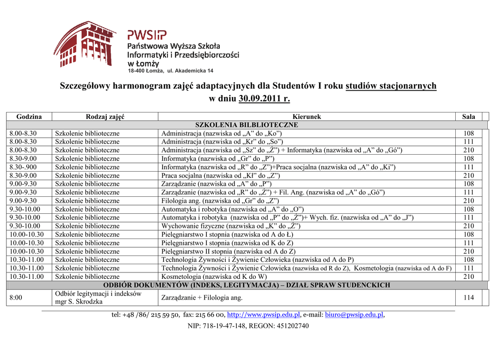 18-400 Łomża, ul. Akademicka 14 Szczegółowy harmonogram zajęć adaptacyjnych dla Studentów I roku studiów stacjonarnych w dniu 30.09.2011 r. Godzina 8.00-8.30 8.00-8.30 8.00-8.30 8.30-9.00 8.30-.900 8.30-9.00 9.00-9.30 9.00-9.30 9.00-9.30 9.30-10.00 9.30-10.00 9.30-10.00 10.00-10.30 10.00-10.30 10.00-10.30 10.30-11.00 10.30-11.00 10.30-11.00 8:00 Rodzaj zajęć Kierunek SZKOLENIA BILBLIOTECZNE Szkolenie biblioteczne Administracja (nazwiska od „A” do „Ko”) Szkolenie biblioteczne Administracja (nazwiska od „Kr” do „So”) Szkolenie biblioteczne Administracja (nazwiska od „Sz” do „Ż”) + Informatyka (nazwiska od „A” do „Gó”) Szkolenie biblioteczne Informatyka (nazwiska od „Gr” do „P”) Szkolenie biblioteczne Informatyka (nazwiska od „R” do „Z”)+Praca socjalna (nazwiska od „A” do „Ki”) Szkolenie biblioteczne Praca socjalna (nazwiska od „Kł” do „Z”) Szkolenie biblioteczne Zarządzanie (nazwiska od „A” do „P”) Szkolenie biblioteczne Zarządzanie (nazwiska od „R” do „Ż”) + Fil. Ang. (nazwiska od „A” do „Gó”) Szkolenie biblioteczne Filologia ang. (nazwiska od „Gr” do „Z”) Szkolenie biblioteczne Automatyka i robotyka (nazwiska od „A” do „O”) Szkolenie biblioteczne Automatyka i robotyka (nazwiska od „P” do „Ż”)+ Wych. fiz. (nazwiska od „A” do „J”) Szkolenie biblioteczne Wychowanie fizyczne (nazwiska od „K” do „Ż”) Szkolenie biblioteczne Pielęgniarstwo I stopnia (nazwiska od A do Ł) Szkolenie biblioteczne Pielęgniarstwo I stopnia (nazwiska od K do Z) Szkolenie biblioteczne Pielęgniarstwo II stopnia (nazwiska od A do Z) Szkolenie biblioteczne Technologia Żywności i Żywienie Człowieka (nazwiska od A do P) Szkolenie biblioteczne Technologia Żywności i Żywienie Człowieka (nazwiska od R do Z), Kosmetologia (nazwiska od A do F) Szkolenie biblioteczne Kosmetologia (nazwiska od K do W) ODBIÓR DOKUMENTÓW (INDEKS, LEGITYMACJA) – DZIAŁ SPRAW STUDENCKICH Odbiór legitymacji i indeksów Zarządzanie + Filologia ang. mgr S. Skrodzka tel: +48 /86/ 215 59 50, fax: 215 66 00, http://www.pwsip.edu.pl, e-mail: [email protected], NIP: 718-19-47-148, REGON: 451202740 Sala 108 111 210 108 111 210 108 111 210 108 111 210 108 111 210 108 111 210 114 18-400 Łomża, ul. Akademicka 14 8:00 8:30 9:00 8.00 Odbiór legitymacji i indeksów mgr M. Chojnowska, mgr M. Jastrzębska Odbiór legitymacji i indeksów mgr N. Cholewicka Odbiór legitymacji i indeksów mgr M. Chojnowska, mgr M. Jastrzębska Odbiór legitymacji i indeksów mgr inż. J. Krawczyk-Deptuła, mgr E. Mioduszewska Automatyka i Robotyka, Wychowanie fizyczne 115 Administracja 213 Informatyka, Praca socjalna 115 Kosmetologia, Pielęgniarstwo I i II stopień, Technologia Żywności i Żywienie Człowieka 315 DZIAŁ WSPÓLPRACY Z ZAGRANICĄ 9:45-10:00 10.15-11:00 11:00-11:45 11:00-11:45 11.45-12.00 11:45-12:00 Dział współpracy z zagranicą mgr Lilianna Rywacka Dział współpracy z zagranicą mgr Lilianna Rywacka mgr inż. L. Laskowski - Dział Systemów Komputerowych i Telekomunikacyjnych mgr inż. M. Dąbrowski - Dział Systemów Komputerowych i Telekomunikacyjnych mgr Marlena Włodkowska Biuro Karier PWSIiP mgr Małgorzata Tyszka Kosmetologia, Pielęgniarstwo I i II stopień, Technologia Żywności i Żywienie Człowieka Administracja, Automatyka i robotyka, Informatyka, Praca socjalna, Wychowanie fizyczne, Zarządzanie, Filologia angielska DZIAŁ SYSTEMÓW KOMPUTEROWYCH 315 315 Administracja, Automatyka i robotyka, Informatyka, Praca socjalna, Wychowanie fizyczne, Zarządzanie, Filologia angielska 315 Kosmetologia, Pielęgniarstwo I i II stopień, Technologia Żywności i Żywienie Człowieka 214 BIURO KARIER Administracja, Automatyka i robotyka, Informatyka, Praca socjalna, Wychowanie fizyczne, Zarządzanie, Filologia angielska Kosmetologia, Pielęgniarstwo I i II stopień, Technologia Żywności i Żywienie Człowieka 315 tel: +48 /86/ 215 59 50, fax: 215 66 00, http://www.pwsip.edu.pl, e-mail: [email protected], NIP: 718-19-47-148, REGON: 451202740 214 18-400 Łomża, ul. Akademicka 14 Biuro Karier PWSIiP 12:00-13:00 12:00-13:00 13:00-14:00 13:00-14:00 Szkolenie BHP mgr Andrzej Mojski Szkolenie BHP mgr Agata Gołębiewska Szkolenie BHP mgr Agata Gołębiewska Szkolenie BHP mgr Andrzej Mojski SZKOLENIE BHP Administracja, Automatyka i robotyka, Informatyka, Praca socjalna, Wychowanie fizyczne, Zarządzanie, Filologia angielska 315 Kosmetologia, Pielęgniarstwo I i II stopień, Technologia Żywności i Żywienie Człowieka 214 Administracja, Automatyka i robotyka, Informatyka, Praca socjalna, Wychowanie fizyczne, Zarządzanie, , Filologia angielska 315 Kosmetologia, Pielęgniarstwo I i II stopień, Technologia Żywności i Żywienie Człowieka 214 tel: +48 /86/ 215 59 50, fax: 215 66 00, http://www.pwsip.edu.pl, e-mail: [email protected], NIP: 718-19-47-148, REGON: 451202740
