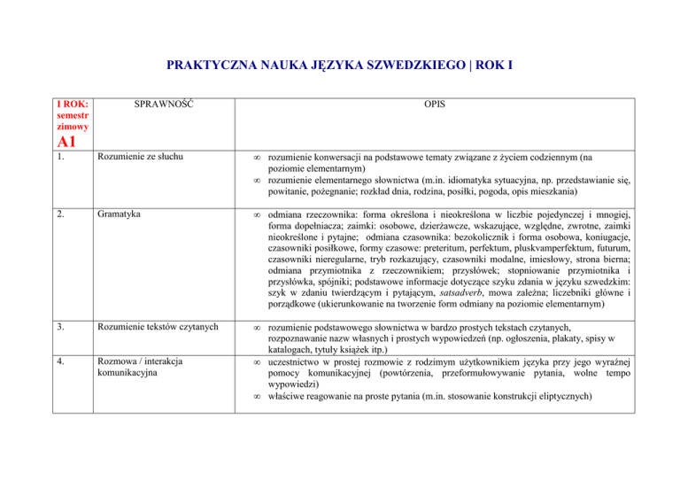 PRAKTYCZNA NAUKA JĘZYKA SZWEDZKIEGO | ROK I I ROK: semestr zimowy SPRAWNOŚĆ OPIS A1 1. Rozumienie ze słuchu • • rozumienie konwersacji na podstawowe tematy związane z Ŝyciem codziennym (na poziomie elementarnym) rozumienie elementarnego słownictwa (m.in. idiomatyka sytuacyjna, np. przedstawianie się, powitanie, poŜegnanie; rozkład dnia, rodzina, posiłki, pogoda, opis mieszkania) 2. Gramatyka • odmiana rzeczownika: forma określona i nieokreślona w liczbie pojedynczej i mnogiej, forma dopełniacza; zaimki: osobowe, dzierŜawcze, wskazujące, względne, zwrotne, zaimki nieokreślone i pytajne; odmiana czasownika: bezokolicznik i forma osobowa, koniugacje, czasowniki posiłkowe, formy czasowe: preteritum, perfektum, pluskvamperfektum, futurum, czasowniki nieregularne, tryb rozkazujący, czasowniki modalne, imiesłowy, strona bierna; odmiana przymiotnika z rzeczownikiem; przysłówek; stopniowanie przymiotnika i przysłówka, spójniki; podstawowe informacje dotyczące szyku zdania w języku szwedzkim: szyk w zdaniu twierdzącym i pytającym, satsadverb, mowa zaleŜna; liczebniki główne i porządkowe (ukierunkowanie na tworzenie form odmiany na poziomie elementarnym) 3. Rozumienie tekstów czytanych • 4. Rozmowa / interakcja komunikacyjna • rozumienie podstawowego słownictwa w bardzo prostych tekstach czytanych, rozpoznawanie nazw własnych i prostych wypowiedzeń (np. ogłoszenia, plakaty, spisy w katalogach, tytuły ksiąŜek itp.) uczestnictwo w prostej rozmowie z rodzimym uŜytkownikiem języka przy jego wyraźnej pomocy komunikacyjnej (powtórzenia, przeformułowywanie pytania, wolne tempo wypowiedzi) właściwe reagowanie na proste pytania (m.in. stosowanie konstrukcji eliptycznych) • 5. Prezentacja ustna • • prezentacja podstawowych informacji na własny temat kształtowanie prawidłowych nawyków wymowy szwedzkiej: staranne wymawianie poszczególnych głosek, akcent wyrazowy i zdaniowy 6. Produkcja tekstu • umiejętność sporządzania krótkich, prostych wypowiedzi pisemnych, np. wspomnienia z wakacji, wypełnianie prostych formularzy zawierających podstawowe informacje na własny temat 7. Wiedza o kulturze Szwecji • zaznajomienie studentów z podstawową wiedzą dotyczącą realiów, kultury i obyczajowości szwedzkiej waŜnym elementem nauki są przygotowania do uroczystości Św. Łucji (grudzień) • I ROK: semestr letni SPRAWNOŚĆ OPIS A2 1. Rozumienie ze słuchu • • • 2. Gramatyka • rozumienie konwersacji na podstawowe tematy związane z Ŝyciem codziennym rozumienie tekstu wypowiadanego w powolnym tempie, ukierunkowane na wydobywanie informacji na zadany temat rozumienie słownictwa (idiomatyka sytuacyjna, rozkład dnia i codzienne czynności, rodzina, praca, czas wolny, podróŜe, posiłki, pogoda, opis mieszkania, charakterystyka osób, zdrowie i choroba ) odmiana rzeczownika: forma określona i nieokreślona w liczbie pojedynczej i mnogiej, forma dopełniacza; zaimki: osobowe, dzierŜawcze, wskazujące, względne, zwrotne, zaimki nieokreślone i pytajne; odmiana czasownika: bezokolicznik i forma osobowa, koniugacje, czasowniki posiłkowe, formy czasowe i ich stosowanie: preteritum, perfektum, pluskvamperfektum, futurum, futurum preteriti, czasowniki nieregularne, tryb rozkazujący, czasowniki modalne, imiesłowy, strona bierna; odmiana przymiotnika z rzeczownikiem; przysłówek; stopniowanie przymiotnika i przysłówka, spójniki; podstawowe informacje dotyczące szyku zdania w języku szwedzkim: szyk w zdaniu twierdzącym i pytającym, głównym / pobocznym, satsadverb, mowa zaleŜna; liczebniki główne i porządkowe (na poziomie podstawowym) 3. Rozumienie tekstów czytanych • • • • rozumienie podstawowego słownictwa w tekstach czytanych, rozpoznawanie nazw własnych i prostych wypowiedzeń (krótkich tekstów, m.in. listów prywatnych, ogłoszeń) poprawne głośne odczytanie prostych tekstów umiejętność znalezienia w tekście potrzebnej informacji odpowiedź na pytania dotyczące tekstu 4. Rozmowa / interakcja komunikacyjna • • • uczestnictwo w prostej rozmowie z rodzimym uŜytkownikiem języka wymiana informacji na poziomie podstawowym właściwe reagowanie na proste pytania 5. Prezentacja ustna • prezentacja podstawowych informacji na własny temat (m.in. na temat rodziny, bliskiego otoczenia, warunków Ŝycia, wykształcenia, obowiązków) kształtowanie prawidłowych nawyków wymowy szwedzkiej: staranne wymawianie poszczególnych głosek, akcent wyrazowy i zdaniowy • 6. Produkcja tekstu • • • 7. Wiedza o kulturze Szwecji • • prace pisemne utrwalające omawiane słownictwo i struktury gramatyczne student potrafi sporządzić krótkie, proste teksty, np. list prywatny, opis mieszkania, charakterystyka osób, autoprezentacja zasady ortografii zaznajomienie studentów z podstawową wiedzą dotyczącą realiów, kultury i obyczajowości szwedzkiej waŜnym elementem nauki są przygotowania do obchodów święta Midsommar (czerwiec) Literatura: I rok R. Nyborg, N-O Pettersson Ballardini m fl U. Göransson, H. Lindholm P. Levy Scherrer, K. Lindemalm U. Göransson, M. Parada M. McShane P. Watcyn-Jones G. Hellström C. Fasth, A. Kannermark (A1 - A2) Svenska utifrån Mål 1 Nybörjarsvenska lärobok + övningsbok Rivstart textbok A1 + A2 Rivstart övningsbok På svenska! Svenska till max Bygg upp ditt ordförråd, del 1 Första övningsboken i svensk grammatik Form i fokus, del A, B DuŜa część zajęć prowadzona jest w oparciu o programy autorskie, sporządzone przez prowadzących.