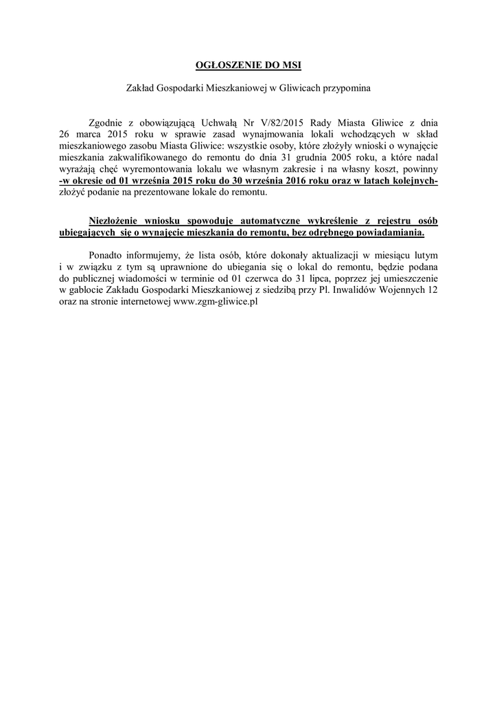 OGŁOSZENIE DO MSI Zakład Gospodarki Mieszkaniowej w Gliwicach przypomina Zgodnie z obowiązującą Uchwałą Nr V/82/2015 Rady Miasta Gliwice z dnia 26 marca 2015 roku w sprawie zasad wynajmowania lokali wchodzących w skład mieszkaniowego zasobu Miasta Gliwice: wszystkie osoby, które złożyły wnioski o wynajęcie mieszkania zakwalifikowanego do remontu do dnia 31 grudnia 2005 roku, a które nadal wyrażają chęć wyremontowania lokalu we własnym zakresie i na własny koszt, powinny -w okresie od 01 września 2015 roku do 30 września 2016 roku oraz w latach kolejnychzłożyć podanie na prezentowane lokale do remontu. Niezłożenie wniosku spowoduje automatyczne wykreślenie z rejestru osób ubiegających się o wynajęcie mieszkania do remontu, bez odrębnego powiadamiania. Ponadto informujemy, że lista osób, które dokonały aktualizacji w miesiącu lutym i w związku z tym są uprawnione do ubiegania się o lokal do remontu, będzie podana do publicznej wiadomości w terminie od 01 czerwca do 31 lipca, poprzez jej umieszczenie w gablocie Zakładu Gospodarki Mieszkaniowej z siedzibą przy Pl. Inwalidów Wojennych 12 oraz na stronie internetowej www.zgm-gliwice.pl