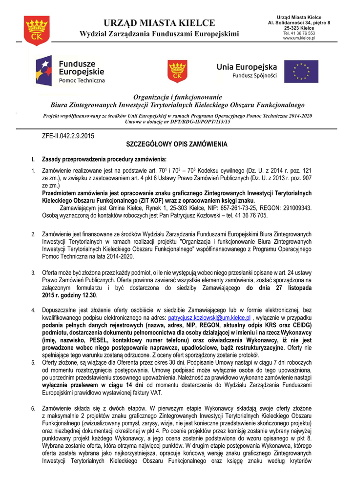ZFE-II.042.2.9.2015 SZCZEGÓŁOWY OPIS ZAMÓWIENIA I. Zasady przeprowadzenia procedury zamówienia: 1. Zamówienie realizowane jest na podstawie art. 701 i 703 – 705 Kodeksu cywilnego (Dz. U. z 2014 r. poz. 121 ze zm.), w związku z zastosowaniem art. 4 pkt 8 Ustawy Prawo Zamówień Publicznych (Dz. U. z 2013 r. poz. 907 ze zm.) Przedmiotem zamówienia jest opracowanie znaku graficznego Zintegrowanych Inwestycji Terytorialnych Kieleckiego Obszaru Funkcjonalnego (ZIT KOF) wraz z opracowaniem księgi znaku. Zamawiającym jest Gmina Kielce, Rynek 1, 25-303 Kielce, NIP: 657-261-73-25, REGON: 291009343. Osobą wyznaczoną do kontaktów roboczych jest Pan Patrycjusz Kozłowski – tel. 41 36 76 705. 2. Zamówienie jest finansowane ze środków Wydziału Zarządzania Funduszami Europejskimi Biura Zintegrowanych Inwestycji Terytorialnych w ramach realizacji projektu "Organizacja i funkcjonowanie Biura Zintegrowanych Inwestycji Terytorialnych Kieleckiego Obszaru Funkcjonalnego" współfinansowanego z Programu Operacyjnego Pomoc Techniczna na lata 2014-2020. 3. Oferta może być złożona przez każdy podmiot, o ile nie występują wobec niego przesłanki opisane w art. 24 ustawy Prawo Zamówień Publicznych. Oferta powinna zawierać wszystkie elementy zamówienia, zostać sporządzona na załączonym formularzu i być dostarczona do siedziby Zamawiającego do dnia 27 listopada 2015 r. godziny 12.30. 4. Dopuszczalne jest złożenie oferty osobiście w siedzibie Zamawiającego lub w formie elektronicznej, bez kwalifikowanego podpisu elektronicznego na adres: [email protected] , wyłącznie w przypadku podania pełnych danych rejestrowych (nazwa, adres, NIP, REGON, aktualny odpis KRS oraz CEIDG) podmiotu, dostarczenia dokumentu pełnomocnictwa dla osoby działającej w imieniu i na rzecz Wykonawcy (imię, nazwisko, PESEL, kontaktowy numer telefonu) oraz oświadczenia Wykonawcy, iż nie jest prowadzone wobec niego postępowanie naprawcze, upadłościowe, bądź restrukturyzacyjne. Oferty nie spełniające tego warunku zostaną odrzucone. Z oceny ofert sporządzony zostanie protokół. Oferty złożone, są wiążące dla Oferenta przez okres 30 dni. Podpisanie Umowy nastąpi w ciągu 7 dni roboczych od momentu rozstrzygnięcia postępowania. Umowę podpisać może wyłącznie osoba do tego upoważniona, po uprzednim przedstawieniu stosownego upoważnienia. Należność za prawidłowo wykonane zamówienie nastąpi wyłącznie przelewem w ciągu 14 dni od momentu dostarczenia do Wydziału Zarządzania Funduszami Europejskimi prawidłowo wystawionej faktury VAT. 5. 6. Zamówienie składa się z dwóch etapów. W pierwszym etapie Wykonawcy składają swoje oferty złożone z maksymalnie 2 projektów znaku graficznego Zintegrowanych Inwestycji Terytorialnych Kieleckiego Obszaru Funkcjonalnego (zwizualizowany pomysł, zarysy, wizje, nie jest konieczne przedstawienie skończonego projektu) oraz niezbędnej dokumentacji określonej w pkt 4. Po ocenie projektów przez komisję zostanie wybrany najwyżej punktowany projekt każdego Wykonawcy, a jego ocena zostanie podstawiona do wzoru opisanego w pkt 8. Wybrana zostanie oferta, która otrzyma najwięcej punktów. W drugim etapie postępowania Wykonawca, którego oferta została wybrana jako najkorzystniejsza, opracuje końcową wersję znaku graficznego Zintegrowanych Inwestycji Terytorialnych Kieleckiego Obszaru Funkcjonalnego oraz księgę znaku według kryteriów zamieszczonych w Szczegółowym Opisie Zamówienia na bieżąco konsultując proces tworzenia z Zamawiającym. Przedmiot Zamówienia zostanie dostarczony do siedziby Zamawiającego w ciągu 7 dni roboczych od dnia podpisania Umowy. 7. Komisja będzie składać się z 4 członków, z których każdy będzie wystawiał ocenę w skali od 0 do 10 punktów w zakresie estetyki, czytelności, prezentacji, łatwości zapadania w pamięć oraz nawiązywania do idei Zintegrowanych Inwestycji Terytorialnych Kieleckiego Obszaru Funkcjonalnego. Suma ocen komisji może osiągnąć maksymalnie 40 punktów. 8. Kryterium wyboru jest: o w 30% cena określona dla całości zamówienia, o w 70% ocena komisji dotycząca najlepiej ocenionego projektu wybranego Wykonawcy. Wybrana zostanie oferta, która uzyska najwięcej punktów wyliczonych wg poniższego wzoru: 𝑂 𝐶𝑚𝑎𝑥 − 𝐶𝑜 ( ∗ 70) + (( ) ∗ 30) 40 𝐶𝑚𝑎𝑥 − 𝐶𝑚𝑖𝑛 gdzie: O – suma punktów uzyskanych z oceny najwyżej punktowanego projektu danego Wykonawcy, Co – cena ocenianej oferty, Cmin – najniższa cena ze wszystkich ofert, Cmax – najwyższa cena ze wszystkich ofert. 9. Oferowana cena obejmuje wszelkie koszty związane z opracowaniem projektu oraz końcowej wersji znaku graficznego Zintegrowanych Inwestycji Terytorialnych Kieleckiego Obszaru Funkcjonalnego wraz z opracowaniem księgi znaku, w tym również koszty dostawy do siedziby Zamawiającego: Urząd Miasta Kielce, Wydział Zarządzania Funduszami Europejskimi, Aleja Solidarności 34, 25-323 Kielce pok. 800. 10. Odbiór przedmiotu zamówienia nastąpi poprzez podpisanie protokołu odbioru. Za termin wykonania zamówienia uznaje się datę podpisania protokołu odbioru. 11. Z chwilą zapłaty (rozumianej jako dzień obciążenia rachunku Zamawiającego) wynagrodzenia Wykonawca przenosi na Zamawiającego, bez dodatkowego wynagrodzenia, całość autorskich praw majątkowych do nieograniczonego w czasie korzystania i rozporządzania zamówionym znakiem graficznym oraz nośników na jakich został utrwalony, w kraju i za granicą, na następujących polach eksploatacji: a) utrwalania i zwielokrotniania jakąkolwiek znaną techniką oraz rozpowszechnianie w dowolnej formie dającej możliwość zapoznania się z Przedmiotem Umowy; b) obrotu oryginałem albo egzemplarzami, na których utrwalono Przedmiot Zamówienia, wprowadzanie go do obrotu, użyczenie lub najem oryginału albo egzemplarzy; c) publicznego wystawienia, wyświetlenia, odtworzenia oraz nadawania