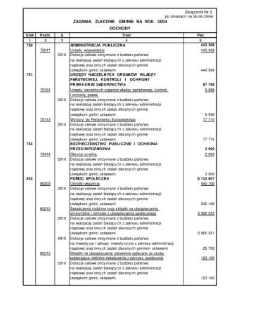 Zał cznik Nr 3 po zmianach na 26.08.2004r. ZADANIA ZLECONE GMINIE NA ROK 2004 DOCHODY Dział Rozdz. § Tre 1 2 3 4 750 75011 2010 751 75101 2010 75113 2010 754 75414 2010 852 85203 2010 85212 2010 6310 85213 2010 ADMINISTRACJA PUBLICZNA Urz dy wojewódzkie Dotacje celowe otrzy mane z bud etu pa stwa na realizacj zada bie cy ch z zakresu administracji rz dowej oraz inny ch zada zlecony ch gminie (zwi zkom gmin) ustawami URZ DY NACZELNYCH ORGANÓW WŁADZY PA STWOWEJ, KONTROLI I OCHRONY PRAWA ORAZ S DOWNICTWA Urz dy naczelny ch organów władzy pa stwowej, kontroli i ochrony prawa Dotacje celowe otrzy mane z bud etu pa stwa na realizacj zada bie cy ch z zakresu administracji rz dowej oraz inny ch zada zlecony ch gminie (zwi zkom gmin) ustawami Wy bory do Parlamentu Europejskiego Dotacje celowe otrzy mane z bud etu pa stwa na realizacj zada bie cy ch z zakresu administracji rz dowej oraz inny ch zada zlecony ch gminie (zwi zkom gmin) ustawami BEZPIECZE STWO PUBLICZNE I OCHRONA PRZECIWPO AROWA Obrona cy wilna Dotacje celowe otrzy mane z bud etu pa stwa na realizacj zada bie cy ch z zakresu administracji rz dowej oraz inny ch zada zlecony ch gminie (zwi zkom gmin) ustawami POMOC SPOŁECZNA O rodki wsparcia Dotacje celowe otrzy mane z bud etu pa stwa na realizacj zada bie cy ch z zakresu administracji rz dowej oraz inny ch zada zlecony ch gminie (zwi zkom gmin) ustawami wiadczenia rodzinne oraz składki na ubezpieczenia emery talne i rentowe z ubezpieczenia społecznego Dotacje celowe otrzy mane z bud etu pa stwa na realizacj zada bie cy ch z zakresu administracji rz dowej oraz inny ch zada zlecony ch gminie (zwi zkom gmin) ustawami Dotacje celowe otrzy mane z bud etu pa stwa na inwesty cje i zakupy inwesty cy jne z zakresu administracji rz dowej oraz inny ch zada zlecony ch gminom ustawami Składki na ubezpieczenie zdrowotne opłacane za osoby pobierajace niektóre wiadczenia z pomocy społecznej Dotacje celowe otrzy mane z bud etu pa stwa na realizacj zada bie cy ch z zakresu administracji rz dowej oraz inny ch zada zlecony ch gminie (zwi zkom gmin) ustawami Plan 5 443 308 443 308 443 308 87 708 9 998 9 998 77 710 77 710 3 000 3 000 3 000 6 133 607 540 100 540 100 3 926 023 3 900 321 25 702 123 100 123 100 1 2 3 4 85214 2010 85216 2010 85219 2010 85278 2010 900 90015 2010 Zasiłki i pomoc w naturze oraz składki na ubezpieczenia społeczne Dotacje celowe otrzy mane z bud etu pa stwa na realizacj zada bie cy ch z zakresu administracji rz dowej oraz inny ch zada zlecony ch gminie (zwi zkom gmin) ustawami Zasiłki rodzinne, piel gnacy jne i wy chowawcze Dotacje celowe otrzy mane z bud etu pa stwa na realizacj zada bie cy ch z zakresu administracji rz dowej oraz inny ch zada zlecony ch gminie (zwi zkom gmin) ustawami O rodki pomocy społecznej Dotacje celowe otrzy mane z bud etu pa stwa na realizacj zada bie cy ch z zakresu administracji rz dowej oraz inny ch zada zlecony ch gminie (zwi zkom gmin) ustawami Usuwanie skutków kl sk y wiołowy ch Dotacje celowe otrzy mane z bud etu pa stwa na realizacj zada bie cy ch z zakresu administracji rz dowej oraz inny ch zada zlecony ch gminie (zwi zkom gmin) ustawami GOSPODARKA KOMUNALNA I OCHRONA RODOWISKA O wietlenie ulic, placów i dróg Dotacje celowe otrzy mane z bud etu pa stwa na realizacj zada bie cy ch z zakresu administracji rz dowej oraz inny ch zada zlecony ch gminie (zwi zkom gmin) ustawami DOTACJE OGÓŁEM 750 75011 0690 ADMINISTRACJA PUBLICZNA Urz dy wojewódzkie Wpły wy z ró ny ch opłat DOCHODY BUD ETU PA STWA DOCHODY OGÓŁEM 5 774 200 774 200 17 200 17 200 749 000 749 000 3 984 3 984 228 513 228 513 228 513 6 896 136 205 000 205 000 205 000 205 000 7 101 136 ZADANIA ZLECONE GMINIE NA ROK 2004 WYDATKI w złotych Dział Rozdz. § Tre 1 2 3 4 750 75011 751 4010 4040 4110 4120 4210 4260 4300 4410 4440 75101 4010 4110 4120 75113 3030 4110 4120 4210 4300 4410 754 75414 4110 4120 4210 4300 852 85203 3020 4010 4040 4110 4120 4210 4220 4230 4260 4270 4280 4300 4410 4430 4440 4480 4520 ADMINISTRACJA PUBLICZNA Urz dy wojewódzkie Wy nagrodzenia osobowe pracowników Dodatkowe wy nagrodzenie roczne Składki na ubezpieczenia społeczne Skladki na Fundusz Pracy Zakup materiałów i wy posa enia Zakup energii Zakup usług pozostały ch Podró e slu bowe krajowe Odpisy na zakładowy f undusz wiadcze socjalny ch URZ DY NACZELNYCH ORGANÓW WŁADZY PA STWOWEJ, KONTROLI I OCHRONY PRAWA ORAZ S DOWNICTWA Urz dy naczelny ch organów władzy pa stwowej, kontroli i ochrony prawa Wy nagrodzenia osobowe pracowników Składki na ubezpieczenia społeczne Składki na Fundusz Pracy Wy bory do Parlamentu Europejskiego Ró ne wy datki na rzecz osób f izy czny ch Składki na ubezpieczenia społeczne Składki na Fundusz Pracy Zakup materiałów i wy posa enia Zakup usług pozostały ch Podró e slu bowe krajowe BEZPIECZE STWO PUBLICZNE I OCHRONA PRZECIWPO AROWA Obrona cy wilna Składki na ubezpieczenia społeczne Składki na Fundusz Pracy Zakup materiałów i wy posa enia Zakup usług pozostały ch POMOC SPOŁECZNA O rodki wsparcia Nagrody i wy datki osobowe nie zaliczone do wy nagrodze Wy nagrodzenia osobowe pracowników Dodatkowe wy nagrodzenie roczne Składki na ubezpieczenia społeczne Składki na Fundusz Pracy Zakup materiałów i wy posa enia Zakup rodków y wno ci Zakup leków i materiałów medy czny ch Zakup energii Zakup usług remontowy ch Zakup usług zdrowotny ch Zakup usług pozostały ch Podró e slu bowe krajowe Ró ne opłaty i składki Opisy na zakładowy f undusz swiadcze socjalny ch Podatek od nieruchomo ci Opłaty na rzecz bud etów jednostek samorz du tery torialnego Plan 5 443 308 443 308 307 600 17 700 58 100 8 008 16 900 6 000 19 000 500 9 500 87 708 9 998 8 300 1 490 208 77 710 49 280 1 746 249 6 100 19 223 1 112 3 000 3 000 121 17 0 2 862 6 133 607 540 100 500 334 900 22 000 63 000 8 700 8 500 700 600 19 000 5 000 12 000 35 000 600 7 800 11 600 3 900 6 300 1 2 3 85212 3110 4010 4110 4120 4130 4210 4270 4300 4410 4430 4440 6060 85213 4130 85214