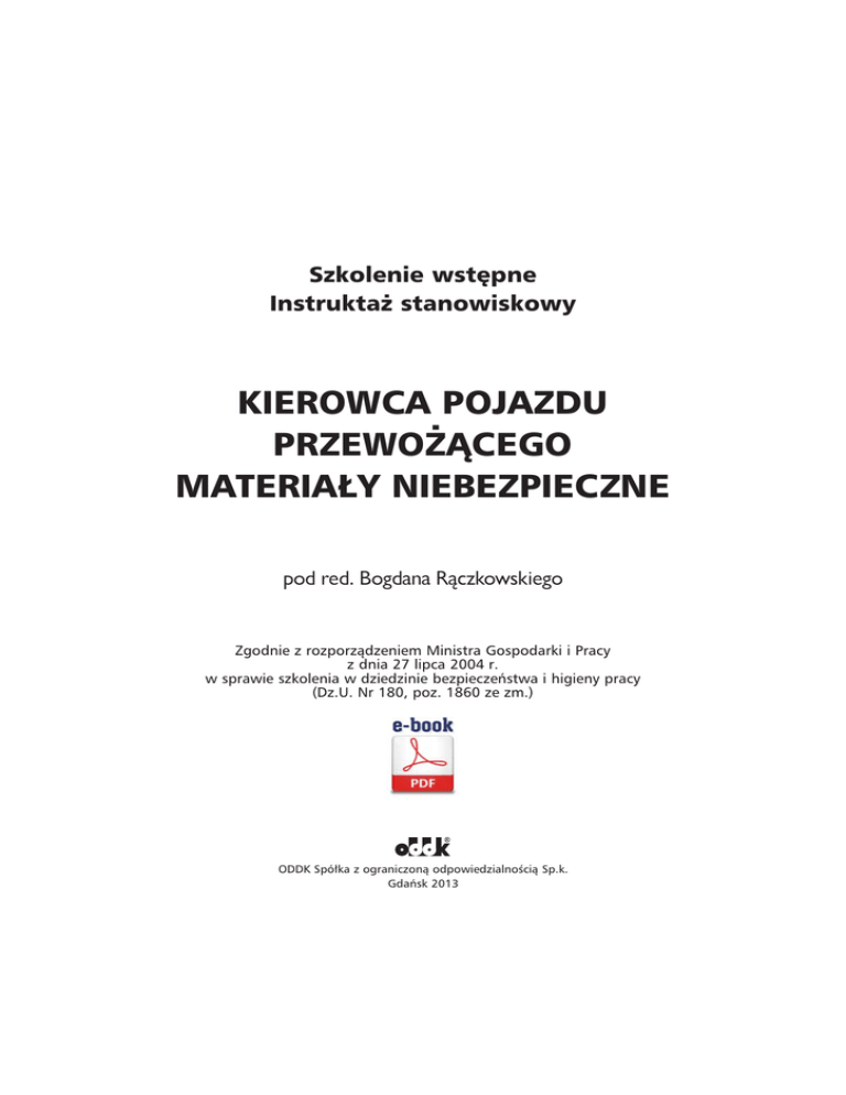 (C) Plik jest własnością ODDK Spółka z ograniczoną odpowiedzialnością Sp.k., kwiecień 2013, ISBN 978-83-7804-439-0 Szkolenie wstępne Instruktaż stanowiskowy KIEROWCA POJAZDU PRZEWOŻĄCEGO MATERIAŁY NIEBEZPIECZNE pod red. Bogdana Rączkowskiego Zgodnie z rozporządzeniem Ministra Gospodarki i Pracy z dnia 27 lipca 2004 r. w sprawie szkolenia w dziedzinie bezpieczeństwa i higieny pracy (Dz.U. Nr 180, poz. 1860 ze zm.) ODDK Spółka z ograniczoną odpowiedzialnością Sp.k. Gdańsk 2013 Copyright by ODDK Spółka z ograniczoną odpowiedzialnością Sp.k. (C) Plik jest własnością ODDK Spółka z ograniczoną odpowiedzialnością Sp.k., kwiecień 2013, ISBN 978-83-7804-439-0 B. Rączkowski, Instruktaż stanowiskowy. Kierowca pojazdu przewożącego... SPIS TREŚCI Wprowadzenie. . . . . . . . . . . . . . . . . . . . . . . . . . . . . . . . . . . . . . . . . . . . . . . . . . . . . . 4 Instruktaż stanowiskowy – zasady ogólne. . . . . . . . . . . . . . . . . . . . . . . . . . . . . 5 Ramowy program instruktażu stanowiskowego . . . . . . . . . . . . . . . . . . . . . . . . 8 Szczegółowy program szkolenia . . . . . . . . . . . . . . . . . . . . . . . . . . . . . . . . . . . . 9 Szczegółowy program szkolenia na stanowisku pracy kierowca pojazdu przewożącego materiały niebezpieczne Wymagania szczegółowe dotyczące warunków pracy i zasady bezpiecznej pracy . . . . . . . . . . . . . . . . . . . . . . . . . . . . . . . . . . . . . . . . . . . 14 Podstawowe wymogi bezpiecznej pracy kierowcy i pracowników zatrudnionych przy przewozie . . . . . . . . . . . . . . . . . . . . . . . . . . . . . . . . . . . . . . . . 30 Zagrożenia na stanowisku pracy i sposoby ochrony przed zagrożeniami. Sprzęt ochrony osobistej . . . . . . . . . . . . . . . . . . . . . . . . . . . . . . . . . . . . . . . . . . . . . 43 Przepisy prawne . . . . . . . . . . . . . . . . . . . . . . . . . . . . . . . . . . . . . . . . . . . . . . . . . . . 45 Polskie Normy . . . . . . . . . . . . . . . . . . . . . . . . . . . . . . . . . . . . . . . . . . . . . . . . . 47 Copyright by ODDK Spółka z ograniczoną odpowiedzialnością Sp.k. 3