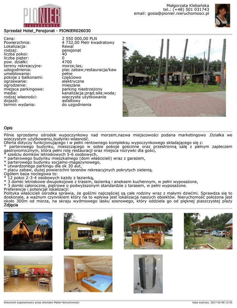 Małgorzata Klebańska tel.: (+48) 501 031743 email: [email protected] Sprzedaż Hotel_Pensjonat - PIONIER026030 Cena: Powierzchnia: Lokalizacja: rodzaj: liczba pokoi: liczba pięter: pow. działki: tereny rekreacyjne: udogodnienia: umeblowanie: pokoje z balkonami: ogrzewanie: ogrodzenie: miejsca parkingowe: media: rodzaj własności: dojazd: termin wydania: 2 550 000,00 PLN 4 732,00 Metr kwadratowy Rewal pensjonat 40 0 4700 morze;las; plac zabaw;restauracja/kawiarnia; pełne częściowo elektryczne mieszane parking niestrzeżony kanalizacja;prąd;siła;woda; wieczyste użytkowanie asfaltowy do uzgodnienia Opis Pilnie sprzedamy ośrodek wypoczynkowy nad morzem,nazwa miejscowości podana marketingowo .Działka we wieczystym użytkowaniu,budynki-wlasność. Oferta dotyczy funkcjonującego i w pełni rentownego kompleksu wypoczynkowego składającego się z: * parterowego budynku, mieszczącego w sobie pokoje gościnne oraz przestronną salę z pełnym zapleczem gastronomicznym, która pełni rolę restauracji oraz miejsca rozrywki dla gości, * sześciu domków letniskowych 5-6 osobowych, * parterowego budynku mieszkalnego (dom właścicieli) wraz z garażem, * parterowego budynku socjalno-magazynowego, * utwardzonego parkingu dla ok 30 aut, * placu zabaw, dużej powierzchni terenów rekreacyjnych pokrytych zielenią. Ogółem baza noclegowa to: * 12 pokoi 2-3-4 osobowych każdy z łazienką, * 3 domki letniskowe dwupokojowe z trasem, łazienką i aneksem kuchennym, w pełni wyposażone, * 3 domki całoroczne, piętrowe o podwyższonym standardzie z tarasem, w pełni wyposażone. Preferencje i potencjał lokalizacji: Polityka właścicieli ośrodka sprawia, że gośćmi najczęściej są całe rodziny wraz z małymi dziećmi. Sprawdza się to doskonale, a ważnym czynnikiem który na to wpływa jest lokalizacja naszych obiektów. Nieruchomość położona jest około 300m od morza, na skraju wydmowego lasku sosnowego, który oddziela go od pięknej piaszczystej plaży Zdjęcia Dokument wygenerowany przez eKomako Makler Nieruchomości Data wydruku: 2017-03-08 13:55