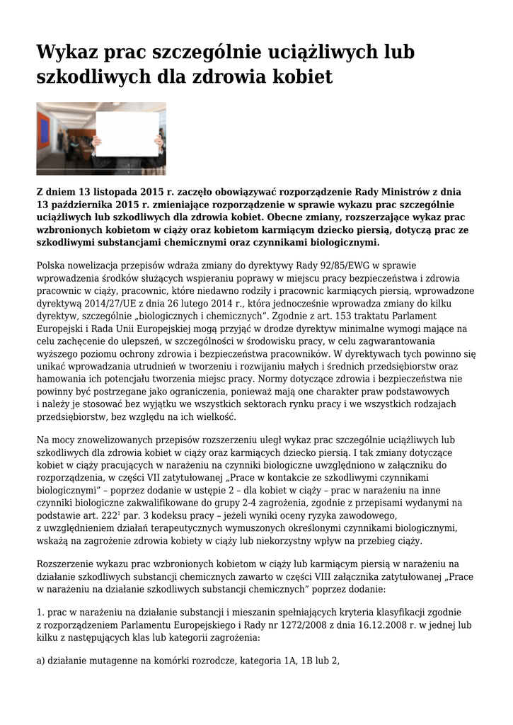 Wykaz prac szczególnie uciążliwych lub szkodliwych dla zdrowia kobiet Z dniem 13 listopada 2015 r. zaczęło obowiązywać rozporządzenie Rady Ministrów z dnia 13 października 2015 r. zmieniające rozporządzenie w sprawie wykazu prac szczególnie uciążliwych lub szkodliwych dla zdrowia kobiet. Obecne zmiany, rozszerzające wykaz prac wzbronionych kobietom w ciąży oraz kobietom karmiącym dziecko piersią, dotyczą prac ze szkodliwymi substancjami chemicznymi oraz czynnikami biologicznymi. Polska nowelizacja przepisów wdraża zmiany do dyrektywy Rady 92/85/EWG w sprawie wprowadzenia środków służących wspieraniu poprawy w miejscu pracy bezpieczeństwa i zdrowia pracownic w ciąży, pracownic, które niedawno rodziły i pracownic karmiących piersią, wprowadzone dyrektywą 2014/27/UE z dnia 26 lutego 2014 r., która jednocześnie wprowadza zmiany do kilku dyrektyw, szczególnie „biologicznych i chemicznych”. Zgodnie z art. 153 traktatu Parlament Europejski i Rada Unii Europejskiej mogą przyjąć w drodze dyrektyw minimalne wymogi mające na celu zachęcenie do ulepszeń, w szczególności w środowisku pracy, w celu zagwarantowania wyższego poziomu ochrony zdrowia i bezpieczeństwa pracowników. W dyrektywach tych powinno się unikać wprowadzania utrudnień w tworzeniu i rozwijaniu małych i średnich przedsiębiorstw oraz hamowania ich potencjału tworzenia miejsc pracy. Normy dotyczące zdrowia i bezpieczeństwa nie powinny być postrzegane jako ograniczenia, ponieważ mają one charakter praw podstawowych i należy je stosować bez wyjątku we wszystkich sektorach rynku pracy i we wszystkich rodzajach przedsiębiorstw, bez względu na ich wielkość. Na mocy znowelizowanych przepisów rozszerzeniu uległ wykaz prac szczególnie uciążliwych lub szkodliwych dla zdrowia kobiet w ciąży oraz karmiących dziecko piersią. I tak zmiany dotyczące kobiet w ciąży pracujących w narażeniu na czynniki biologiczne uwzględniono w załączniku do rozporządzenia, w części VII zatytułowanej „Prace w kontakcie ze szkodliwymi czynnikami biologicznymi” – poprzez dodanie w ustępie 2 – dla kobiet w ciąży – prac w narażeniu na inne czynniki biologiczne zakwalifikowane do grupy 2-4 zagrożenia, zgodnie z przepisami wydanymi na podstawie art. 2221 par. 3 kodeksu pracy – jeżeli wyniki oceny ryzyka zawodowego, z uwzględnieniem działań terapeutycznych wymuszonych określonymi czynnikami biologicznymi, wskażą na zagrożenie zdrowia kobiety w ciąży lub niekorzystny wpływ na przebieg ciąży. Rozszerzenie wykazu prac wzbronionych kobietom w ciąży lub karmiącym piersią w narażeniu na działanie szkodliwych substancji chemicznych zawarto w części VIII załącznika zatytułowanej „Prace w narażeniu na działanie szkodliwych substancji chemicznych” poprzez dodanie: 1. prac w narażeniu na działanie substancji i mieszanin spełniających kryteria klasyfikacji zgodnie z rozporządzeniem Parlamentu Europejskiego i Rady nr 1272/2008 z dnia 16.12.2008 r. w jednej lub kilku z następujących klas lub kategorii zagrożenia: a) działanie mutagenne na komórki rozrodcze, kategoria 1A, 1B lub 2, b) rakotwórczość, kat. 1A, 1B lub 2, c) działanie szkodliwe na rozrodczość, kat. 1A, 1B lub 2, d) działanie toksyczne na narządy docelowe – narażenie jednorazowe, kat. 1 lub 2, 2. prac w narażeniu na niżej wymienione substancje chemiczne niezależnie od ich stężenia w środowisku pracy: a) czynniki chemiczne o znanym i niebezpiecznym wchłanianiu przez skórę, b) leki cytostatyczne, c) mangan, d) styren, e) syntetyczne estrogeny i progesterony, f) tlenek węgla, g) ołów i jego związki organiczne i nieorganiczne, h) rtęć i jej związki organiczne i nieorganiczne, 3. prac w narażeniu na działanie rozpuszczalników organicznych, jeżeli ich stężenie w środowisku pracy przekracza wartości 1/3 najwyższych dopuszczalnych stężeń, 4. prac lub procesów technologicznych, w których dochodzi do uwalniania substancji chemicznych, ich mieszanin lub czynników o działaniu rakotwórczym lub mutagennym, wymienionych w ust. 2 załącznika nr 1 do rozporządzenia ministra zdrowia z dnia 24 lipca 2012 r. w sprawie substancji chemicznych, ich mieszanin, czynników lub procesów technologicznych o działaniu rakotwórczym lub mutagennym w środowisku pracy. W powyższych zmianach przypomina się o ocenie ryzyka zawodowego, której konieczność wynika z art. 226 kodeksu pracy, nakazującego pracodawcy oceniać i dokumentować ryzyko zawodowe związane z wykonywaną pracą oraz stosować niezbędne środki profilaktyczne je zmniejszające. Ponadto pracodawca musi informować pracowników o ryzyku zawodowym oraz o zasadach ochrony przed zagrożeniami. Powyższa nowelizacja może też oznaczać konieczność zmian w regulaminach pracy. Pracodawca ma bowiem obowiązek opracować i ująć w regulaminie wykaz prac wzbronionych kobietom, który w związku z nowelizacją przepisu może ulec zmianie. Iwona Pawlaczyk fot. pixabay.com