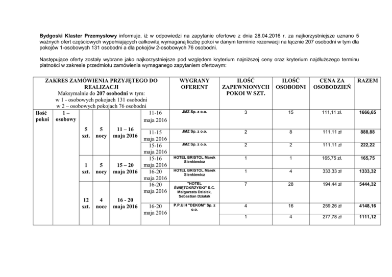 Bydgoski Klaster Przemysłowy informuje, iż w odpowiedzi na zapytanie ofertowe z dnia 28.04.2016 r. za najkorzystniejsze uznano 5 ważnych ofert częściowych wypełniających całkowitą wymaganą liczbę pokoi w danym terminie rezerwacji na łącznie 207 osobodni w tym dla pokojów 1-osobowych 131 osobodni a dla pokojów 2-osobowych 76 osobodni. Następujące oferty zostały wybrane jako najkorzystniejsze pod względem kryterium najniższej ceny oraz kryterium najdłuższego terminu płatności w zakresie przedmiotu zamówienia wymaganego zapytaniem ofertowym: ZAKRES ZAMÓWIENIA PRZYJĘTEGO DO REALIZACJI Maksymalnie do 207 osobodni w tym: w 1 - osobowych pokojach 131 osobodni w 2 – osobowych pokojach 76 osobodni 11-16 Ilość 1– pokoi osobowy maja 2016 5 szt. 1 szt. 12 szt. 5 nocy 5 nocy 4 noce 11 – 16 maja 2016 15 – 20 maja 2016 16 - 20 maja 2016 11-15 maja 2016 15-16 maja 2016 15-16 maja 2016 16-20 maja 2016 16-20 maja 2016 16-20 maja 2016 WYGRANY OFERENT ILOŚĆ ZAPEWNIONYCH POKOI W SZT. ILOŚĆ OSOBODNI CENA ZA OSOBODZIEŃ RAZEM JMZ Sp. z o.o. 3 15 111,11 zł. 1666,65 JMZ Sp. z o.o. 2 8 111,11 zł 888,88 JMZ Sp. z o.o. 2 2 111,11 zł 222,22 HOTEL BRISTOL Marek Sienkiewicz 1 1 165,75 zł. 165,75 HOTEL BRISTOL Marek Sienkiewicz 1 4 333,33 zł 1333,32 "HOTEL ŚWIĘTOKRZYSKI" S.C. Małgorzata Działak, Sebastian Działak 7 28 194,44 zł 5444,32 P.P.U.H "DEKOM" Sp. z o.o. 4 16 259,26 zł 4148,16 1 4 277,78 zł 1111,12 7 szt. 2 szt. 1 szt. 1 szt. 1 szt. 5 szt. 2osobowy 7 szt. 5 nocy 16 - 21 maja 2016 1 17 – 18 noc maja 2016 3 17 – 20 noce maja 2016 2 18 - 20 noce maja 2016 1 19 - 20 noc maja 2016 2 21 - 23 noce maja 2016 131 osobodni 4 noce 16 - 20 maja 2016 16-20 maja 2016 JMZ Sp. z o.o. 5 20 185,19 zł. 3703,8 20-21 maja 2016 16-17 maja 2016 17 – 20 maja 2016 20-21 maja 2016 16-20 MAJA 2016 20-21 maja 2016 17 – 18 maja 2016 17 – 20 maja 2016 18 - 20 maja 2016 19 - 20 maja 2016 21 - 23 maja 2016 JMZ Sp. z o.o. 5 5 111,11 zł 555,55 JMZ Sp. z o.o. 1 1 185,19 zł. 185,19 JMZ Sp. z o.o. 1 3 185,19 zł 555,57 JMZ Sp. z o.o. 1 1 111,11 zł. 111,11 JMZ Sp. z o.o. 1 4 185,19 zł. 740,76 JMZ Sp. z o.o. 1 1 111,11 zł 111,11 JMZ Sp. z o.o. 2 2 185,19 zł 370,38 JMZ Sp. z o.o. 1 3 185,19 zł 555,57 D&J TFT Sp. z o.o. 1 2 277,78 zł 555,56 HOTEL BRISTOL Marek Sienkiewicz 1 1 333,33 zł 333,33 JMZ Sp. z o.o. 5 10 111,11 zł 1111,1 129,63 zł 3111,12 RAZEM 16 - 20 maja 2016 JMZ Sp. z o.o. 131 3 24 16 - 20 maja 2016 1 szt. 3 szt. 1 noc 3 noce 16 – 17 maja 2016 17 - 20 maja 2016 16 – 17 maja 2016 17 - 20 maja 2016 17 - 20 maja 2016 "HOTEL ŚWIĘTOKRZYSKI" S.C. Małgorzata Działak, Sebastian Działak JMZ Sp. z o.o. 4 32 125,00 zł 4000 1 2 129,63 zł 259,26 D&J TFT Sp. z o.o. 1 6 185,19 zł 1111,14 "HOTEL ŚWIĘTOKRZYSKI" S.C. Małgorzata Działak, Sebastian Działak 2 12 125,00 zł 1500 76 osobodni RAZEM 76 Dokonano wyboru oferta częściowych na łączną wartość: 1. "HOTEL ŚWIĘTOKRZYSKI" S.C. Małgorzata Działak, Sebastian Działak – 72 osobodni za cenę 10 944,44 zł netto 2. D&J TFT Sp. z o.o. – 8 osobodni za cenę 1 666,57 zł netto 3. JMZ Sp. z o.o. – 101 osobodni za cenę 4. HOTEL BRISTOL Marek Sienkiewicz – 6 osobodni za cenę 1 832,41 zł netto 5. P.P.U.H "DEKOM" Sp. z o.o. – 20 osobodni za cenę 5 259,26 zł netto 14 148,15 zł netto Razem całkowita wartość zamówienia za 207 osobodni wynosi 33 850,83 zł netto. Ze względu na różnicę 14 groszy przy zaokrągleniach wartości netto w przeliczeniu na 1 osobodzień do zamówień przyjęto wartość całkowitą ofert częściowych netto wyliczoną przez Wykonawców w ofertach. Z wybranymi oferentami zostaną podpisane zlecenia realizacji usług hotelowych.