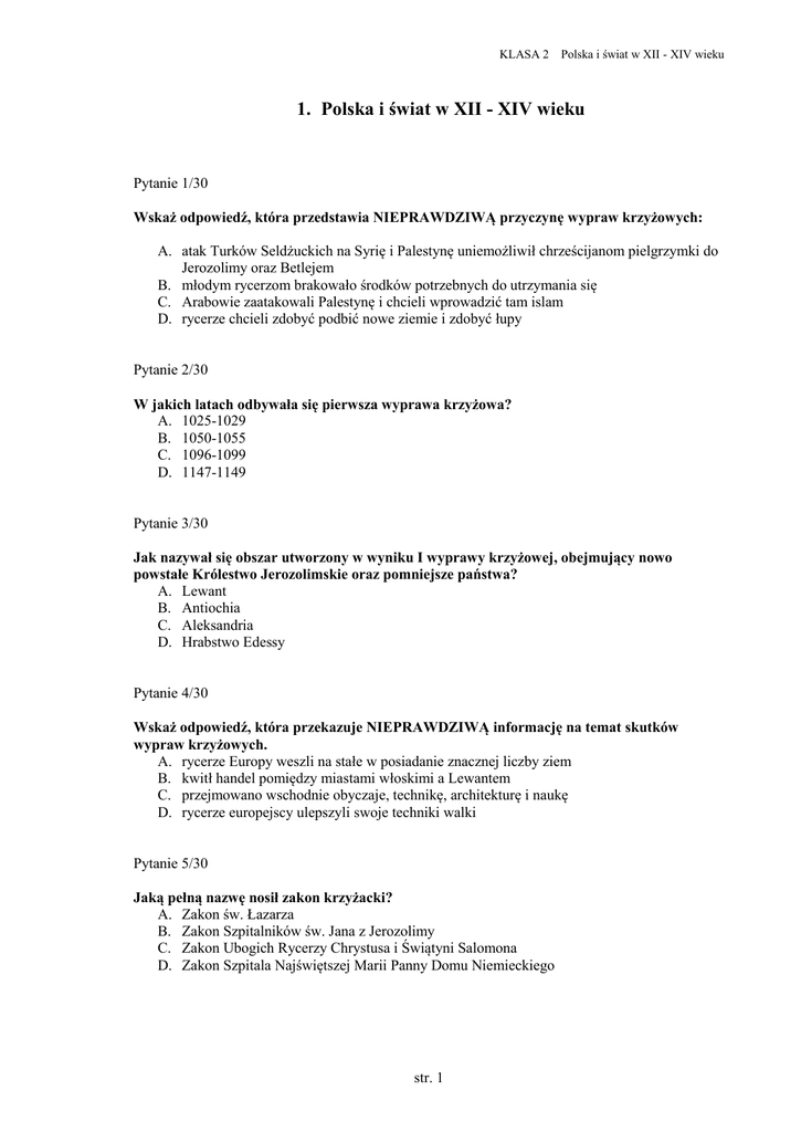 KLASA 2 Polska i świat w XII - XIV wieku 1. Polska i świat w XII - XIV wieku Pytanie 1/30 Wskaż odpowiedź, która przedstawia NIEPRAWDZIWĄ przyczynę wypraw krzyżowych: A. atak Turków Seldżuckich na Syrię i Palestynę uniemożliwił chrześcijanom pielgrzymki do Jerozolimy oraz Betlejem B. młodym rycerzom brakowało środków potrzebnych do utrzymania się C. Arabowie zaatakowali Palestynę i chcieli wprowadzić tam islam D. rycerze chcieli zdobyć podbić nowe ziemie i zdobyć łupy Pytanie 2/30 W jakich latach odbywała się pierwsza wyprawa krzyżowa? A. 1025-1029 B. 1050-1055 C. 1096-1099 D. 1147-1149 Pytanie 3/30 Jak nazywał się obszar utworzony w wyniku I wyprawy krzyżowej, obejmujący nowo powstałe Królestwo Jerozolimskie oraz pomniejsze państwa? A. Lewant B. Antiochia C. Aleksandria D. Hrabstwo Edessy Pytanie 4/30 Wskaż odpowiedź, która przekazuje NIEPRAWDZIWĄ informację na temat skutków wypraw krzyżowych. A. rycerze Europy weszli na stałe w posiadanie znacznej liczby ziem B. kwitł handel pomiędzy miastami włoskimi a Lewantem C. przejmowano wschodnie obyczaje, technikę, architekturę i naukę D. rycerze europejscy ulepszyli swoje techniki walki Pytanie 5/30 Jaką pełną nazwę nosił zakon krzyżacki? A. Zakon św. Łazarza B. Zakon Szpitalników św. Jana z Jerozolimy C. Zakon Ubogich Rycerzy Chrystusa i Świątyni Salomona D. Zakon Szpitala Najświętszej Marii Panny Domu Niemieckiego str. 1 KLASA 2 Polska i świat w XII - XIV wieku Pytanie 6/30 Bolesław Krzywousty w celu zachowania jedności państwa podzielił je pomiędzy swoich synów. Testament wszedł w życie po jego śmierci. W którym roku zmarł Bolesław Krzywousty? A. 1100 r. B. 1138 r. C. 1154 r. D. 1162 r. Pytanie 7/30 Jakie były postanowienia zjazdu w Łęczycy, który odbył się w 1180 roku? A. uznano, że władzę senioralną powinien objąć Mieszko Stary B. uznano, że władzę senioralną powinien objąć Kazimierz Sprawiedliwy C. postanowiono odnowić zasady senioratu i utrwalić je za pomocą przysięgi D. postanowiono zlekceważyć zasady senioratu i podzielić państwo według uznania książąt Pytanie 8/30 Do jakich wydarzeń doszło na zjeździe w Gąsawie? A. zamordowano princepsa i ostatecznie rozbito jedność państwa B. umocniono jedność państwa na kilka lat przez zawarcie kompromisu pomiędzy książętami C. próbowano umocnić jedność państwa, ale książęta na skutek waśni wymordowali się nawzajem D. podzielono państwo pomiędzy licznych potomków książąt, przez co zostało ono rozdrobnione na wiele małych ziem Pytanie 9/30 Wskaż odpowiedź, która przedstawia NIEPRAWDZIWE skutki rozbicia dzielnicowego. A. poszczególne dzielnice były osłabione B. militarnie państwo utraciło swoją pozycję na arenie międzynarodowej C. osłabione Mazowsze z trudem odpierało ataki Prusów, Litwinów i Jaćwingów D. nastąpiły zupełna utrata tożsamości narodowej i odejście od planów zjednoczenia kraju Pytanie 10/30 Wskaż odpowiedź, która NIE przedstawia gospodarczej sytuacji Polski w XIII wieku. A. pojawienie się nowych rozwiązań w rzemiośle – np. koła wodnego B. obejmowanie ważnych stanowisk przez przybyszów z Zachodu C. powstawanie kopalni ołowiu, srebra i złota D. rozwój górnictwa Pytanie 11/30 W którym roku powstało imperium mongolskie? A. 1162 r. B. 1206 r. str. 2 KLASA 2 Polska i świat w XII - XIV wieku C. 1227 r. D. 1240 r. Pytanie 12/30 Którego z wymienionych terenów NIE podbił Czyngis-Chan? A. Południowej Syberii B. Afganistanu C. Węgier D. Chin Pytanie 13/30 Jakim terminem określano Mongołów w Europie? A. Kozacy B. Tatarzy C. Osmanie D. Turcy Seldżuccy Pytanie 14/30 Mongołowie odnosili liczne zwycięstwa w walkach, głównie dzięki swojej taktyce. Na czym polegała? A. atakowano wroga z zaskoczenia B. stosowano liczne podstępy w walce C. wojownicy byli niezwykle okrutni dla wroga D. wszystkie powyższe odpowiedzi są prawidłowe Pytanie 15/30 Mongołowie po zniszczeniu Małopolski zaatakowali Śląsk. Gdzie i kiedy miała miejsce wielka bitwa pomiędzy Mongołami i Polakami, w której uczestniczył Henryk Pobożny? A. 9 kwietnia 1241 roku pod Legnicą B. 9 maja 1241 r. pod Wrocławiem C. 9 kwietnia 1242 roku pod Krakowem D. 9 maja 1242 roku pod Sandomierzem Pytanie 16/30 Wskaż odpowiedź, która podaje FAŁYSZWĄ przyczynę rozpadu Imperium Mongolskiego. A. podział imperium na cztery zróżnicowane politycznie państwa B. abdykacja wielkiego wodza Timura C. coraz więcej przegranych wojen D. różnice na tle religijnym Pytanie 17/30 str. 3 KLASA 2 Polska i świat w XII - XIV wieku Jaki był wynik wypraw książąt polskich na Prusy w celu narzucenia tamtejszemu ludowi wiary chrześcijańskiej? A. Prusowie nie radzili sobie w walce i stopniowo poddawali się chrystianizacji B. Prusowie skutecznie bronili się w walkach i w odwecie napadali na ziemie polskie C. Prusowie skutecznie się bronili, ale po przegranej bitwie poddali się chrystianizacji D. część Prusów poddała się chrystianizacji, ale reszta pozostała przy swoich wierzeniach Pytanie 18/30 Kto i kiedy sprowadził zakon krzyżacki do Polski? A. Konrad Mazowiecki w 1226 roku B. Leszek Biały w 1227 roku C. Henryk Pobożny w 1231 roku D. Bolesław III Rogatka w 1252 roku Pytanie 19/30 W jaki sposób Krzyżacy zyskali prawa do ziemi chełmińskiej? A. nadał im ją „w wieczyste posiadanie” Konrad Mazowiecki B. przeszła w ich posiadanie na podstawie umowy z Leszkiem Białym C. zdobyli ją siłą, wszczynając spór, a potem pokonując wojska polskie D. zyskali ją dzięki sfałszowanemu dokumentowi zatwierdzonemu potem przez papieża i cesarza Pytanie 20/30 Które miasto było w XIV i XV wieku stolicą państwa zakonnego? A. Elbląg B. Malbork C. Chełmno D. Grudziądz Pytanie 21/30 Krzyżacy skierowali swoje wojska przeciwko Polsce i w latach 1308-1309 podporządkowali sobie część kraju. Jakie ziemie zajęli wówczas? A. Pomorze Szczeciński