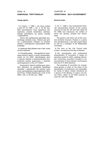 DZIAŁ III CHAPTER III SAMORZĄD TERYTORIALNY TERRITORIAL SELF-GOVERNMENT Uwagi ogólne General notes 1. Z dniem 1 I 1999 r. (na mocy ustawy z dnia 24 VII 1998 r., Dz. U. Nr 96, poz. 603) wprowadzono nowy zasadniczy trójstopniowy podział terytorialny państwa, którego jednostkami są: gminy, powiaty i województwa. Gmina jest podstawową jednostką terytorialnego podziału kraju. Kraków jest gminą, a jednocześnie miastem na prawach powiatu i podregionem województwa małopolskiego. 1. On 1 I 1999 a new fundamental three-tier administrative division of the country (Journal of Laws No. 96, item 603, dated 24 VII 1998) was introduced, the entities of which are: gminas, powiats and voivodships. The gmina is the basic unit of the country's territorial structure. Kraków is a gmina and simultaneously a city with powiat status as well as a subregion of the Małopolskie voivodship. 2. Kadencja Rady Miasta trwa 4 lata, licząc od dnia wyborów. 2. The term of the City Council lasts 4 years, counting from the day of election. 3. Charakterystykę demograficzno-zawodową radnych oparto o wyniki sprawozdawczości za rok 2004, aktualizującej dane o radnych zawarte w obwieszczeniach terytorialnych komisji wyborczych z wyborów samorządowych w dniu 27 X 2002 r. 3. The demographic and professional characteristics of councillors is based on reporting results for 2004, updating information concerning councillors included in announcements of local election commissions from the 27 X 2002 elections. Grupowania radnych według grup zawodów dokonano na podstawie klasyfikacji zawodów i specjalności dla potrzeb rynku pracy wprowadzonej rozporządzeniem Ministra Pracy i Polityki Społecznej z dnia 10 XII 2002 r. (Dz. U. Nr 222, poz. 1868). The grouping of councillors by occupational groups is made on the basis of the classification of professions and specialties for needs of labour market introduced by a decree of the Ministry of Labour and Social Policy, dated 10 XII 2002 (Journal of Laws No. 222, item 1868).