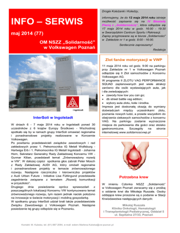 Drogie Koleżanki i Koledzy, INFO – SERWIS maj 2014 (77) OM NSZZ „Solidarność” w Volkswagen Poznań informujemy, że do 12 maja 2014 roku istnieje możliwość zapisania się na IV Biesiadę Piwną z „Solidarnością”, która odbędzie się 17 maja 2014 roku w godz. 16:00 - 19:30 w Swarzędzkim Centrum Sportu i Rekreacji. Zapisy przyjmowane są w biurze „Solidarności” w Zakładzie nr 1 w godz. 8:00 - 16:00. Serdecznie zapraszamy! Redakcja Zlot fanów motoryzacji w VWP InterSoli w Ingolstadt W dniach 6 - 7 maja 2014 roku w Ingolstadt ponad 30 uczestników z 6 krajów Europy Środkowo - Wschodniej spotkało się by w ramach grupy InterSoli omawiać regionalne i ponadnarodowe projekty realizowane w Koncernie Volkswagen. Po powitaniu przedstawicieli związków zawodowych i rad zakładowych przez 1. Pełnomocnika IG Metall Wolfsburg Hartwiga Erb i 1. Pełnomocnika IG Metall Ingolstadt - Johanna Horn, Sekretarz Generalny Rady Zakładowej Koncernu VW Gunnar Kilian, przedstawił temat „Zrównoważony rozwój w VW”. W dalszej części spotkania głos zabrali Peter Mosch z Rady Zakładowej AUDI AG, który omówił regionalne i ponadnarodowe projekty w temacie zrównoważonego rozwoju. Następnie rzeczniczka i kierowniczka projektów z Audi Urban Future - Initiative Lisa Füttingund przedstawiła zagadnienia związane z tematem „Rozwój komunikacji w przyszłości“. Drugiego dnia posiedzenia oprócz sprawozdań z poszczególnych lokalizacji Koncernu VW kontynuowano temat zrównoważonego rozwoju, tym razem jednak nacisk położono na innowacje w świecie motoryzacji i mobilną gospodarkę. W spotkaniu grupy InterSoli udział brali także przedstawiciele Związku Zawodowego z Volkswagen Poznań. Następne posiedzenie tej grupy odbędzie się w Poznaniu. 11 maja 2014 roku od godz. 9:00 na parkingu przy Zakładzie nr 1 w Volkswagen Poznań odbędzie się II Zlot samochodów z Koncernu Volkswagen AG. W programie II ZLOTU VAG PERFORMANCE SQUAD zaplanowanych jest wiele atrakcji zarówno dla osób wystawiających auta, jak i dla zwiedzających: zawody how low you can go; db street battle vag edition; wybory auta zlotu, koła i środka. Impreza jest doskonałą okazją do wymiany doświadczeń między uczestnikami zlotu, poznania nowych ludzi, a przede wszystkim do obejrzenia ciekawych samochodów z koncernu VAG. Na parkingu zostanie wyznaczone miejsce do parkowania dla gości oraz stoisko gastronomiczne. Szczegóły na stronie internetowej www.solidarnoscvwp.pl Potrzebna krew W imieniu Członka NSZZ „Solidarność” w Volkswagen Poznań zwracamy się z prośbą o oddanie krwi dla Mikołaja Ruszała. Osoby oddające krew proszone są o podanie w Stacji Krwiodawstwa następujących danych: Mikołaj Ruszała Klinika Onkologii, Hematologii i Transplantologii Pediatrycznej, Oddział 5 ul. Szpitalna 27/33, Poznań Kontakt: M. Kubska, tel. (61) 887 2094, e-mail: [email protected]