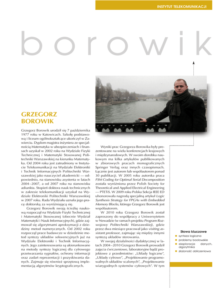 INSTYTUT TELEKOMUNIKACJI borowik GRZEGORZ BOROWIK Grzegorz Borowik urodzi³ siê 7 paŸdziernika 1977 roku w Katowicach. Szko³ê podstawow¹ i liceum ogólnokszta³c¹ce ukoñczy³ w Zawierciu. Dyplom magistra in¿yniera ze specjalnoœci¹ Matematyka w ubezpieczeniach i finansach uzyska³ w 2002 roku na Wydziale Fizyki Technicznej i Matematyki Stosowanej Politechniki Warszawskiej na kierunku Matematyka. Od 2004 roku jest zatrudniony w Instytucie Telekomunikacji na Wydziale Elektroniki i Technik Informacyjnych Politechniki Warszawskiej jako nauczyciel akademicki — odpowiednio, na stanowisku asystenta w latach 2004 –2007, a od 2007 roku na stanowisku adiunkta. Stopieñ doktora nauk technicznych w zakresie telekomunikacji uzyska³ na Wydziale Elektroniki Politechniki Warszawskiej w 2007 roku. Rada Wydzia³u uzna³a jego pracê doktorsk¹ za wyró¿niaj¹c¹ siê. Grzegorz Borowik swoj¹ œcie¿kê naukow¹ rozpocz¹³ na Wydziale Fizyki Technicznej i Matematyki Stosowanej (obecnie Wydzia³ Matematyki i Nauk Informacyjnych), gdzie zajmowa³ siê algorytmami aproksymacji z dziedziny metod numerycznych. Od 2002 roku rozpocz¹³ prace badawcze w dziedzinie metod syntezy uk³adów sekwencyjnych ju¿ na Wydziale Elektroniki i Technik Informacyjnych. Jego zainteresowania s¹ ukierunkowane na metody syntezy logicznej dla cyfrowego przetwarzania sygna³ów, ochrony informacji oraz zadañ reprezentacji i pozyskiwania danych. Zajmuje siê równie¿ sprzêtow¹ implementacj¹ algorytmów kryptograficznych. Wyniki prac Grzegorza Borowika by³y prezentowane na wielu konferencjach krajowych i miêdzynarodowych. W swoim dorobku naukowym ma kilka artyku³ów publikowanych w zbiorowych pracach monograficznych Springer Verlag oraz innych czasopismach. £¹cznie jest autorem lub wspó³autorem ponad 30 publikacji. W 2005 roku autorska praca FSM Coding for Optimal Serial Decomposition zosta³a wyró¿niona przez Polish Society for Theoretical and Applied Electrical Engineering — PTETiS. W 2009 roku Polska Sekcja IEEE ED uhonorowa³a nagrod¹ specjaln¹ artyku³ Logic Synthesis Strategy for FPGAs with Embedded Memory Blocks, którego Grzegorz Borowik jest wspó³autorem. W 2010 roku Grzegorz Borowik zosta³ zaproszony do wspó³pracy z Uniwersytetem w Newadzie (w ramach projektu Program Rozwojowy Politechniki Warszawskiej), gdzie przez dwa miesi¹ce pracowa³ jako visiting assistant professor, zajmuj¹c siê miêdzy innymi syntez¹ uk³adów sterowania. W swojej dzia³alnoœci dydaktycznej w latach 2004 –2010 Grzegorz Borowik prowadzi³ zajêcia æwiczeniowe, laboratoryjne b¹dŸ projektowe z przedmiotów: „Uk³ady logiczne”, „Uk³ady cyfrowe”, „Projektowanie programowalnych uk³adów scalonych”, „Projektowanie wiarygodnych systemów cyfrowych”. W tym Słowa kluczowe n synteza logiczna n problemy boolowskie n eksploracja algorytmika danych, n złożoność obliczeniowa INSTYTUT TELEKOMUNIKACJI B okresie prowadzi³ równie¿ czêœæ wyk³adów z przedmiotu „Uk³ady logiczne”. W 2008 roku Grzegorz Borowik otrzyma³ nagrodê indywidualn¹ Rektora Politechniki Warszawskiej za osi¹gniêcia naukowe. Jest laureatem Naukowego Stypendium Wyjazdowego dla Nauczyciela Akademickiego Politechniki Warszawskiej przyznanego w drodze konkursu nr CAS/7/POKL przez Centrum Studiów Zaawansowanych Politechniki Warszawskiej w 2009 roku. W okresie 2004 –2010 by³ uczestnikiem piêciu projektów badawczych, m.in. grantu Novel Digital Signal and Image Processing Software and Hardware for Information Systems, przy wspó³pracy z Nanyang Technological University w Singapurze oraz grantu Projektowanie uk³adów cyfrowych do zastosowañ w systemach i sieciach telekomunikacyjnych o wysokiej wiarygodnoœci dzia³ania, realizowanych przy u¿yciu struktur programowalnych FPGA/CPLD Ministerstwa Nauki i Informatyzacji. Od 2007 roku Grzegorz Borowik jest redaktorem czasopisma „International Journal of Electronics and Telecommunications” (poprzednia nazwa: „Electronics and Telecommunications Quarterly”) Komitetu Elektroniki i Telekomunikacji Polskiej Akademii Nauk. W okresie swojej dzia³alnoœci wprowadzi³ w czasopiœmie wiele zmian maj¹cych na celu rozpowszechnienie periodyka w miêdzynarodowym œrodowisku naukowym. Miêdzy innymi wprowadzona zosta³a publikacja elektroniczna oraz darmowy dostêp do artyku³ów. Czasopismo zyska³o nowy ujednolicony format, a na pocz¹tku 2010 roku zosta³ zmieniony tytu³. W 2009 roku zosta³ zaproszony na konferencjê „12 th International Conference on Computer Aided Systems Theory” do przeprowadzenia sesji zatytu³owanej Metody przetwarzania sygna³ów. Jest cz³onkiem komitetu programowego konferencji „International Conference on Broadband and Biomedical Communications”. Ma ¿onê Ewelinê. W lipcu 2010 roku urodzi³a siê im córka Antonina Natalia. Jego hobby to fotografia w ka¿dym tego s³owa znaczeniu.