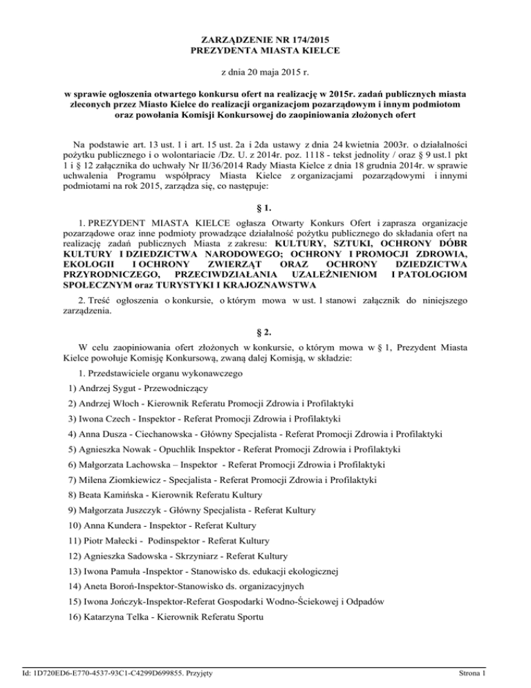 ZARZĄDZENIE NR 174/2015 PREZYDENTA MIASTA KIELCE z dnia 20 maja 2015 r. w sprawie ogłoszenia otwartego konkursu ofert na realizację w 2015r. zadań publicznych miasta zleconych przez Miasto Kielce do realizacji organizacjom pozarządowym i innym podmiotom oraz powołania Komisji Konkursowej do zaopiniowania złożonych ofert Na podstawie art. 13 ust. 1 i art. 15 ust. 2a i 2da ustawy z dnia 24 kwietnia 2003r. o działalności pożytku publicznego i o wolontariacie /Dz. U. z 2014r. poz. 1118 - tekst jednolity / oraz § 9 ust.1 pkt 1 i § 12 załącznika do uchwały Nr II/36/2014 Rady Miasta Kielce z dnia 18 grudnia 2014r. w sprawie uchwalenia Programu współpracy Miasta Kielce z organizacjami pozarządowymi i innymi podmiotami na rok 2015, zarządza się, co następuje: § 1. 1. PREZYDENT MIASTA KIELCE ogłasza Otwarty Konkurs Ofert i zaprasza organizacje pozarządowe oraz inne podmioty prowadzące działalność pożytku publicznego do składania ofert na realizację zadań publicznych Miasta z zakresu: KULTURY, SZTUKI, OCHRONY DÓBR KULTURY I DZIEDZICTWA NARODOWEGO; OCHRONY I PROMOCJI ZDROWIA, EKOLOGII I OCHRONY ZWIERZĄT ORAZ OCHRONY DZIEDZICTWA PRZYRODNICZEGO, PRZECIWDZIAŁANIA UZALEŻNIENIOM I PATOLOGIOM SPOŁECZNYM oraz TURYSTYKI I KRAJOZNAWSTWA 2. Treść ogłoszenia o konkursie, o którym mowa w ust. 1 stanowi załącznik do niniejszego zarządzenia. § 2. W celu zaopiniowania ofert złożonych w konkursie, o którym mowa w § 1, Prezydent Miasta Kielce powołuje Komisję Konkursową, zwaną dalej Komisją, w składzie: 1. Przedstawiciele organu wykonawczego 1) Andrzej Sygut - Przewodniczący 2) Andrzej Włoch - Kierownik Referatu Promocji Zdrowia i Profilaktyki 3) Iwona Czech - Inspektor - Referat Promocji Zdrowia i Profilaktyki 4) Anna Dusza - Ciechanowska - Główny Specjalista - Referat Promocji Zdrowia i Profilaktyki 5) Agnieszka Nowak - Opuchlik Inspektor - Referat Promocji Zdrowia i Profilaktyki 6) Małgorzata Lachowska – Inspektor - Referat Promocji Zdrowia i Profilaktyki 7) Milena Ziomkiewicz - Specjalista - Referat Promocji Zdrowia i Profilaktyki 8) Beata Kamińska - Kierownik Referatu Kultury 9) Małgorzata Juszczyk - Główny Specjalista - Referat Kultury 10) Anna Kundera - Inspektor - Referat Kultury 11) Piotr Małecki - Podinspektor - Referat Kultury 12) Agnieszka Sadowska - Skrzyniarz - Referat Kultury 13) Iwona Pamuła -Inspektor - Stanowisko ds. edukacji ekologicznej 14) Aneta Boroń-Inspektor-Stanowisko ds. organizacyjnych 15) Iwona Jończyk-Inspektor-Referat Gospodarki Wodno-Ściekowej i Odpadów 16) Katarzyna Telka - Kierownik Referatu Sportu Id: 1D720ED6-E770-4537-93C1-C4299D699855. Przyjęty Strona 1 17) Piotr Wójcik - Inspektor - Referat Sportu i Turystyki 18) Piotr Głowacki - Inspektor - Referat Sportu i Turystyki 19) Dariusz Borowiecki - Specjalista - Referat Sportu i Turystyki 2. Przedstawiciele organizacji pozarządowych: 1) Marcin Agatowski – Fundacja Możesz Więcej § 3. Wykonanie zarządzenia powierza się dyrektorom wydziałów: Spraw Obywatelskich, Edukacji, Kultury i Sportu oraz Środowiska. § 4. Zarządzenie wchodzi w życie z dniem podpisania. Prezydent Miasta Kielce Wojciech Lubawski Id: 1D720ED6-E770-4537-93C1-C4299D699855. Przyjęty Strona 2 Załącznik do Zarządzenia Nr 174/2015 Prezydenta Miasta Kielce z dnia 20 maja 2015 r. §1 Prezydent Miasta Kielce ogłasza otwarty konkurs ofert na zlecenie realizacji zadań publicznych w następujących zakresach: 1. KULTURY, NARODOWEGO: SZTUKI, OCHRONY DÓBR KULTURY I DZIEDZICTWA Zadania zlecone w formie powierzenia: Lp. 1 Nazwa zadania i warunki realizacji Wysokość środków publicznych przeznaczona na realizację zadania tego samego rodzaju w roku 2014 (w zł) Wysokość środków publicznych przeznaczona na realizację zadania tego samego rodzaju w roku 2015 (w zł) Wysokość środków publicznych przeznaczona na realizację zadania objętego konkursem (w zł) Termin realizacji zadania 0 0 25.000 czerwiec – grudzień 2015r. 0 0 25.000 Działania na rzecz dialogu międzykulturowego w kontekście historii lokalnej, w tym upamiętnienie społeczności żydowskiej Kielc. Ogółem 2. OCHRONY I PROMOCJI ZDROWIA: Zadania zlecone do realizacji w formie powierzenia: Lp. 1. Nazwa zadania i warunki realizacji Wspieranie działań edukacyjno – informacyjnych sprzyjających przeciwdziałaniu dyskryminacji wobec osób z zaburzeniami psychicznymi Ogółem 3. EKOLOGII I OCHRONY PRZYRODNICZEGO Wysokość środków publicznych przeznaczona na realizację zadania tego samego rodzaju w roku 2014 (w zł) Wysokość środków publicznych przeznaczona na realizację zadania tego samego rodzaju w roku 2015 (w zł) Wysokość środków publicznych przeznaczona na realizację zadania objętego konkursem (w zł) Termin realizacji zadania 15.000 0 25.000 czerwiec – listopad 2015r. 15.000 0 25.000 ZWIERZĄT ORAZ OCHRONY DZIEDZICTWA Zadania zlecone w formie wspierania: Lp. 1 Nazwa zadania i warunki realizacji Przygotowanie broszury edukacyjnej dla uczniów pt. „Co powinieneś wiedzieć o przyrodzie Kielc?”- materiał przygotowany do druku wraz z udostepnieniem praw autorskich. Id: 1D720ED6-E770-4537-93C1-C4299D699855. Przyjęty Wysokość środków publicznych przeznaczona na realizację zadania tego samego rodzaju w roku 2014 (w zł) Wysokość środków publicznych przeznaczona na realizację zadania tego samego rodzaju w roku 2015 (w zł) Wysokość środków publicznych przeznaczona na realizację zadania objętego konkursem (w zł) Termin realizacji zadania 0 0 3.500 czerwiec– listopad 2015r. Strona 1 2 3 Zorganizowanie i przeprowadzenie zintegrowanych warsztatów ekologicznych w terenie dla dzieci i młodzieży w ramach letniego wypoczynku min. 6 warsztatów dla minimum 50 osób Zorganizowanie szkolenia dla liderów z organizacji młodzieżowych w zakresie ekologii i zrównoważonego rozwoju do prowadzenia warsztatów przyrodniczych – min 5 warsztatów 10.000 0 10.000 lipiec – sierpień 2015r