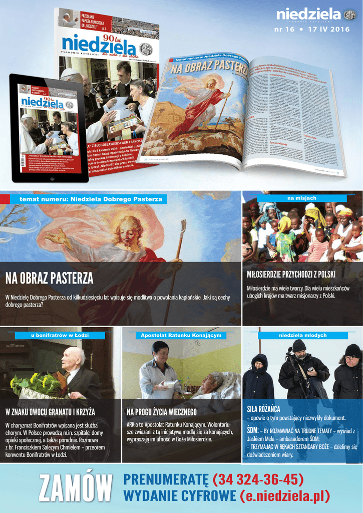 niedziela T Y G nr 16 N I K K A T O L I C K I 17 IV 2016 MIŁOSIERDZIE PRZYCHODZI Z POLSKI W Niedzielę Dobrego Pasterza od kilkudziesięciu lat wpisuje się modlitwa o powołania kapłańskie. Jaki są cechy dobrego pasterza? u bonifratrów w Łodzi D na misjach temat numeru: Niedziela Dobrego Pasterza NA OBRAZ PASTERZA O Apostolat Ratunku Konającym Miłosierdzie ma wiele twarzy. Dla wielu mieszkańców ubogich krajów ma twarz misjonarzy z Polski. niedziela mlodych W ZNAKU OWOCU GRANATU I KRZYŻA NA PROGU ŻYCIA WIECZNEGO SIŁA RÓŻAŃCA W charyzmat Bonifratrów wpisana jest służba chorym. W Polsce prowadzą m.in. szpitale, domy opieki społecznej, a także poradnie. Rozmowa z br. Franciszkiem Salezym Chmielem – przeorem konwentu Bonifratrów w Łodzi. ARK-a to Apostolat Ratunku Konającym. Wolontariusze związani z tą inicjatywą modlą się za konających, wypraszają im ufność w Boże Miłosierdzie. ŚDM: – BY ROZMAWIAĆ NA TRUDNE TEMATY – wywiad z ZAMÓW – opowie o tym powstający niezwykły dokument. Jaśkiem Melą – ambasadorem ŚDM; – TRZYMAJĄC W RĘKACH SZTANDARY BOŻE – dzielimy się doświadczeniem wiary. PRENUMERATĘ (34 324-36-45) WYDANIE CYFROWE (e.niedziela.pl) Zapraszamy do lektury 16. numeru „Niedzieli” na 17 kwietnia 2016 r. Proponujemy m.in. artykuły: Temat numeru: Niedziela Dobrego Pasterza Święty, który otwarł nam drzwi do Europy Św. Wojciech odegrał szczególną rolę w historii Polski, a jego krew stała się prawdziwym posiewem chrześcijaństwa. O życiu i męczeńskiej śmierci jednego z patronów Polski pisze „Niedziela”. Na obraz Pasterza W Niedzielę Dobrego Pasterza od kilkudziesięciu lat wpisuje się modlitwa o powołania kapłańskie. Jaki są cechy dobrego pasterza? Księża, których się nie zapomina Kapłan, który potrafi rozproszyć wątpliwości, rozwiązać supełki sumienia, rzucić koło ratunkowe – czytelnicy „Niedzieli” wspominają kapłanów, którzy w ich życiu odegrali wyjątkową rolę. Miłosierdzie przychodzi z Polski Miłosierdzie ma wiele twarzy. Dla wielu mieszkańców ubogich krajów ma twarz misjonarzy z Polski. W znaku owocu granatu i krzyża W charyzmat Bonifratrów wpisana jest służba chorym. W Polsce prowadzą m.in. szpitale, domy opieki społecznej, a także poradnie. Rozmowa z br. Franciszkiem Salezym Chmielem – przeorem konwentu Bonifratrów w Łodzi. Na progu życia wiecznego ARK-a to Apostolat Ratunku Konającym. Wolontariusze związani z tą inicjatywą modlą się za konających, wypraszają im ufność w Boże Miłosierdzie. Franciszek w oczach Amerykanów Co sądzą o papieżu Franciszku Amerykanie i na czym polegał papieski konflikt z Donaldem Trumpem? W „Niedzieli Młodych”: * Siła Różańca – opowie o tym powstający niezwykły dokument. * ŚDM: ^ By rozmawiać na trudne tematy – wywiad z Jaśkiem Melą – ambasadorem ŚDM; ^ Trzymając w rękach sztandary Boże – dzielimy się doświadczeniem wiary.