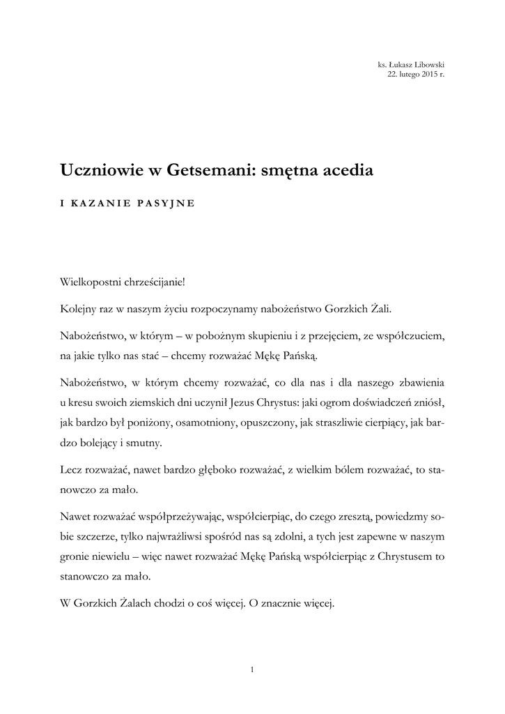 ks. Łukasz Libowski 22. lutego 2015 r. Uczniowie w Getsemani: smętna acedia I KAZANIE PASYJNE Wielkopostni chrześcijanie! Kolejny raz w naszym życiu rozpoczynamy nabożeństwo Gorzkich Żali. Nabożeństwo, w którym – w pobożnym skupieniu i z przejęciem, ze współczuciem, na jakie tylko nas stać – chcemy rozważać Mękę Pańską. Nabożeństwo, w którym chcemy rozważać, co dla nas i dla naszego zbawienia u kresu swoich ziemskich dni uczynił Jezus Chrystus: jaki ogrom doświadczeń zniósł, jak bardzo był poniżony, osamotniony, opuszczony, jak straszliwie cierpiący, jak bardzo bolejący i smutny. Lecz rozważać, nawet bardzo głęboko rozważać, z wielkim bólem rozważać, to stanowczo za mało. Nawet rozważać współprzeżywając, współcierpiąc, do czego zresztą, powiedzmy sobie szczerze, tylko najwrażliwsi spośród nas są zdolni, a tych jest zapewne w naszym gronie niewielu – więc nawet rozważać Mękę Pańską współcierpiąc z Chrystusem to stanowczo za mało. W Gorzkich Żalach chodzi o coś więcej. O znacznie więcej. 1 Siostry i bracia! Rozpoczynamy nabożeństwo, które ma nam uświadomić, że to my – nie kto inny, ale właśnie my – jesteśmy winni tej Męki i tej Śmierci: Śmierci naszego Pana, Śmierci naszego Boga. Jezusa nie zabili Żydzi. Jezusa nie zabili jacyś nieokreśleni oni, jakaś anonimowa masa ignorantów czy głupców, która nie poznała się na tym, że Rabbi z Nazaretu jest Mesjaszem, Bożym Synem, czyli wcieleniem drugiej Osoby Boskiej. Nie. Siostry i bracia, to my, wierzący, to myśmy zbili Boga. To myśmy Chrystusa ukrzyżowali. My – przez nasze grzechy. My – przez naszą gnuśność i naszą złość. My i tylko my. Jesteśmy winni. Na naszych dłoniach jest Jego krew! Na naszych dłoniach jest krew Boga! Ale ta świadomość winy, moi drodzy, nie musi nas zatrważać. Nie musi nas ona wpędzać w desperację czy rozpacz. Ta świadomość ma nas wyzwolić. Ona ma nam pomóc się wyzwolić. Ona ma nam pomóc otworzyć się na Boga, który jeden tylko wyzwala. Który jeden mocen jest wyzwolić uwikłanego w nieprawość człowieka. Wyzwolić – to znaczy uznać swój błąd, swój grzech. To znaczy uderzyć się w pierś, skruszyć, żałować i wyznać: moja wina. Wyzwolić – to znaczy swój grzech nazwać i w pewnym sensie zaakceptować. To znaczy zanieść i zostawić go Bogu i Jego miłosiernej Miłości. To znaczy nawrócić się. Bo u Boga zostać, do Boga przylgnąć i z Bogiem w bliskości żyć – to dopiero jest wyzwolenie. 2 No cóż... A my ciągle pozostajemy z dala od Boga. Zamknięci w sowim świecie. Zamknięci w swoim grzechu. Na swoją zgubę. Choć Bóg jest blisko, blisko nas. Pokorny, kochający, czekający. Dlatego co roku śpiewamy Gorzkie Żale. By wreszcie się ocucić. By znów się ocknąć. By jeszcze raz swoje życie pozbierać. By jeszcze raz do nas dotarło: grzeszymy. Tak, siostry i bracia. Grzeszymy. Jesteśmy grzesznikami. Niepoprawnymi grzesznikami. Grzesznikami nieskorymi do poprawy. * Moi drodzy! Mamy wiele grzechów. O wszystkich nie sposób oczywiście powiedzieć. Myślę, że wszystkich nawet nie sposób wyliczyć – tyle ich jest. Zresztą nie o to chodzi, by wszystkie grzechy wyliczać i omawiać. Chciałbym Wam zaproponować, abyśmy się w kolejne tegoroczne niedziele wielkopostne zastanowili się nad niektórymi tylko. Tymi, jak sądzę, które są w naszym życiu duchowym ważne, istotne, a może nawet i kluczowe. A zatem nad tymi, od których wiele, jeśli nie wszystko, w naszym życiu duchowym zależy, a o których czytamy – nie wprost, naturalnie, ale poprzez ukazanie ich w poszczególnych osobach – w biblijnych opisach Męki Jezusa. Zwłaszcza zaś w Ewangelii Marka, której fragmenty w tym roku liturgicznym rozważamy w kolejne niedziele. 3 * Zacznijmy od Getsemani. Scena ta, nadzwyczaj plastyczna, oddziałująca na wyobraźnię, jest mi bardzo bliska. Utkwiła mi w pamięci jeszcze z dzieciństwa. Pamiętam wyraźnie, jak każdego roku w Wielki Czwartek, po zaniesieniu Najświętszego Sakramentu do ciemnicy, w kościele gasło światło – delikatnie oświetlone pozostawało tylko prezbiterium. I pamiętam, jak w tym półmroku, przy śpiewie – bez akompaniamentu organowego – kolejnych zwrotek hymnu Sław, języku, tajemnicę proboszcz niespiesznie obnażał ołtarz i otwierał puste tabernakulum. I jak potem, zachęcając do adoracji, najpierw wspólnotowej, potem indywidualnej, przypominał wydarzenia z ogrodu oliwnego. Opowiadał o tym, co zaszło tam między Jezusem a apostołami. Co zaszło? Posłuchajmy słów Ewangelii Świętego Marka: A kiedy przyszli do ogrodu zwanego Getsemani, rzekł Jezus do swoich uczniów: „Usiądźcie tutaj, Ja tymczasem będę się modlił”. Wziął ze sobą Piotra, Jakuba i Jana i począł drżeć, i odczuwać trwogę. I rzekł do nich: „Smutna jest moja dusza aż do śmierci; zostańcie tu i czuwajcie!” I odszedłszy nieco dalej, upadł na ziemię i modlił się, żeby – jeśli to możliwe – ominęła Go ta godzina. I mówił: „Abba, Ojcze, dla Ciebie wszystko jest możliwe, zabierz ten kielich ode Mnie! Lecz nie to, co Ja chcę, ale to, co Ty [niech się stanie]!” Potem wrócił i zastał ich śpiących. Rzekł do Piotra: „Szymonie, śpisz? Jednej godziny nie mogłeś czuwać? Czuwajcie i módlcie się, abyście nie ulegli pokusie; duch wprawdzie ochoczy, ale ciało słabe”. Odszedł znowu i modlił się, powtarzając te same słowa. Gdy wrócił, zastał ich śpiących, gdyż oczy ich były snem zmorzone, i nie wiedzieli, co Mu odpowiedzieć. 4 Gdy przyszedł po raz trzeci, rzekł do nich: „Śpicie dalej i odpoczywacie? Dosyć! Przyszła godzina, oto Syn Człowieczy będzie wydany w ręce grzeszników. Wstańcie, chodźmy, oto zbliża się mój zdrajca”. * Moi drodzy, co zaszło w Getsemani? Oto zbliża się godzina Chrystusa, godzina Jego Śmierci. Oto zbliżają się decydujące
