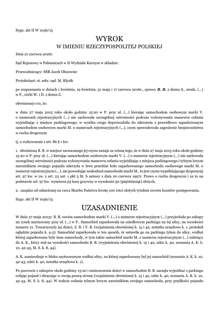 Sygn. akt II W 1036/15 WYROK W IMIENIU RZECZYPOSPOLITEJ POLSKIEJ Dnia 21 czerwca 2016r. Sąd Rejonowy w Pabianicach w II Wydziale Karnym w składzie: Przewodniczący: SSR Jacek Olszowiec Protokolant: st. sekr. sąd. M. Kłysik po rozpoznaniu w dniach 1 kwietnia, 19 kwietnia, 31 maja i 17 czerwca 2016r., sprawy B. B. z domu S., urodz. (...) w P., córki W. i D. z domu Z. obwinionej o to, że: w dniu 27 maja 2015 roku około godziny 15:20 w P. przy ul. (...) kierując samochodem osobowym marki V. o numerach rejestracyjnych (...) nie zachowała szczególnej ostrożności podczas wykonywania manewru cofania wyjeżdżając z miejsca parkingowego, w wyniku czego doprowadziła do zderzenia z prawidłowo zaparkowanym samochodem osobowym marki M. o numerach rejestracyjnych (...), czym spowodowała zagrożenie bezpieczeństwa w ruchu drogowym tj. o wykroczenie z art. 86 § 1 kw. 1. obwinioną B. B. w miejsce zarzucanego jej czynu uznaje za winną tego, że w dniu 27 maja 2015 roku około godziny 15:20 w P. przy ul. (...) kierując samochodem osobowym marki V. (...) o numerze rejestracyjnym (...) nie zachowała szczególnej ostrożności podczas wykonywania manewru cofania wyjeżdżając z miejsca parkingowego i tylnym lewym narożnikiem swojego pojazdu uderzyła w lewe przednie koło zaparkowanego samochodu osobowego marki M. o numerze rejestracyjnym (...), nie powodując uszkodzeń samochodu marki M., to jest czynu wypełniającego dyspozycję art. 97 kw. w zw. z art. 23 ust. 1 pkt 3 lit. b ustawy z dnia 20 czerwca 1997r. Prawo o ruchu drogowym i za to na podstawie art. 97 kw. wymierza jej karę grzywny w wysokości 50 (pięćdziesiąt) złotych, 2. zasądza od oskarżonej na rzecz Skarbu Państwa kwotę 100 (sto) złotych tytułem zwrotu kosztów postępowania. Sygn. akt II W 1036/15 UZASADNIENIE W dniu 27 maja 2015r. B. B. swoim samochodem marki V. (...) o numerze rejestracyjnym (...) przyjechała po zakupy na rynek usytuowany przy ul. (...) w P.. Samochód zaparkowała na osiedlowym parkingu na tej ulicy, na wysokości numeru 21. Towarzyszyły jej dzieci, Z. B. i F. B. (wyjaśnienia obwinionej k. 15 i 42, notatka urzędowa k. 1, protokół oględzin pojazdu k. 4-5). Samochód zaparkowała w ten sposób, że ustawiła go na parkingu tyłem do ulicy, wzdłuż której zaparkowane były inne samochody, w tym także samochód marki M. o numerze rejestracyjnym (...) należący do A. K., który stał na wysokości samochodu B. B. (wyjaśnienia obwinionej k. 15 i 42, szkic k. 40, zeznania A. K. k. 10, 42-43, M. S. k. 8, 44). A. K. zamieszkuje w bloku usytuowanym wzdłuż ulicy, na której zaparkowany był jej samochód (zeznania A. K. k. 10, 42-43, szkic k. 40, notatka urzędowa k. 1). Po powrocie z zakupów około godziny 15:20 i umieszczeniu dzieci w samochodzie B. B. zaczęła wyjeżdżać z parkingu cofając pojazd i skręcając w swoją prawą stronę (wyjaśnienia obwinionej k. 15 i 42, szkic k. 40, zeznania A. K. k. 10, 42-43, M. S. k. 8, 44). W trakcie cofania tylnym lewym narożnikiem swojego samochodu, przy prędkości pojazdu około 1,5 km/h, uderzyła w lewe przednie koło samochodu marki M. należącego do A. K., powodując ruch drgający nadwozia tego pojazdu (zeznania A. K. k. 10, 42-43, M. S. k. 8, 44, opinia biegłego z zakresu techniki samochodowej i rekonstrukcji zdarzeń drogowych k. 50-77). Po tym B. B. wróciła samochodem na wcześniej zajmowane miejsce parkingowe, a przy swoim samochodzie znalazła się A. K., która ze swojego mieszkania widziała manewr cofania wykonywany przez B. B. i ruch karoserii swojego pojazdu (zeznania A. K. k. 10, 42-43). A. K. wezwała na miejsce zdarzenia policję wskazując przybyłym funkcjonariuszom, że w wyniku zdarzenia doszło do uszkodzenia lewego przedniego błotnika w jej samochodzie (zeznania A. K. k. 10, 42-43, notatka urzędowa k. 1, zeznania J. J. - (...) k. 11b, 47, M. Ł. k. 47). Obwiniona B. B. nie przyznała się do popełnienia zarzucanego jej czynu. Wyjaśniła, że w dniu 27 maja 2015r. razem z dwójką dzieci swoim samochodem przyjechała na rynek znajdujący się przy ul. (...) w P. i zaparkowała samochód na parkingu na tej ulicy. Po zrobionych zakupach wsiadła razem z dziećmi do samochodu i wyjeżdżała z miejsc parkingowych cofając pojazd. Ponieważ z tyłu, wzdłuż ulicy (...), zaparkowane były inne pojazdy cofając w pewnym momencie zatrzymała się i wysiadła z samochodu sprawdzić ile jeszcze może cofnąć by nie uderzyć w zaparkowany tam pojazd marki M.. Po sprawdzeniu ile jeszcze ma miejsca na cofanie wsiadła do samochodu i cofnęła samochód jeszcze trochę, a następnie ponownie wjechała na zajmowane dotychczas miejsce parkingowe, by poprawić manewr cofania. Po tym z klatki schodowej wybiegła kobieta, która oświadczyła, że słyszała odgłos uderzenia w swój samochód marki M. i widziała, jak jej samochód zatrząsł się po uderzeniu. Pojawiła się również sąsiadka właścicielki samochodu marki M., która potwierdziła, iż również widziała to zdarzenie. W toku całego postępowania obwiniona zaprzeczała, by prowadzony przez nią samochód choćby dotknął samochodu marki M. (wyjaśnienia obwinionej k. 15, 42,43). Sąd nie dał wiary wyjaśnieniom obwinionej, że nie doszło do kontaktu jej pojazdu z pojazdem należącym do A. K.. Wyjaśnienia te sprzeczne są z zeznaniami A. K. a także M. S., a zdaniem sądu za wiarygodnością tych zeznań przemawia opinia biegłego z zakresu techniki samochodowej i rekonstrukcji zdarzeń drogowych. A. K. zeznała, iż widziała to zdarzenie z okna swojego mieszkania i zaobserwowała, jak obwiniona wycofywała swój pojazd z parkingu zbliżając się tyłem do zaparkowanego wzdłuż ulicy samochodu A. K., po czym zauważyła jak jej auto „zatrzęsło się”. Zeznania te korespondują z zeznaniami M. S., która będąc sąsiadką A. K. i mieszkając w tym samym bloku, w klatce schodowej obok, na drugim piętrze. Co prawda momentu uderzenia nie wi
