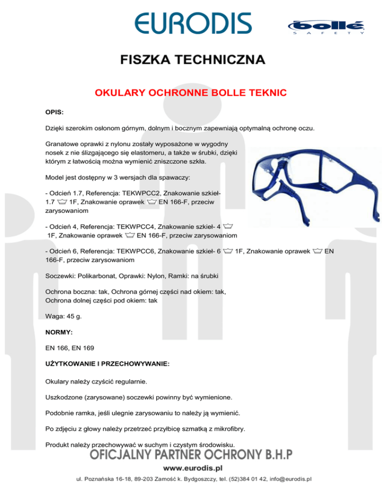 OKULARY OCHRONNE BOLLE TEKNIC OPIS: Dzięki szerokim osłonom górnym, dolnym i bocznym zapewniają optymalną ochronę oczu. Granatowe oprawki z nylonu zostały wyposażone w wygodny nosek z nie ślizgającego się elastomeru, a także w śrubki, dzięki którym z łatwością można wymienić zniszczone szkła. Model jest dostępny w 3 wersjach dla spawaczy: - Odcień 1.7, Referencja: TEKWPCC2, Znakowanie szkieł1.7 1F, Znakowanie oprawek EN 166-F, przeciw zarysowaniom - Odcień 4, Referencja: TEKWPCC4, Znakowanie szkieł- 4 1F, Znakowanie oprawek EN 166-F, przeciw zarysowaniom - Odcień 6, Referencja: TEKWPCC6, Znakowanie szkieł- 6 166-F, przeciw zarysowaniom 1F, Znakowanie oprawek Soczewki: Polikarbonat, Oprawki: Nylon, Ramki: na śrubki Ochrona boczna: tak, Ochrona górnej części nad okiem: tak, Ochrona dolnej części pod okiem: tak Waga: 45 g. NORMY: EN 166, EN 169 UŻYTKOWANIE I PRZECHOWYWANIE: Okulary należy czyścić regularnie. Uszkodzone (zarysowane) soczewki powinny być wymienione. Podobnie ramka, jeśli ulegnie zarysowaniu to należy ją wymienić. Po zdjęciu z głowy należy przetrzeć przyłbicę szmatką z mikrofibry. Produkt należy przechowywać w suchym i czystym środowisku. EN