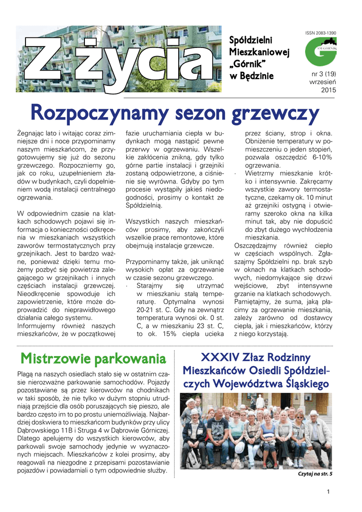 ISSN 2083-1390 nr 3 (19) wrzesień 2015 Rozpoczynamy sezon grzewczy Żegnając lato i witając coraz zimniejsze dni i noce przypominamy naszym mieszkańcom, że przygotowujemy się już do sezonu grzewczego. Rozpoczniemy go, jak co roku, uzupełnieniem zładów w budynkach, czyli dopełnieniem wodą instalacji centralnego ogrzewania. W odpowiednim czasie na klatkach schodowych pojawi się informacja o konieczności odkręcenia w mieszkaniach wszystkich zaworów termostatycznych przy grzejnikach. Jest to bardzo ważne, ponieważ dzięki temu możemy pozbyć się powietrza zalegającego w grzejnikach i innych częściach instalacji grzewczej. Nieodkręcenie spowoduje ich zapowietrzenie, które może doprowadzić do nieprawidłowego działania całego systemu. Informujemy również naszych mieszkańców, że w początkowej fazie uruchamiania ciepła w budynkach mogą nastąpić pewne przerwy w ogrzewaniu. Wszelkie zakłócenia znikną, gdy tylko górne partie instalacji i grzejniki zostaną odpowietrzone, a ciśnienie się wyrówna. Gdyby po tym procesie wystąpiły jakieś niedogodności, prosimy o kontakt ze Spółdzielnią. Wszystkich naszych mieszkańców prosimy, aby zakończyli wszelkie prace remontowe, które obejmują instalacje grzewcze. Przypominamy także, jak uniknąć wysokich opłat za ogrzewanie w czasie sezonu grzewczego. • Starajmy się utrzymać w mieszkaniu stałą temperaturę. Optymalna wynosi 20-21 st. C. Gdy na zewnątrz temperatura wynosi ok. 0 st. C, a w mieszkaniu 23 st. C, to ok. 15% ciepła ucieka Mistrzowie parkowania Plagą na naszych osiedlach stało się w ostatnim czasie nierozważne parkowanie samochodów. Pojazdy pozostawiane są przez kierowców na chodnikach w taki sposób, że nie tylko w dużym stopniu utrudniają przejście dla osób poruszających się pieszo, ale bardzo często im to po prostu uniemożliwiają. Najbardziej doskwiera to mieszkańcom budynków przy ulicy Dąbrowskiego 11B i Struga 4 w Dąbrowie Górniczej. Dlatego apelujemy do wszystkich kierowców, aby parkowali swoje samochody jedynie w wyznaczonych miejscach. Mieszkańców z kolei prosimy, aby reagowali na niezgodne z przepisami pozostawianie pojazdów i powiadamiali o tym odpowiednie służby. przez ściany, strop i okna. Obniżenie temperatury w pomieszczeniu o jeden stopień, pozwala oszczędzić 6-10% ogrzewania. • Wietrzmy mieszkanie krótko i intensywnie. Zakręcamy wszystkie zawory termostatyczne, czekamy ok. 10 minut aż grzejniki ostygną i otwieramy szeroko okna na kilka minut tak, aby nie dopuścić do zbyt dużego wychłodzenia mieszkania. Oszczędzajmy również ciepło w częściach wspólnych. Zgłaszajmy Spółdzielni np. brak szyb w oknach na klatkach schodowych, niedomykające się drzwi wejściowe, zbyt intensywne grzanie na klatkach schodowych. Pamiętajmy, że suma, jaką płacimy za ogrzewanie mieszkania, zależy zarówno od dostawcy ciepła, jak i mieszkańców, którzy z niego korzystają. XXXIV Złaz Rodzinny Mieszkańców Osiedli Spółdzielczych Województwa Śląskiego Czytaj na str. 5 1 Podsumowanie sezonu grzewczego W ostatnim sezonie rozliczeniowym w zasobach SM „Górnik” wystąpił wzrost kosztów ogrzewania w porównaniu do sezonu 2013/2014 r. Przyczyną wzrostu kosztów jest wprowadzenie przez przedsiębiorstwa ciepłownicze nowych taryf na dostawę energii cieplnej. Obowiązujące taryfy, zatwierdzane przez Urząd Regulacji Energetyki, w zależności od dostawcy ciepła mają zróżnicowane ceny za moc zamówioną, za dostawę ciepła, za nośnik ciepła oraz różną stawkę przesyłową. Ponadto, niektóre budynki pobrały większą ilość energii cieplnej do ogrzania. Podstawą odpłatności w okresach rozli2013/2014 Budynek czeniowych jest ilość pobranego ciepła i jego cena uwidoczniona na fakturach wystawionych przez dostawcę. Kwota wniesionych zaliczek za dostawę energii cieplnej do celów c.o. jest rozliczana w stosunku do poniesionych na dany lokal kosztów w rozliczeniu indywidualnym c.o. Z dotychczasowych rozliczeń wynika, że występują zarówno zwroty, jak i dopłaty. W sezonie grzewczym 2014/2015 r. dopłaty stanowiły 22,53% całości budynków, a w przypadku 77,47% wynikiem rozliczenia kosztów ogrzewania była nadpłata. 2014/2015 koszt ilość GJ koszt ilość GJ ogrz. na ogrz. na 2 2 1m p.u. 1 m p.u. 1 m2p.u. 1 m2p.u. Dąbrowa Górnicza Średni koszt ogrzania 1 m2 p.u. w całych zasobach Spółdzielni wyniósł w ostatnim sezonie rozliczeniowym 2,49 zł/m2/m-c. W budynkach, w których zamontowano podzielniki kosztów w mieszkaniach średni koszt ogrzania 1m2p.u. wyniósł 2,37 zł/m2/m-c. Natomiast w budynkach bez podzielników koszt ogrzania 1 m2p.u. był znacznie wyższy i wyniósł 3,34 zł/m2/m-c. Poniżej przedstawiamy jak kształtowała się ilość zużytej do celów c.o. energii cieplnej w GJ w sezonie grzewczym 2013/2014 r i 2014/2015 r. w przeliczeniu na 1 m2 p.u oraz koszt ogrzania 1 m2 p.u. w poszczególnych budynkach. Będzin 15-go Grudnia 1 2,20 0,22 2,36 0,26 3 2,30 0,22 2,49 0,24 5 2,26 0,20 2,38 0,22 Struga 1 2,27 0,22 2,33 0,22 Sosnowiec 2 2,46 0,24 2,54 0,25 2,64 0,30 2,35 0,22 3 2,27 0,22 2,39 0,24 Braci Śniad. 1 4 2,31 0,22 2,42 0,23 2 2,31 0,26 2,36 0,28 5 2,72 0,37 2,86 0,38 3 2,38 0,25 2,43 0,26 6 2,15 0,21 2,37 0,23 4 1,89 0,19 1,94 0,19 7 3,15 0,41 3,23 0,41 5 2,35 0,27 2,32 0,26 Legionów Pl. 40 2,29 0,26 2,46 0,27 2,50 0,32 2,38 0,28 42 2,17 0,23 2,27 0,25 Niemcewicza 9-11 44 2,21 0,22 2,30 0,22 13-15 2,04 0,20 2,11 0,22 46 2,55 0,24 2,71 0,27 17-19 2,40 0,25 2,35 0,25 Dąbrowskiego 7 2,50 0,25 2,55 0,25 Zabłockiego 2-4 2,32 0,26 2,32 0,29 11A 2,34 0,26 2,35 0,23 6-8-10 2,32 0,21 2,18 0,23 11B 2,38 0,27 2,55 0,27 3-go Maja 34 2,78 0,36 2,87 0,36 2,13 0,28 2,32 0,28 Naruszewicza 3 5 2,32 0,29 2,12 0,27 36 2,31 0,25 2,46 0,26 38 1,97 0,19 2,07 0,21 11-15 2,36 0,27 2,55 0,29 3,39 0,56 3,39 0,54 Plaka 6A 2,32 0,27 2,41 0,30 Szymanowskiego 1 6B 2,26 0,25 2,37 0,29 2 3,38 0,57 3,44 0,57 6C 