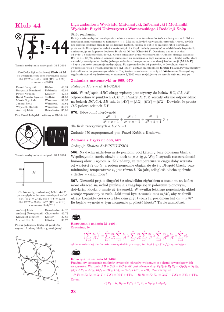 Klub 44 Liga zadaniowa Wydziału Matematyki, Informatyki i Mechaniki, Wydziału Fizyki Uniwersytetu Warszawskiego i Redakcji Delty Skrót regulaminu Termin nadsyłania rozwiązań: 31 I 2014 Czołówka ligi zadaniowej Klub 44 M po uwzględnieniu ocen rozwiązań zadań 659 (W T = 1,61) i 660 (W T = 1,26) z numeru 4/2013 Paweł Łabędzki Krzysztof Kamiński Paweł Najman Rami Marcin Ayoush Marek Spychała Janusz Fiett Wojciech Maciak Andrzej Idzik Kielce Pabianice Kraków Szelków Warszawa Warszawa Warszawa Bolesławiec 46,24 42,89 42,58 41,55 39,37 37,62 36,72 35,50 Pan Paweł Łabędzki: witamy w Klubie 44 ! Każdy może nadsyłać rozwiązania zadań z numeru n w terminie do końca miesiąca n + 2. Szkice rozwiązań zamieszczamy w numerze n + 4. Można nadsyłać rozwiązania czterech, trzech, dwóch lub jednego zadania (każde na oddzielnej kartce), można to robić co miesiąc lub z dowolnymi przerwami. Rozwiązania zadań z matematyki i z fizyki należy przesyłać w oddzielnych kopertach, umieszczając na kopercie dopisek: Klub 44 M lub Klub 44 F. Oceniamy zadania w skali od 0 do 1 z dokładnością do 0,1. Ocenę mnożymy przez współczynnik trudności danego zadania: W T = 4 − 3S/N , gdzie S oznacza sumę ocen za rozwiązania tego zadania, a N – liczbę osób, które nadesłały rozwiązanie choćby jednego zadania z danego numeru w danej konkurencji (M lub F) – i tyle punktów otrzymuje nadsyłający. Po zgromadzeniu 44 punktów, w dowolnym czasie i w którejkolwiek z dwóch konkurencji (M lub F), zostaje on członkiem Klubu 44, a nadwyżka punktów jest zaliczana do ponownego udziału. Trzykrotne członkostwo – to tytuł Weterana. Szczegółowy regulamin został wydrukowany w numerze 2/2002 oraz znajduje się na stronie deltami.edu.pl Zadania z matematyki nr 669, 670 Redaguje Marcin E. KUCZMA 669. W trójkącie ABC okrąg wpisany jest styczny do boków BC, CA, AB odpowiednio w punktach D, E, F . Punkty X, Y, Z zostały obrane odpowiednio na bokach BC, CA, AB tak, że |AY | = |AZ|, |BX| = |BZ|. Dowieść, że prosta DE połowi odcinek XY . 670. Udowodnić nierówność b2 + 1 c2 + 1 a2 + 1 + + 2 b2 + c + 1 c2 + a + 1 a2 + b + 1 dla liczb rzeczywistych a, b, c > −1. Zadanie 670 zaproponował pan Paweł Kubit z Krakowa. Zadania z f izyki nr 566, 567 Redaguje Elżbieta ZAWISTOWSKA Termin nadsyłania rozwiązań: 31 I 2014 Czołówka ligi zadaniowej Klub 44 F po uwzględnieniu ocen rozwiązań zadań 554 (W T = 2,44), 555 (W T = 1,98) 556 (W T = 2,58) i 557 (W T = 2,13) z numerów 3–4/2013 Andrzej Idzik Andrzej Nowogrodzki Krzysztof Magiera Michał Koźlik Bolesławiec Chocianów Łosiów Gliwice 566. Na dachu nachylonym do poziomu pod kątem ϕ leży ołowiana blacha. Współczynnik tarcia ołowiu o dach to µ > tg ϕ. Współczynnik rozszerzalności liniowej ołowiu wynosi α. Zakładamy, że temperatura w ciągu doby wzrasta od wartości t1 do t2 , a potem ponownie obniża się do t1 . Długość blachy przy minimalnej temperaturze t1 jest równa l. Na jaką odległość blacha spełznie z dachu w ciągu doby? 567. Nieważki pręt o długości l z niewielkim ciężarkiem o masie m na końcu może obracać się wokół punktu A i znajduje się w położeniu pionowym, dotykając klocka o masie M (rysunek). W wyniku lekkiego popchnięcia układ zostaje wprawiony w ruch. Jaki musi być stosunek mas m/M , aby w chwili utraty kontaktu ciężarka z klockiem pręt tworzył z poziomem kąt α0 = π/6? Ile będzie wynosić w tym momencie prędkość klocka? Tarcie zaniedbać. 44,26 43,72 37,67 33,75 Po raz jedenasty liczbę 44 punktów uzyskał Andrzej Idzik – gratulujemy! Rozwiązanie zadania M 1403. Zauważmy, że n X xk √ k 2 n X n X n xk √ k X xk xl √ √ l k k X n n X xk xk X xl x2k , √ √ k√ = l k k k=1 l=1 l=1 k=1 k=1 k=1 k=1 √ gdzie w ostatniej nierówności skorzystaliśmy z tego, że ciągi (xj ), (1/ j) są malejące. = Rozwiązanie zadania M 1402. Przyjmijmy oznaczenia punktów styczności okręgów wpisanych z bokami czworokątów jak na rysunku. Warunek AB + CD = BC + AD jest równoważny P1 P2 + R1 R2 = Q1 Q2 + S1 S2 , gdyż AP1 = AS2 , BQ1 = BP2 , CQ2 = CR1 i DS1 = DR2 . Zauważmy, że P1 P2 = X1 X2 = X1 T + T X2 = Y1 T + T Y2 , R1 R2 = X3 X4 = X3 T + T X4 = T Y3 + T Y4 . Zatem P1 P2 + R1 R2 = Y1 Y3 + Y2 Y4 = S1 S2 + Q1 Q2 . 23