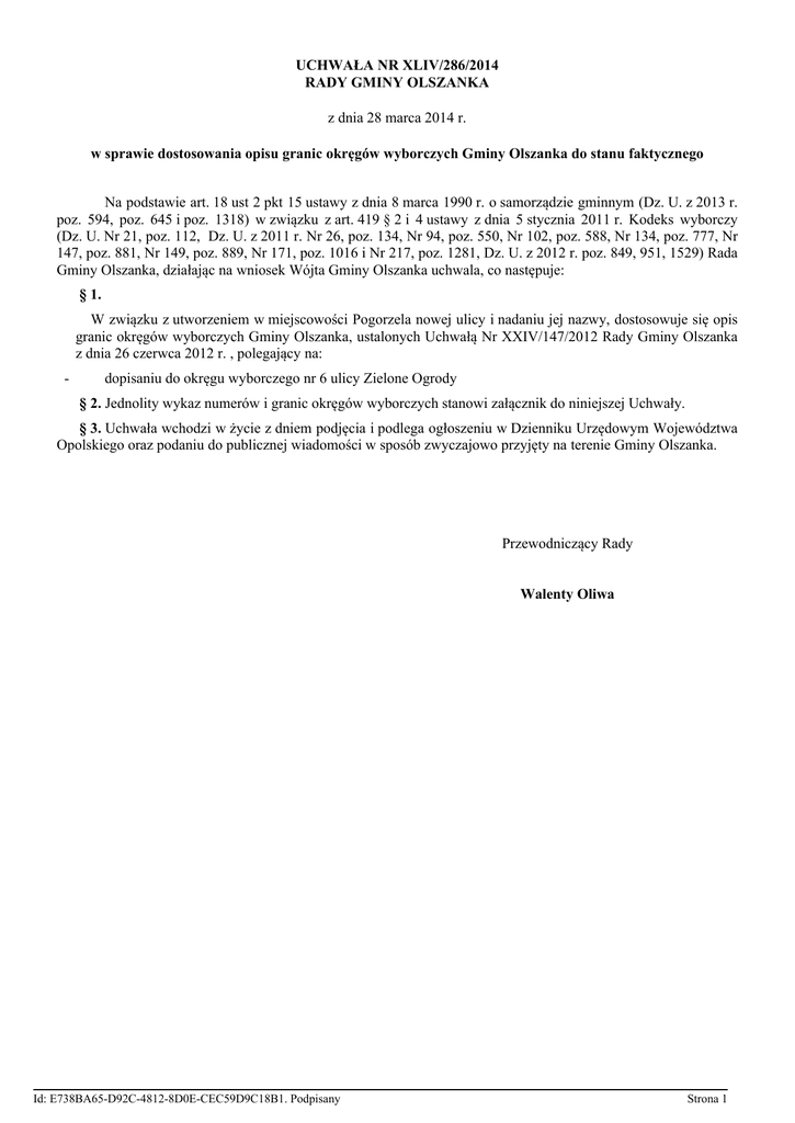 UCHWAŁA NR XLIV/286/2014 RADY GMINY OLSZANKA z dnia 28 marca 2014 r. w sprawie dostosowania opisu granic okręgów wyborczych Gminy Olszanka do stanu faktycznego Na podstawie art. 18 ust 2 pkt 15 ustawy z dnia 8 marca 1990 r. o samorządzie gminnym (Dz. U. z 2013 r. poz. 594, poz. 645 i poz. 1318) w związku z art. 419 § 2 i 4 ustawy z dnia 5 stycznia 2011 r. Kodeks wyborczy (Dz. U. Nr 21, poz. 112, Dz. U. z 2011 r. Nr 26, poz. 134, Nr 94, poz. 550, Nr 102, poz. 588, Nr 134, poz. 777, Nr 147, poz. 881, Nr 149, poz. 889, Nr 171, poz. 1016 i Nr 217, poz. 1281, Dz. U. z 2012 r. poz. 849, 951, 1529) Rada Gminy Olszanka, działając na wniosek Wójta Gminy Olszanka uchwala, co następuje: § 1. W związku z utworzeniem w miejscowości Pogorzela nowej ulicy i nadaniu jej nazwy, dostosowuje się opis granic okręgów wyborczych Gminy Olszanka, ustalonych Uchwałą Nr XXIV/147/2012 Rady Gminy Olszanka z dnia 26 czerwca 2012 r. , polegający na: - dopisaniu do okręgu wyborczego nr 6 ulicy Zielone Ogrody § 2. Jednolity wykaz numerów i granic okręgów wyborczych stanowi załącznik do niniejszej Uchwały. § 3. Uchwała wchodzi w życie z dniem podjęcia i podlega ogłoszeniu w Dzienniku Urzędowym Województwa Opolskiego oraz podaniu do publicznej wiadomości w sposób zwyczajowo przyjęty na terenie Gminy Olszanka. Przewodniczący Rady Walenty Oliwa Id: E738BA65-D92C-4812-8D0E-CEC59D9C18B1. Podpisany Strona 1 Załącznik Nr 1 do Uchwały Nr XLIV/286/2014 Rady Gminy Olszanka z dnia 28 marca 2014 r. Podział Gminy Olszanka na okręgi wyborcze Numer okręgu wyborczego Granice okręgu Liczba radnych wybieranych w okręgu 1 Sołectwo Gierszowice 1 2 Sołectwo Janów 1 3 Sołectwo Krzyżowice: od Nr domu 1 do Nr domu 49 i od Nr domu 71 do końca 1 4 Sołectwo Krzyżowice: od Nr domu 50 do Nr domu 70 1 5 Sołectwo Olszanka 1 6 Sołectwo Pogorzela: od Nr domu 1 do Nr domu 54 oraz ulica Zielone Ogrody 1 7 Sołectwo Pogorzela: od Nr domu 54A do końca 1 8 Sołectwo Czeska Wieś 1 9 Sołectwo Jankowice Wielkie: od Nr domu 1 do Nr domu 40A oraz ulica Polna 10 11 Sołectwo Jankowice Wielkie: od Nr domu 41 do końca Sołectwo Michałów: od Nr domu 1 do Nr domu 37 i od Nr domu 113 do końca 12 Sołectwo Michałów: od Nr domu 38 do Nr domu 112 13 Sołectwa Obórki 14 Sołectwo Przylesie: od Nr domu 1 do Nr domu 53 i od Nr domu 135 do końca 15 Sołectwo Przylesie: od Nr domu 54 do Nr domu 134 1 1 1 1 1 1 1 Przewodniczący Rady Walenty Oliwa Id: E738BA65-D92C-4812-8D0E-CEC59D9C18B1. Podpisany Strona 1