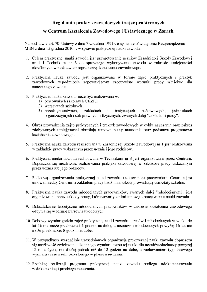 Regulamin praktyk zawodowych i zajęć praktycznych w Centrum Kształcenia Zawodowego i Ustawicznego w Żorach Na podstawie art. 70 Ustawy z dnia 7 września 1991r. o systemie oświaty oraz Rozporządzenia MEN z dnia 15 grudnia 2010 r. w sprawie praktycznej nauki zawodu. 1. Celem praktycznej nauki zawodu jest przygotowanie uczniów Zasadniczej Szkoły Zawodowej nr 1 i Technikum nr 3 do sprawnego wykonywania zawodu w zakresie umiejętności określonych w podstawie programowej kształcenia zawodowego. 2. Praktyczna nauka zawodu jest organizowana w formie zajęć praktycznych i praktyk zawodowych w podmiocie zapewniającym rzeczywiste warunki pracy właściwe dla nauczanego zawodu. 3. Praktyczna nauka zawodu może być realizowana w: 1) pracowniach szkolnych CKZiU, 2) warsztatach szkolnych, 3) przedsiębiorstwach, zakładach i instytucjach państwowych, jednostkach organizacyjnych osób prawnych i fizycznych, zwanych dalej "zakładami pracy". 4. Okres prowadzenia zajęć praktycznych i praktyk zawodowych w cyklu nauczania oraz zakres zdobywanych umiejętności określają ramowe plany nauczania oraz podstawa programowa kształcenia zawodowego. 5. Praktyczna nauka zawodu realizowana w Zasadniczej Szkole Zawodowej nr 1 jest realizowana w zakładzie pracy wskazanym przez ucznia i jego rodziców. 6. Praktyczna nauka zawodu realizowana w Technikum nr 3 jest organizowana przez Centrum. Dopuszcza się możliwość realizowania praktyki zawodowej w zakładzie pracy wskazanym przez ucznia lub jego rodziców. 7. Podstawą organizowania praktycznej nauki zawodu uczniów poza pracowniami Centrum jest umowa między Centrum a zakładem pracy bądź inną szkołą prowadzącą warsztaty szkolne. 8. Praktyczna nauka zawodu młodocianych pracowników, zwanych dalej "młodocianymi", jest organizowana przez zakłady pracy, które zawarły z nimi umowę o pracę w celu nauki zawodu. 9. Dokształcanie teoretyczne młodocianych pracowników w zakresie kształcenia zawodowego odbywa się w formie kursów zawodowych. 10. Dobowy wymiar godzin zajęć praktycznej nauki zawodu uczniów i młodocianych w wieku do lat 16 nie może przekraczać 6 godzin na dobę, a uczniów i młodocianych powyżej 16 lat nie może przekraczać 8 godzin na dobę. 11. W przypadkach szczególnie uzasadnionych organizacją praktycznej nauki zawodu dopuszcza się możliwość zwiększenia dziennego wymiaru czasu tej nauki dla uczniów/słuchaczy powyżej 18 roku życia, nie dłużej jednak niż do 12 godzin na dobę, z zachowaniem tygodniowego wymiaru czasu nauki określonego w planie nauczania. 12. Przebieg realizacji programu praktycznej nauki zawodu podlega udokumentowaniu w dokumentacji przebiegu nauczania. 13. Zajęcia praktyczne z uczniami prowadzą nauczyciele praktycznej nauki zawodu. 14. Zajęcia praktyczne mogą także być prowadzone przez właścicieli i pracowników zakładów pracy posiadających uprawnienia zgodnie z odrębnymi przepisami. 15. Zajęcia praktyczne młodocianych i uczniów organizowane w zakładach pracy mogą być prowadzone indywidualnie lub w grupach. 16. Zajęcia praktyczne z uczniami i młodocianymi organizowane w warsztatach i pracowniach CKZiU są prowadzone w grupach. Liczebność grup określa dyrektor Centrum, kierując się przepisami bhp. 17. Praktyki zawodowe uczniów w zależności od wymagań programowych mogą być organizowane w czasie roku szkolnego i/lub podczas ferii letnich. 18. W przypadku organizowania praktyk zawodowych w okresie ferii letnich, odpowiedniemu skróceniu ulega czas trwania zajęć dydaktyczno-wychowawczych dla uczniów odbywających te praktyki. 19. Opuszczone zajęcia praktyczne i praktyki uczeń/słuchacz ma obowiązek odpracować na zasadach określonych odrębnie. 20. Po zakończeniu praktyki zawodowej zakład pracy potwierdza jej odbycie w prowadzonej przez ucznia dokumentacji praktyki oraz wydaje zaświadczenie z oceną wyników uzyskanych przez ucznia podczas praktyki. 21. CKZiU wspólnie z zakładami pracy zapewniają opiekę wychowawczą uczniom i młodocianym pracownikom odbywającym praktyczną naukę zawodu w zakładach pracy. 22. W okresie odbywania praktycznej nauki zawodu w zakładach pracy uczniowie są zobowiązani stosować się do obowiązującego w tych zakładach porządku i regulaminu. W razie naruszenia przez ucznia obowiązującego porządku i regulaminu zakład pracy niezwłocznie powiadamia o tym Centrum, a Centrum rodziców. 23. Obowiązki ucznia dotyczące zachowania się w warsztatach i pracowniach szkolnych określają odrębne przepisy. 24. Regulamin wchodzi w życie z dniem podpisania. Regulamin opracowała Kierownik PNZ – mgr Bożena Długosz