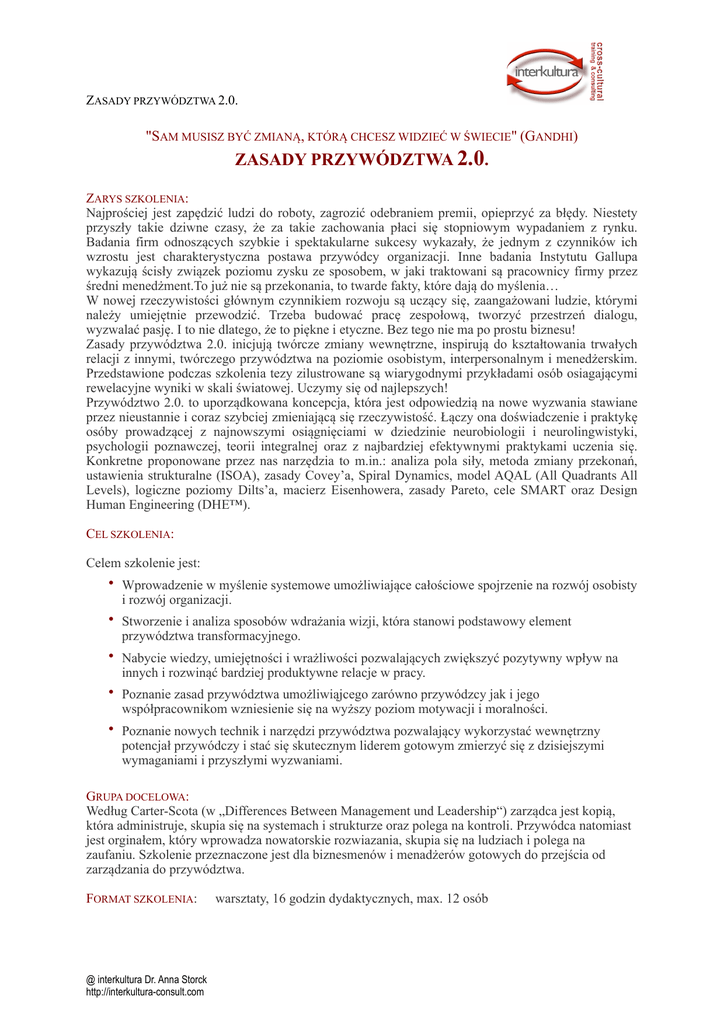 ZASADY PRZYWÓDZTWA 2.0. "SAM MUSISZ BYĆ ZMIANĄ, KTÓRĄ CHCESZ WIDZIEĆ W ŚWIECIE" (GANDHI) ZASADY PRZYWÓDZTWA 2.0. ZARYS SZKOLENIA: Najprościej jest zapędzić ludzi do roboty, zagrozić odebraniem premii, opieprzyć za błędy. Niestety przyszły takie dziwne czasy, że za takie zachowania płaci się stopniowym wypadaniem z rynku. Badania firm odnoszących szybkie i spektakularne sukcesy wykazały, że jednym z czynników ich wzrostu jest charakterystyczna postawa przywódcy organizacji. Inne badania Instytutu Gallupa wykazują ścisły związek poziomu zysku ze sposobem, w jaki traktowani są pracownicy firmy przez średni menedżment.To już nie są przekonania, to twarde fakty, które dają do myślenia… W nowej rzeczywistości głównym czynnikiem rozwoju są uczący się, zaangażowani ludzie, którymi należy umiejętnie przewodzić. Trzeba budować pracę zespołową, tworzyć przestrzeń dialogu, wyzwalać pasję. I to nie dlatego, że to piękne i etyczne. Bez tego nie ma po prostu biznesu! Zasady przywództwa 2.0. inicjują twórcze zmiany wewnętrzne, inspirują do kształtowania trwałych relacji z innymi, twórczego przywództwa na poziomie osobistym, interpersonalnym i menedżerskim. Przedstawione podczas szkolenia tezy zilustrowane są wiarygodnymi przykładami osób osiagającymi rewelacyjne wyniki w skali światowej. Uczymy się od najlepszych! Przywództwo 2.0. to uporządkowana koncepcja, która jest odpowiedzią na nowe wyzwania stawiane przez nieustannie i coraz szybciej zmieniającą się rzeczywistość. Łączy ona doświadczenie i praktykę osóby prowadzącej z najnowszymi osiągnięciami w dziedzinie neurobiologii i neurolingwistyki, psychologii poznawczej, teorii integralnej oraz z najbardziej efektywnymi praktykami uczenia się. Konkretne proponowane przez nas narzędzia to m.in.: analiza pola siły, metoda zmiany przekonań, ustawienia strukturalne (ISOA), zasady Covey’a, Spiral Dynamics, model AQAL (All Quadrants All Levels), logiczne poziomy Dilts’a, macierz Eisenhowera, zasady Pareto, cele SMART oraz Design Human Engineering (DHE™). CEL SZKOLENIA: Celem szkolenie jest: • Wprowadzenie w myślenie systemowe umożliwiające całościowe spojrzenie na rozwój osobisty i rozwój organizacji. • Stworzenie i analiza sposobów wdrażania wizji, która stanowi podstawowy element przywództwa transformacyjnego. • Nabycie wiedzy, umiejętności i wrażliwości pozwalających zwiększyć pozytywny wpływ na innych i rozwinąć bardziej produktywne relacje w pracy. • Poznanie zasad przywództwa umożliwiąjcego zarówno przywódzcy jak i jego współpracownikom wzniesienie się na wyższy poziom motywacji i moralności. • Poznanie nowych technik i narzędzi przywództwa pozwalający wykorzystać wewnętrzny potencjał przywódczy i stać się skutecznym liderem gotowym zmierzyć się z dzisiejszymi wymaganiami i przyszłymi wyzwaniami. GRUPA DOCELOWA: Według Carter-Scota (w „Differences Between Management und Leadership“) zarządca jest kopią, która administruje, skupia się na systemach i strukturze oraz polega na kontroli. Przywódca natomiast jest orginałem, który wprowadza nowatorskie rozwiazania, skupia się na ludziach i polega na zaufaniu. Szkolenie przeznaczone jest dla biznesmenów i menadżerów gotowych do przejścia od zarządzania do przywództwa. FORMAT SZKOLENIA: @ interkultura Dr. Anna Storck http://interkultura-consult.com warsztaty, 16 godzin dydaktycznych, max. 12 osób