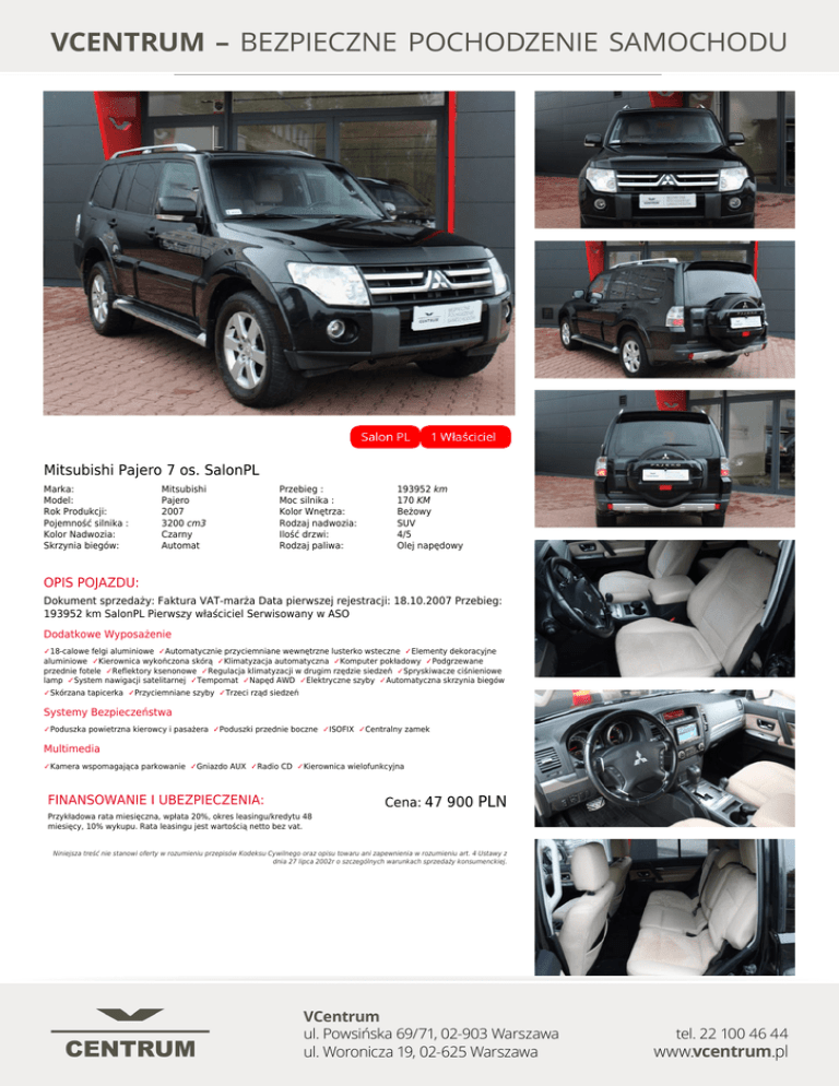 Mitsubishi Pajero 7 os. SalonPL Marka: Model: Rok Produkcji: Pojemność silnika : Kolor Nadwozia: Skrzynia biegów: Mitsubishi Pajero 2007 3200 cm3 Czarny Automat Przebieg : Moc silnika : Kolor Wnętrza: Rodzaj nadwozia: Ilość drzwi: Rodzaj paliwa: 193952 km 170 KM Beżowy SUV 4/5 Olej napędowy OPIS POJAZDU: Dokument sprzedaży: Faktura VAT-marża Data pierwszej rejestracji: 18.10.2007 Przebieg: 193952 km SalonPL Pierwszy właściciel Serwisowany w ASO Dodatkowe Wyposażenie ✓18-calowe felgi aluminiowe ✓Automatycznie przyciemniane wewnętrzne lusterko wsteczne ✓Elementy dekoracyjne aluminiowe ✓Kierownica wykończona skórą ✓Klimatyzacja automatyczna ✓Komputer pokładowy ✓Podgrzewane przednie fotele ✓Reflektory ksenonowe ✓Regulacja klimatyzacji w drugim rzędzie siedzeń ✓Spryskiwacze ciśnieniowe lamp ✓System nawigacji satelitarnej ✓Tempomat ✓Napęd AWD ✓Elektryczne szyby ✓Automatyczna skrzynia biegów ✓Skórzana tapicerka ✓Przyciemniane szyby ✓Trzeci rząd siedzeń Systemy Bezpieczeństwa ✓Poduszka powietrzna kierowcy i pasażera ✓Poduszki przednie boczne ✓ISOFIX ✓Centralny zamek Multimedia ✓Kamera wspomagająca parkowanie ✓Gniazdo AUX ✓Radio CD ✓Kierownica wielofunkcyjna FINANSOWANIE I UBEZPIECZENIA: Cena: 47 900 PLN Przykładowa rata miesięczna, wpłata 20%, okres leasingu/kredytu 48 miesięcy, 10% wykupu. Rata leasingu jest wartością netto bez vat. Niniejsza treść nie stanowi oferty w rozumieniu przepisów Kodeksu Cywilnego oraz opisu towaru ani zapewnienia w rozumieniu art. 4 Ustawy z dnia 27 lipca 2002r o szczególnych warunkach sprzedaży konsumenckiej. Powered by TCPDF (www.tcpdf.org)