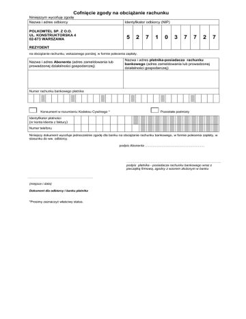 Cofnięcie zgody na obciążanie rachunku Niniejszym wycofuję zgodę Nazwa i adres odbiorcy Identyfikator odbiorcy (NIP) POLKOMTEL SP. Z O.O. UL. KONSTRUKTORSKA 4 02-673 WARSZAWA 5 2 7 1 0 3 7 7 2 7 REZYDENT na obciążanie rachunku, wskazanego poniżej, w formie polecenia zapłaty. Nazwa i adres Abonenta (adres zameldowania lub prowadzonej działalności gospodarczej) Nazwa i adres płatnika-posiadacza rachunku bankowego (adres zameldowania lub prowadzonej działalności gospodarczej) Numer rachunku bankowego płatnika _ _ _ Konsument w rozumieniu Kodeksu Cywilnego * Identyfikator płatności (nr konta klienta z faktury) Numer telefonu _ _ _ Pozostałe podmioty ____________ ___________ Niniejszy dokument wycofuje jednocześnie zgodę dla banku na obciążanie rachunku bankowego, w formie polecenia zapłaty, w stosunku do ww. odbiorcy. podpis Abonenta ……………………………………………… ………………………………………………………………………….. podpis płatnika - posiadacza rachunku bankowego wraz z pieczątką firmową, zgodny z wzorem złożonym w banku (miejsce i data) Dokument dla odbiorcy i banku płatnika *Prosimy zaznaczyć właściwy status.