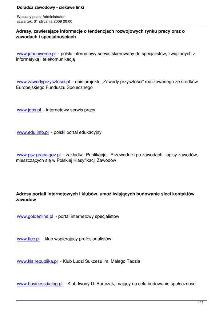 Doradca zawodowy - ciekawe linki Wpisany przez Administrator czwartek, 01 stycznia 2009 00:00 Adresy, zawierające informacje o tendencjach rozwojowych rynku pracy oraz o zawodach i specjalnościach www.jobuniverse.pl - polski internetowy serwis skierowany do specjalistów, związanych z informatyką i telekomunikacją www.zawodyprzyszlosci.pl - opis projektu „Zawody przyszłości” realizowanego ze środków Europejskiego Funduszu Społecznego www.jobs.pl - internetowy serwis pracy www.edu.info.pl - polski portal edukacyjny www.psz.praca.gov.pl - zakładka: Publikacje - Przewodniki po zawodach - opisy zawodów, mieszczących się w Polskiej Klasyfikacji Zawodów Adresy portali internetowych i klubów, umożliwiających budowanie sieci kontaktów zawodów www.goldenline.pl - portal internetowy specjalistów www.ttcc.pl - klub wspierający profesjonalistów www.kls.republika.pl - Klub Ludzi Sukcesu im. Małego Tadzia www.businessdialog.pl - Klub Iwony D. Bartczak, mający na celu budowanie społeczności 1/3 Doradca zawodowy - ciekawe linki Wpisany przez Administrator czwartek, 01 stycznia 2009 00:00 osób, skupiających się wokół zagadnień biznesowych, ekonomicznych i zarządzających Adresy stron internetowych, dotyczących EURES www.europa.eu.int/eures - międzynarodowa strona EURES www.eures.praca.gov.pl - krajowa strona EURES www.ukie.gov.pl - strona Urzędu Komitetu Integracji Europejskiej www.buwiwm.edu.pl - strona Biura Uznawalności Wykształcenia i Wymiany Międzynarodowej www.psz.gov.pl - strona polskich służb zatrudnienia Adresy stron internetowych, na których dostępne są szczegółowe informacje oraz adresy instytucji i organizacji, związanych z rynkiem pracy www.psz.praca.gov.pl - zakładka: Adresy UP www.klubypracy.waw.pl www.ohp.pl 2/3 Doradca zawodowy - ciekawe linki Wpisany przez Administrator czwartek, 01 stycznia 2009 00:00 www.politykaspoleczna.gov.pl www.pomocspoleczna.ngo.pl www.gci.info.pl www.bezrobocie.net - serwis poświęcony pracy i bezrobociu 3/3