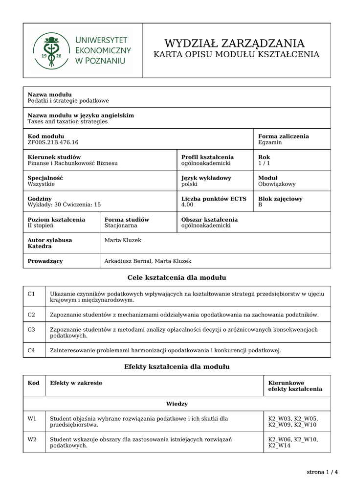 WYDZIAŁ ZARZĄDZANIA KARTA OPISU MODUŁU KSZTAŁCENIA Nazwa modułu Podatki i strategie podatkowe Nazwa modułu w języku angielskim Taxes and taxation strategies Kod modułu ZF00S.21B.476.16 Forma zaliczenia Egzamin Kierunek studiów Finanse i Rachunkowość Biznesu Profil kształcenia ogólnoakademicki Rok 1/1 Specjalność Wszystkie Język wykładowy polski Moduł Obowiązkowy Godziny Wykłady: 30 Ćwiczenia: 15 Liczba punktów ECTS 4.00 Blok zajęciowy B Poziom kształcenia II stopień Forma studiów Stacjonarna Obszar kształcenia ogólnoakademicki Autor sylabusa Katedra Marta Kluzek Prowadzący Arkadiusz Bernal, Marta Kluzek Cele kształcenia dla modułu C1 Ukazanie czynników podatkowych wpływających na kształtowanie strategii przedsiębiorstw w ujęciu krajowym i międzynarodowym. C2 Zapoznanie studentów z mechanizmami oddziaływania opodatkowania na zachowania podatników. C3 Zapoznanie studentów z metodami analizy opłacalności decyzji o zróżnicowanych konsekwencjach podatkowych. C4 Zainteresowanie problemami harmonizacji opodatkowania i konkurencji podatkowej. Efekty kształcenia dla modułu Kod Efekty w zakresie Kierunkowe efekty kształcenia Wiedzy W1 Student objaśnia wybrane rozwiązania podatkowe i ich skutki dla przedsiębiorstwa. K2_W03, K2_W05, K2_W09, K2_W10 W2 Student wskazuje obszary dla zastosowania istniejących rozwiązań podatkowych. K2_W06, K2_W10, K2_W14 strona 1 / 4 W3 Student przedstawia działania w zakresie harmonizacji opodatkowania i ich wpływ na działalność przedsiębiorstw oraz identyfikuje przejawy konkurencji podatkowej. K2_W03, K2_W10 W4 Student dobiera metody analizy umożliwiające podjęcie decyzji, której konsekwencje (w tym podatkowe) są optymalne. K2_W04 W5 Student określa wpływ opodatkowania na wartość przedsiębiorstwa. K2_W15 Umiejętności U1 Student dobiera optymalne rozwiązania podatkowe dla przedsiębiorstw. K2_U02, K2_U05, K2_U07 U2 Student analizuje wpływ danego podatku i jego zmian na sytuację przedsiębiorstwa. K2_U01, K2_U06 U3 Student wyszukuje i interpretuje przepisy prawa podatkowego mające zastosowanie w analizowanej sytuacji. K2_U05 Kompetencji społecznych K1 Student rozróżnia uchylanie się od opodatkowania od unikania opodatkowania. K2_K09 K2 Student identyfikuje problemy związane z działaniami podejmowanymi na rzecz koordynacji lub harmonizacji opodatkowania i eliminowania szkodliwej konkurencji podatkowej w ujęciu światowym. K2_K01, K2_K05 K3 Student samodzielnie i krytycznie uzupełnia wiedzę i umiejętności. K2_K05 Treści programowe Lp. Treści programowe Cele kształcenia dla modułu Efekty kształcenia dla modułu 1. Postulat neutralności opodatkowania i formy reakcji przedsiębiorców na opodatkowanie. C2 K1 2. Opodatkowanie w strategiach przedsiębiorstwa. Planowanie podatkowe i rozkład ciężaru podatkowego. C1 W2 3. Wpływ opodatkowania na wybór miejsca prowadzenia działalności gospodarczej. C1, C2, C3 W1, W2, W3, W4, W5, U1, U2, U3, K3 4. Wpływ opodatkowania na wybór formy prawnej i struktury organizacyjnej przedsiębiorstwa. C1, C2, C3 W1, W2, W3, W4, W5, U1, U2, U3, K3 5. Wpływ opodatkowania na wybór przedmiotu, rozmiarów i struktury asortymentowej prowadzonej przez przedsiębiorstwo działalności. C1, C2, C3 W1, W2, W3, W4, W5, U1, U2, U3, K3 6. Wpływ opodatkowania na kształtowanie rozmiarów, struktury i rozkładu w czasie kosztów prowadzonej przez przedsiębiorstwo działalności. C1, C2, C3 W1, W2, W3, W4, W5, U1, U2, U3, K3 7. Wpływ opodatkowania na określenie pożądanych rozmiarów i pożądanej struktury kapitału przedsiębiorstwa. Wpływ opodatkowania na określenie i realizacja programu polityki inwestycyjnej (w zakresie inwestycji materialnych i inwestycji finansowych) oraz polityki dywidend. C1, C2, C3 W1, W2, W3, W4, W5, U1, U2, U3, K3 strona 2 / 4 8. Wpływ opodatkowania na płynność finansową. C1, C2, C3 W1, W2, W3, W4, W5, U1, U2, U3, K3 9. Opodatkowanie dochodu przy zdarzeniach restrukturyzacyjnych – sprzedaż przedsiębiorstwa, zmiana formy prawnej, fuzje, podziały, likwidacja. C1, C2, C3 W1, W2, W3, W4, W5, U1, U2, U3, K3 10. Międzynarodowe aspekty opodatkowania. Umowy o unikaniu podwójnego opodatkowania. Dyrektywy UE. Metody unikania podwójnego opodatkowania. Szkodliwa konkurencja podatkowa. C1, C2, C3, C4 W3, U1, U2, U3, K2, K3 11. Szacowanie dochodu podatkowego w przypadku przedsiębiorstw powiązanych (ceny transferowe). Uprzednie porozumienia cenowe. C1, C2, C3, C4 W3, U1, U2, U3, K1, K2, K3 Literatura Obowiązkowa 1. M. Kluzek, Zbiór zadań z opodatkowania, Materiały Dydaktyczne nr 267, UEP, Poznań 2012 2. M. Jamroży, S. Kudert, Optymalizacja opodatkowania dochodów przedsiębiorców, Wolters Kluwer, Warszawa 2013. Zalecana 1. M.S. Scholes, M.A. Wolfson, M. Ericsson, E.L. Maydew, T. Shevlin, Taxes and business strategy. A Planning approach, Pearson Prentice Hall 2009. 2. Międzynarodowe planowanie podatkowe, red. Ł. Ziółek, Difin, Warszawa 2007. 3. M. Poszwa, Zarządzanie podatkami w małej i średniej firmie, C.H. Beck, Warszawa 2007. 4. M. Kluzek, Znaczenie konkurencji podatkowej dla rozmieszczenia bezpośrednich inwestycji zagranicznych w Unii Europejskiej, UEP, Poznań 2012. 5. A. Bernal, Zjawisko uchylania się od podatków dochodowych i metody jego ograniczania, Difin, Warszawa 2008. Wymagania wstępne Podstawowa wiedza z zakresu ekonomii i finansów, a w szczególności z opodatkowania, na poziomie pierwszego stopnia studiów na kierunku Finanse i rachunkowość. Metody nauczania Wykład z prezentacją multimedialną , Analiza przypadków , Dyskusja Sposób zaliczcenia Sprawdzian zaliczeniowy pisemny z otwartymi pytaniami, Uczestnictwo w zajęciach, Egzamin pisemny testowy, Egzamin pisemny z otwartymi pytaniami Rozliczenie punktów ECTS Forma aktywności studenta Średnia liczba godzin przeznaczonych na zrealizowane aktywności* Przygotowanie do egzaminu 15 Przygotowanie do sprawdzianu/ kolokwium 15 Przeprowadzenie