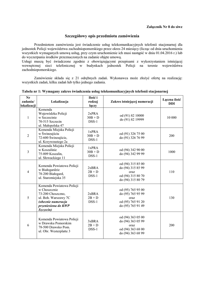 Załącznik Nr 8 do siwz Szczegółowy opis przedmiotu zamówienia Przedmiotem zamówienia jest świadczenie usług telekomunikacyjnych telefonii stacjonarnej dla jednostek Policji województwa zachodniopomorskiego przez okres 24 miesięcy (licząc od dnia uruchomienia wszystkich wymaganych umową usług, przy czym uruchomienie ich musi nastąpić w dniu 01.04.2016 r.) lub do wyczerpania środków przeznaczonych na zadanie objęte umową. Usługi muszą być świadczone zgodnie z obowiązującymi przepisami z wykorzystaniem istniejącej wewnętrznej sieci telefonicznej w budynkach jednostek Policji na terenie województwa zachodniopomorskiego. Zamówienie składa się z 21 odrębnych zadań. Wykonawca może złożyć ofertę na realizację: wszystkich zadań, kilku zadań lub tylko jednego zadania. Tabela nr 1: Wymagany zakres świadczenia usług telekomunikacyjnych telefonii stacjonarnej Nr zadania/ lokalizacji Ilość i rodzaj łączy Zakres istniejącej numeracji Łączna ilość DDI 2xPRA 30B + D DSS-1 od (91) 82 10000 do (91) 82 19999 10 000 1xPRA 30B + D DSS-1 od (91) 326 75 00 do (91) 326 76 99 200 1xPRA 30B + D DSS-1 od (94) 342 90 00 do (94) 342 99 99 1000 4 Komenda Powiatowa Policji w Białogardzie 78-200 Białogard, ul. Staromiejska 35 2xBRA 2B + D DSS-1 od (94) 315 85 00 do (94) 315 85 99 oraz od (94) 315 80 70 do (94) 315 80 79 110 5 Komenda Powiatowa Policji w Choszcznie 73-200 Choszczno, ul. Boh. Warszawy 7C (obecnie numeracja przeniesiona do KWP Szczecin) 2xBRA 2B + D DSS-1 od (95) 765 95 00 do (95) 765 95 99 oraz od (95) 765 91 20 do (95) 765 91 49 130 6 Komenda Powiatowa Policji w Drawsku Pomorskim 78-500 Drawsko Pom. ul. Obr. Westerplatte 3 3xBRA 2B + D DSS-1 od (94) 363 05 00 do (94) 363 05 99 oraz od (94) 363 68 00 do (94) 363 68 99 200 1 2 3 Lokalizacja Komenda Wojewódzka Policji w Szczecinie 70-515 Szczecin ul. Małopolska 47 Komenda Miejska Policji w Świnoujściu 72-600 Świnoujście, ul. Krzywoustego 2a Komenda Miejska Policji w Koszalinie 75-009 Koszalin, ul. Słowackiego 11 Numer główny (2 BRA) (91) 460 25 00 oraz zakres od (91) 460 25 01 do (91) 460 25 99 i numer główny (2 BRA) (91) 579 23 00 oraz zakres od (91) 579 23 01 do (91) 579 23 99 od (91) 385 75 00 do (91) 385 75 99 oraz od (91) 385 28 50 do (91) 385 28 89 Numer główny (2 BRA) (91) 432 68 00 oraz zakres od (91) 432 68 01 do (91) 432 68 99 oraz zakres od (91) 432 64 60 do (91) 432 64 89 i numer główny (2 BRA) (91) 466 63 00 oraz zakres od (91) 466 63 01 do (91) 466 63 99 7 Komenda Powiatowa Policji w Goleniowie 72-100 Goleniów, Maszewska 9 2xBRA 2B + D DSS-1 oraz 2xBRA 2B + D 8 Komenda Powiatowa Policji w Gryficach 72-300 Gryfice, ul. Mickiewicza 19 2xBRA 2B + D DSS-1 9 Komenda Powiatowa Policji w Gryfinie 74-100 Gryfino, ul. Grunwaldzka 9 4xBRA 2B + D DSS-1 10 Komenda Powiatowa Policji w Kamieniu Pom. 72-400 Kamień Pomorski, ul. Żwirki i Wigury 2 2xBRA 2B + D DSS-1 od (91) 382 55 00 do (91) 382 55 99 oraz od (91) 382 53 30 do (91) 382 53 59 130 11 Komenda Powiatowa Policji w Kołobrzegu 78-100 Kołobrzeg, ul. Kilińskiego 20 3xBRA 2B + D DSS-1 od (94) 353 35 00 do (94) 353 36 99 200 12 Komenda Powiatowa Policji w Łobzie 73-300 Łobez, ul. Wojska Polskiego 2 2xBRA 2B + D DSS-1 od (91) 561 55 00 do (91) 561 55 99 oraz od (91) 561 57 20 do (91) 561 57 39 120 4xBRA 2B + D DSS-1 od (95) 747 75 00 do (95) 747 75 99 oraz od (95) 760 94 00 do (95) 760 94 99 oraz od (95) 747 12 00 do (95) 747 12 49 250 2xBRA 2B + D DSS-1 od (91) 424 75 00 do (91) 424 75 99 100 2xBRA 2B + D DSS-1 od (91) 577 95 00 do (91) 577 95 99 100 13 14 15 Komenda Powiatowa Policji w Myśliborzu 74-300 Myślibórz, ul. Łużycka 21A Komenda Powiatowa Policji w Policach 72-010 Police, ul. Kasprowicza 3 Komenda Powiatowa Policji w Pyrzycach 74-200 Pyrzyce, ul. Kościuszki 24 200 140 230 16 Komenda Powiatowa Policji w Sławnie 76-100 Sławno, ul. Gdańska 2 2xBRA 2B + D DSS-1 od (59) 810 05 00 do (59) 810 05 99 100 17 Komisariat Policji w Darłowie 76-150 Darłowo ul. Rzemieślnicza 48 1xBRA 2B + D DSS-1 od (94) 315 73 00 do (94) 315 73 99 100 18 Komenda Powiatowa Policji w Stargardzie 73-110 Stargard, ul. Warszawska 29 4xBRA 2B + D DSS-1 od (91) 481 35 00 do (91) 481 36 99 200 19 Komenda Powiatowa Policji w Szczecinku 78-400 Szczecinek, ul. Polna 25 2xBRA 2B + D DSS-1 od (94) 375 34 00 do (94) 375 35 99 200 20 Komenda Powiatowa Policji w Świdwinie 78-300 Świdwin, ul. Wojska Polskiego 18a 3xBRA 2B + D DSS-1 21 Komenda Powiatowa Policji w Wałczu 78-600 Wałcz, ul. Kościuszki 33 2xBRA 2B + D DSS-1 od (94) 365 05 00 do (94) 365 05 99 oraz od (94) 382 12 00 do (94) 382 12 49 od (67) 250 45 00 do (67) 250 45 99 oraz od (67) 250 60 40 do (67) 250 60 59 150 120 Usługi świadczone we wszystkich wyżej określonych zadaniach muszą obejmować: 1. Realizację połączeń: a) strefowych; b) do sieci komórkowych wszystkich operatorów; c) międzystrefowych; d) międzynarodowych do państw będących członkami Unii Europejski (tylko dla zadania nr 1); e) bezpłatnie do służb powołanych ustawowo do niesienia pomocy posiadających numery skrócone minimum:112; 999; 998; 997; 994; 992; 991; 986; 984; 985 f) bezpłatnie na bezpłatną linię 0-800 g) na infolinie typu 080X – w cenach mniejszych bądź równych cenom Operatora Dominującego. 2. Realizację połączeń z wszystkich sieci operatorów telekomunikacyjnych krajowych i zagranicznych do każdego numeru z zakresów DDI, które będą używane w realizacji przedmiotu zamówienia. 3. Pakiet świadczonych usług a) sekundowe naliczanie czasu realizowanych rozmów telefonicznych bez naliczania opłaty początkowej za rozpoczęcie połączenia wychodzącego, b) wszystkie połączenia ( w tym także na telefony komórkowe) generowane na łączach będących przedmiotem zamówienia, wymagają prezentacji numeru wywołującego tzw. usługa COLP (prezentacja numeru abonenta przyłączonego). Wymagana jest prezentacja każdego z numerów DDI (nie może być zastosowana prezentacja nume