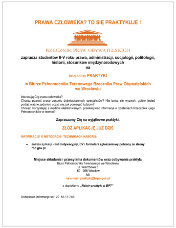 PRAWA CZŁOWIEKA? TO SIĘ PRAKTYKUJE ! zaprasza studentów II-V roku prawa, administracji, socjologii, politologii, historii, stosunków międzynarodowych na bezpłatne PRAKTYKI w Biurze Pełnomocnika Terenowego Rzecznika Praw Obywatelskich we Wrocławiu Interesują Cię prawa człowieka? Chcesz poznać pracę zespołu doświadczonych specjalistów? Nie boisz się wyzwań, gotów jesteś podjąć ważne zadania i uczyć się, jak pomagać ludziom? Chcesz, korzystając z mediów elektronicznych, przekazywać informacje o działaniach Rzecznika i jego Pełnomocników w terenie? Zapraszamy Cię na wyjątkowe praktyki. ZŁÓŻ APLIKACJĘ JUŻ DZIŚ INFORMACJE O METODACH I TECHNIKACH NABORU: analiza aplikacji - list motywacyjny, CV i formularz zgłoszeniowy pobrany ze strony rpo.gov.pl Miejsce składania i przesyłania dokumentów oraz odbywania praktyk: Biuro Pełnomocnika Terenowego we Wrocławiu ul. Wierzbowa 5 50 - 056 Wrocław lub na e-mail: [email protected] z dopiskiem: ,,Nabór-praktyki w BPT” Dodatkowe informacje tel.: 22 55-17-745.