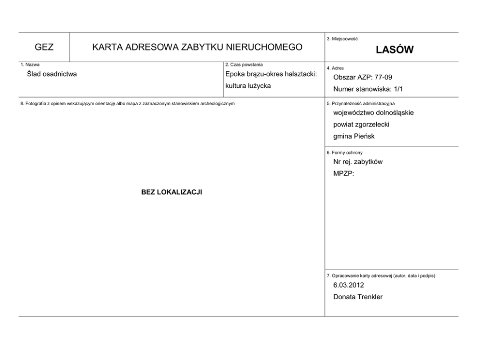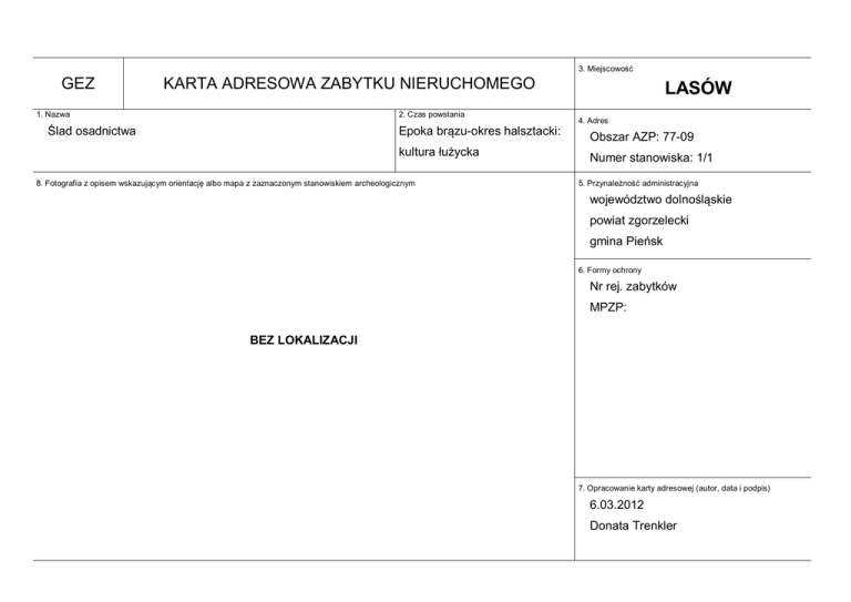 3. Miejscowość GEZ KARTA ADRESOWA ZABYTKU NIERUCHOMEGO 1. Nazwa 2. Czas powstania Ślad osadnictwa LASÓW 4. Adres Epoka brązu-okres halsztacki: Obszar AZP: 77-09 kultura łużycka Numer stanowiska: 1/1 8. Fotografia z opisem wskazującym orientację albo mapa z zaznaczonym stanowiskiem archeologicznym 5. Przynależność administracyjna województwo dolnośląskie powiat zgorzelecki gmina Pieńsk 6. Formy ochrony Nr rej. zabytków MPZP: BEZ LOKALIZACJI 7. Opracowanie karty adresowej (autor, data i podpis) 6.03.2012 Donata Trenkler 3. Miejscowość GEZ KARTA ADRESOWA ZABYTKU NIERUCHOMEGO 1. Nazwa 2. Czas powstania Ślad osadnictwa LASÓW 4. Adres Epoka brązu-okres halsztacki: Obszar AZP: 77-09 kultura łużycka Numer stanowiska: 2/2 8. Fotografia z opisem wskazującym orientację albo mapa z zaznaczonym stanowiskiem archeologicznym 5. Przynależność administracyjna województwo dolnośląskie powiat zgorzelecki gmina Pieńsk 6. Formy ochrony Nr rej. zabytków MPZP: BEZ LOKALIZACJI 7. Opracowanie karty adresowej (autor, data i podpis) 6.03.2012 Donata Trenkler 3. Miejscowość GEZ KARTA ADRESOWA ZABYTKU NIERUCHOMEGO 1. Nazwa 2. Czas powstania Cmentarzysko ciałopalne LASÓW 4. Adres Epoka brązu-okres halsztacki: Obszar AZP: 77-09 kultura łużycka Numer stanowiska: 3/3 8. Fotografia z opisem wskazującym orientację albo mapa z zaznaczonym stanowiskiem archeologicznym 5. Przynależność administracyjna województwo dolnośląskie powiat zgorzelecki gmina Pieńsk 6. Formy ochrony Nr rej. zabytków MPZP: BEZ LOKALIZACJI 7. Opracowanie karty adresowej (autor, data i podpis) 6.03.2012 Donata Trenkler 3. Miejscowość GEZ KARTA ADRESOWA ZABYTKU NIERUCHOMEGO 1. Nazwa 2. Czas powstania Ślad osadnictwa Neolit LASÓW 4. Adres Obszar AZP: 77-09 Numer stanowiska: 4/4 8. Fotografia z opisem wskazującym orientację albo mapa z zaznaczonym stanowiskiem archeologicznym 5. Przynależność administracyjna województwo dolnośląskie powiat zgorzelecki gmina Pieńsk 6. Formy ochrony Nr rej. zabytków MPZP: BEZ LOKALIZACJI 7. Opracowanie karty adresowej (autor, data i podpis) 6.03.2012 Donata Trenkler 3. Miejscowość GEZ KARTA ADRESOWA ZABYTKU NIERUCHOMEGO 1. Nazwa 2. Czas powstania Ślad osadnictwa Neolit LASÓW 4. Adres Obszar AZP: 77-09 Numer stanowiska: 5/5 8. Fotografia z opisem wskazującym orientację albo mapa z zaznaczonym stanowiskiem archeologicznym 5. Przynależność administracyjna województwo dolnośląskie powiat zgorzelecki gmina Pieńsk 6. Formy ochrony Nr rej. zabytków MPZP: BEZ LOKALIZACJI 7. Opracowanie karty adresowej (autor, data i podpis) 6.03.2012 Donata Trenkler 3. Miejscowość GEZ KARTA ADRESOWA ZABYTKU NIERUCHOMEGO 1. Nazwa 2. Czas powstania Osada LASÓW 4. Adres Neolit: kultura amfor kulistych Obszar AZP: 77-09 (KAK) Numer stanowiska: 6/6 8. Fotografia z opisem wskazującym orientację albo mapa z zaznaczonym stanowiskiem archeologicznym 5. Przynależność administracyjna województwo dolnośląskie powiat zgorzelecki gmina Pieńsk 6. Formy ochrony Nr rej. zabytków MPZP: BEZ LOKALIZACJI 7. Opracowanie karty adresowej (autor, data i podpis) 6.03.2012 Donata Trenkler 3. Miejscowość GEZ 1. Nazwa Cmentarzysko ciałopalne Ślad osadnictwa KARTA ADRESOWA ZABYTKU NIERUCHOMEGO 2. Czas powstania III okres epoki brązu-okres halsztacki: kultura łużycka Wczesne średniowiecze, faza młodsza 8. Fotografia z opisem wskazującym orientację albo mapa z zaznaczonym stanowiskiem archeologicznym (skala ok. 1:10000: 451.311) LASÓW 4. Adres Obszar AZP: 77-09 Numer stanowiska: 7/7 5. Przynależność administracyjna województwo dolnośląskie powiat zgorzelecki gmina Pieńsk 6. Formy ochrony Nr rej. zabytków Rejestr C: 575/Arch/72 z 27.12.1972 MPZP: 7. Opracowanie karty adresowej (autor, data i podpis) 15.04.2012 Donata Trenkler 3. Miejscowość GEZ 1. Nazwa Ślad osadnictwa Osada KARTA ADRESOWA ZABYTKU NIERUCHOMEGO 2. Czas powstania Pradzieje Późne średniowiecze LASÓW 4. Adres Obszar AZP: 77-09 Numer stanowiska: 8/12 8. Fotografia z opisem wskazującym orientację albo mapa z zaznaczonym stanowiskiem archeologicznym (skala ok. 1:10000: 451.311) 5. Przynależność administracyjna województwo dolnośląskie powiat zgorzelecki gmina Pieńsk 6. Formy ochrony Nr rej. zabytków MPZP: 7. Opracowanie karty adresowej (autor, data i podpis) 15.04.2012 Donata Trenkler 3. Miejscowość GEZ 1. Nazwa Ślad osadnictwa KARTA ADRESOWA ZABYTKU NIERUCHOMEGO 2. Czas powstania Pradzieje LASÓW 4. Adres Obszar AZP: 77-09 Numer stanowiska: 9/13 8. Fotografia z opisem wskazującym orientację albo mapa z zaznaczonym stanowiskiem archeologicznym (skala ok. 1:10000: 451.311) 5. Przynależność administracyjna województwo dolnośląskie powiat zgorzelecki gmina Pieńsk 6. Formy ochrony Nr rej. zabytków MPZP: 7. Opracowanie karty adresowej (autor, data i podpis) 15.03.2012 Donata Trenkler 3. Miejscowość GEZ 1. Nazwa Ślad osadnictwa Osada KARTA ADRESOWA ZABYTKU NIERUCHOMEGO 2. Czas powstania Pradzieje Późne średniowiecze LASÓW 4. Adres Obszar AZP: 77-09 Numer stanowiska: 10/14 8. Fotografia z opisem wskazującym orientację albo mapa z zaznaczonym stanowiskiem archeologicznym (skala ok. 1:10000: 451.311) 5. Przynależność administracyjna województwo dolnośląskie powiat zgorzelecki gmina Pieńsk 6. Formy ochrony Nr rej. zabytków MPZP: 7. Opracowanie karty adresowej (autor, data i podpis) 15.04.2012 Donata Trenkler 3. Miejscowość GEZ 1. Nazwa Ślad osadnictwa Osada KARTA ADRESOWA ZABYTKU NIERUCHOMEGO 2. Czas powstania Pradzieje Późne średniowiecze LASÓW 4. Adres Obszar AZP: 77-09 Numer stanowiska: 11/15 8. Fotografia z opisem wskazującym orientację albo mapa z zaznaczonym stanowiskiem archeologicznym (skala ok. 1:10000: 451.311) 5. Przynależność administracyjna województwo dolnośląskie powiat zgorzelecki gmina Pieńsk 6. Formy ochrony Nr rej. zabytków MPZP: 7. Opracowanie karty adresowej (autor, data i podpis) 15.04.2012 Donata Trenkler 3. Miejscowość GEZ 1. Nazwa O