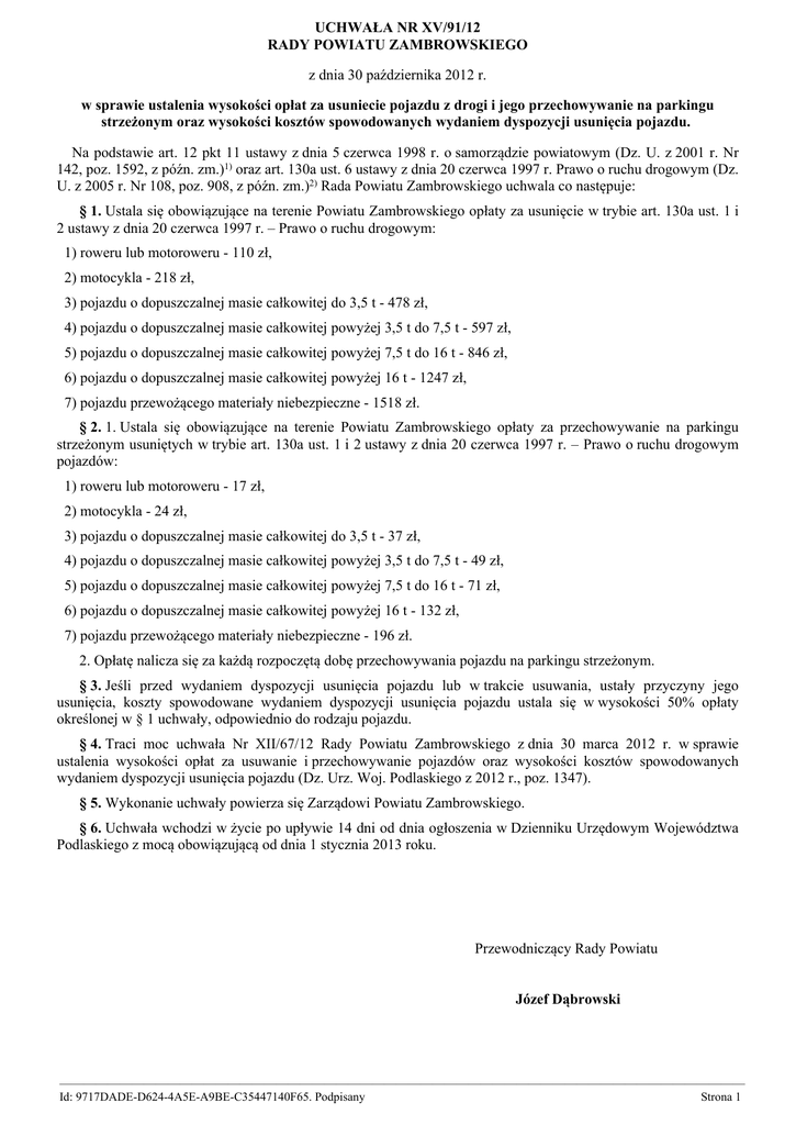 UCHWAŁA NR XV/91/12 RADY POWIATU ZAMBROWSKIEGO z dnia 30 października 2012 r. w sprawie ustalenia wysokości opłat za usuniecie pojazdu z drogi i jego przechowywanie na parkingu strzeżonym oraz wysokości kosztów spowodowanych wydaniem dyspozycji usunięcia pojazdu. Na podstawie art. 12 pkt 11 ustawy z dnia 5 czerwca 1998 r. o samorządzie powiatowym (Dz. U. z 2001 r. Nr 142, poz. 1592, z późn. zm.)1) oraz art. 130a ust. 6 ustawy z dnia 20 czerwca 1997 r. Prawo o ruchu drogowym (Dz. U. z 2005 r. Nr 108, poz. 908, z późn. zm.)2) Rada Powiatu Zambrowskiego uchwala co następuje: § 1. Ustala się obowiązujące na terenie Powiatu Zambrowskiego opłaty za usunięcie w trybie art. 130a ust. 1 i 2 ustawy z dnia 20 czerwca 1997 r. – Prawo o ruchu drogowym: 1) roweru lub motoroweru - 110 zł, 2) motocykla - 218 zł, 3) pojazdu o dopuszczalnej masie całkowitej do 3,5 t - 478 zł, 4) pojazdu o dopuszczalnej masie całkowitej powyżej 3,5 t do 7,5 t - 597 zł, 5) pojazdu o dopuszczalnej masie całkowitej powyżej 7,5 t do 16 t - 846 zł, 6) pojazdu o dopuszczalnej masie całkowitej powyżej 16 t - 1247 zł, 7) pojazdu przewożącego materiały niebezpieczne - 1518 zł. § 2. 1. Ustala się obowiązujące na terenie Powiatu Zambrowskiego opłaty za przechowywanie na parkingu strzeżonym usuniętych w trybie art. 130a ust. 1 i 2 ustawy z dnia 20 czerwca 1997 r. – Prawo o ruchu drogowym pojazdów: 1) roweru lub motoroweru - 17 zł, 2) motocykla - 24 zł, 3) pojazdu o dopuszczalnej masie całkowitej do 3,5 t - 37 zł, 4) pojazdu o dopuszczalnej masie całkowitej powyżej 3,5 t do 7,5 t - 49 zł, 5) pojazdu o dopuszczalnej masie całkowitej powyżej 7,5 t do 16 t - 71 zł, 6) pojazdu o dopuszczalnej masie całkowitej powyżej 16 t - 132 zł, 7) pojazdu przewożącego materiały niebezpieczne - 196 zł. 2. Opłatę nalicza się za każdą rozpoczętą dobę przechowywania pojazdu na parkingu strzeżonym. § 3. Jeśli przed wydaniem dyspozycji usunięcia pojazdu lub w trakcie usuwania, ustały przyczyny jego usunięcia, koszty spowodowane wydaniem dyspozycji usunięcia pojazdu ustala się w wysokości 50% opłaty określonej w § 1 uchwały, odpowiednio do rodzaju pojazdu. § 4. Traci moc uchwała Nr XII/67/12 Rady Powiatu Zambrowskiego z dnia 30 marca 2012 r. w sprawie ustalenia wysokości opłat za usuwanie i przechowywanie pojazdów oraz wysokości kosztów spowodowanych wydaniem dyspozycji usunięcia pojazdu (Dz. Urz. Woj. Podlaskiego z 2012 r., poz. 1347). § 5. Wykonanie uchwały powierza się Zarządowi Powiatu Zambrowskiego. § 6. Uchwała wchodzi w życie po upływie 14 dni od dnia ogłoszenia w Dzienniku Urzędowym Województwa Podlaskiego z mocą obowiązującą od dnia 1 stycznia 2013 roku. Przewodniczący Rady Powiatu Józef Dąbrowski ————————————————————————————————————————————————————————— Id: 9717DADE-D624-4A5E-A9BE-C35447140F65. Podpisany Strona 1 1) Zmiany tekstu jednolitego wymienionej ustawy zostały ogłoszone w Dz. U. z 2002 r. Nr 23, poz. 220, Nr 62, poz. 558, Nr 113, poz. 984, Nr 153, poz. 1271, Nr 200, poz. 1688 i Nr 214, poz. 1806, z 2003 r. Nr 162, poz. 1568, z 2004 r. Nr 102, poz. 1055 i Nr 167, poz. 1759, z 2007 r. Nr 173, poz. 1218, z 2008 r. Nr 180, poz. 1111 i Nr 223, poz. 1458, z 2009 r. Nr 92, poz. 753 i Nr 157, poz. 1241, z 2010 r. Nr 28, poz. 142 i 146, Nr 40, poz. 230 i Nr 106, poz. 675 oraz z 2011 r. Nr 21, poz. 113, Nr 149, poz. 887 i Nr 217, poz. 1281. 2) Zmiany tekstu jednolitego wymienionej ustawy zostały ogłoszone w Dz. U. z 2005 r. Nr 109, poz. 925, Nr 175, poz. 1462, Nr 179, poz. 1486 i Nr 180, poz. 1494 i 1497, z 2006 r. Nr 17, poz. 141, Nr 104, poz. 708 i 711, Nr 190, poz. 1400, Nr 191, poz. 1410 i Nr 235, poz. 1701, z 2007 r. Nr 52, poz. 343, Nr 57, poz. 381, Nr 99, poz. 661, Nr 123, poz. 845 i Nr 176, poz. 1238, z 2008 r. Nr 37, poz. 214, Nr 100, poz. 649, Nr 163, poz. 1015, Nr 209, poz. 1320, Nr 220, poz. 1411 i 1426, Nr 223, poz. 1461 i 1462 i Nr 234, poz. 1573 i 1574, z 2009 r. Nr 3, poz. 11, Nr 18, poz. 97, Nr 79, poz. 663, Nr 91, poz. 739, Nr 92, poz. 753, Nr 97, poz. 802 i 803, Nr 98, poz. 817 i Nr 168, poz. 1323, z 2010 r. Nr 40, poz. 230, Nr 43, poz. 246, Nr 122, poz. 827, Nr 151, poz. 1013, Nr 152, poz. 1018, Nr 182, poz. 1228, Nr 219, poz. 1443, Nr 225, poz. 1466 i Nr 257, poz. 1726, z 2011 r. Nr 30, poz. 151, Nr 92, poz. 530, Nr 102, poz. 585, Nr 106, poz. 622, Nr 171, poz. 1016, Nr 204, poz. 1195, Nr 205, poz. 1210, Nr 208, poz. 1240 i 1241, Nr 222, poz. 1321, Nr 227, poz. 1367, Nr 244, poz. 1454 i Nr 291, poz. 1707 oraz z 2012 r. poz. 113 i poz.472. ————————————————————————————————————————————————————————— Id: 9717DADE-D624-4A5E-A9BE-C35447140F65. Podpisany Strona 2