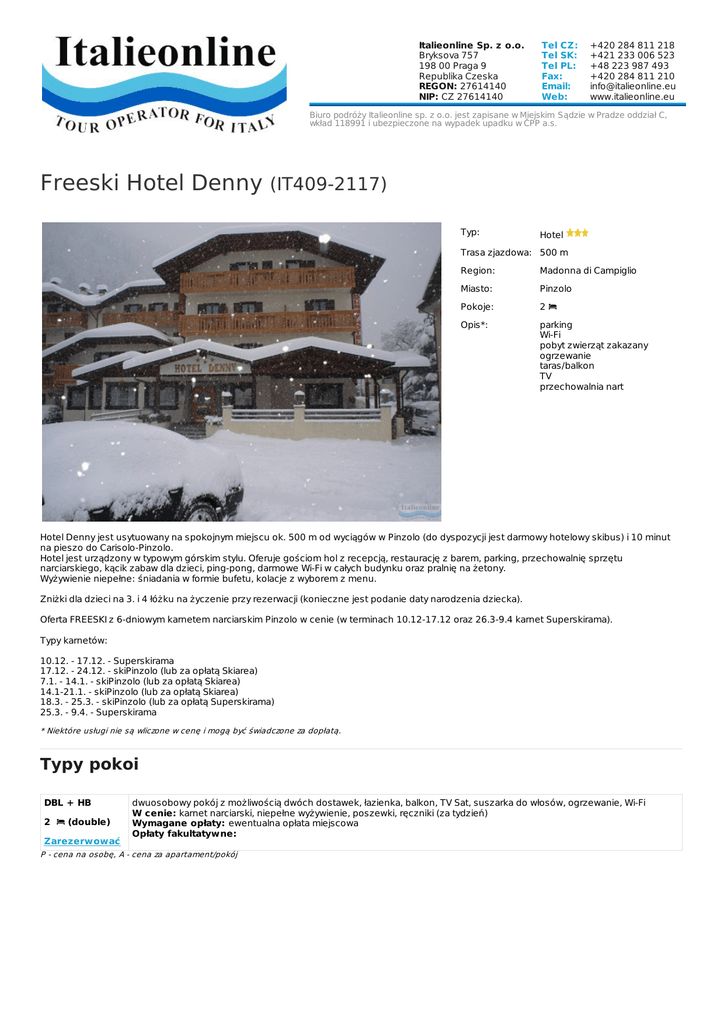 Italieonline Sp. z o.o. Bryksova 757 198 00 Praga 9 Republika Czeska REGON: 27614140 NIP: CZ 27614140 Tel CZ: Tel SK: Tel PL: Fax: Email: Web: +420 284 811 218 +421 233 006 523 +48 223 987 493 +420 284 811 210 [email protected] www.italieonline.eu Biuro podróży Italieonline sp. z o.o. jest zapisane w Miejskim Sądzie w Pradze oddział C, wkład 118991 i ubezpieczone na wypadek upadku w ČPP a.s. Freeski Hotel Denny (IT409-2117) Typ: Hotel Trasa zjazdowa: 500 m Region: Madonna di Campiglio Miasto: Pinzolo Pokoje: 2 Opis*: parking Wi-Fi pobyt zwierząt zakazany ogrzewanie taras/balkon TV przechowalnia nart Hotel Denny jest usytuowany na spokojnym miejscu ok. 500 m od wyciągów w Pinzolo (do dyspozycji jest darmowy hotelowy skibus) i 10 minut na pieszo do Carisolo-Pinzolo. Hotel jest urządzony w typowym górskim stylu. Oferuje gościom hol z recepcją, restaurację z barem, parking, przechowalnię sprzętu narciarskiego, kącik zabaw dla dzieci, ping-pong, darmowe Wi-Fi w całych budynku oraz pralnię na żetony. Wyżywienie niepełne: śniadania w formie bufetu, kolacje z wyborem z menu. Zniżki dla dzieci na 3. i 4 łóżku na życzenie przy rezerwacji (konieczne jest podanie daty narodzenia dziecka). Oferta FREESKI z 6-dniowym karnetem narciarskim Pinzolo w cenie (w terminach 10.12-17.12 oraz 26.3-9.4 karnet Superskirama). Typy karnetów: 10.12. - 17.12. - Superskirama 17.12. - 24.12. - skiPinzolo (lub za opłatą Skiarea) 7.1. - 14.1. - skiPinzolo (lub za opłatą Skiarea) 14.1-21.1. - skiPinzolo (lub za opłatą Skiarea) 18.3. - 25.3. - skiPinzolo (lub za opłatą Superskirama) 25.3. - 9.4. - Superskirama * Niektóre usługi nie są wliczone w cenę i mogą być świadczone za dopłatą. Typy pokoi DBL + HB 2 (double) Zarezerwować dwuosobowy pokój z możliwością dwóch dostawek, łazienka, balkon, TV Sat, suszarka do włosów, ogrzewanie, Wi-Fi W cenie: karnet narciarski, niepełne wyżywienie, poszewki, ręczniki (za tydzień) Wymagane opłaty: ewentualna opłata miejscowa Opłaty fakultatywne: P - cena na osobę, A - cena za apartament/pokój Prezentowane zdjęcia są przykładowe. DBL + HB 2 Sezon (double) Terminy Cena za noc / P Początek pobytu Koniec pobytu Min. ilość nocy A 10.12. - 16.12.2016 308 zł Sob Sob 7 B 17.12. - 06.01.2017 314 zł Sob Sob 7 C 07.01. - 13.01.2017 325 zł Sob Sob 7 D 14.01. - 17.03.2017 336 zł Sob Sob 7 E 18.03. - 24.03.2017 314 zł Sob Sob 7 F 25.03. - 08.04.2017 319 zł Sob Sob 7 https://www.italieonline.eu/pl/pinzolo/freeski-hotel-denny-2117.html www.ITALIEONLINE.eu TOUR OPERATOR FOR ITALY