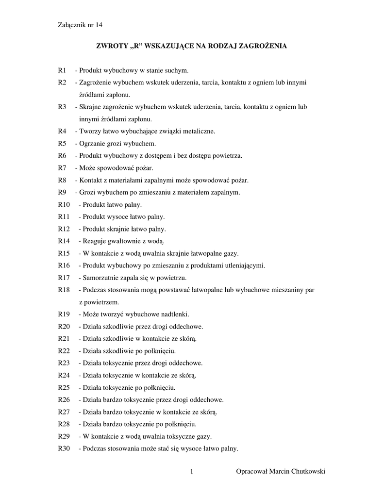 Zał cznik nr 14 ZWROTY „R” WSKAZUJ CE NA RODZAJ ZAGRO ENIA R1 - Produkt wybuchowy w stanie suchym. R2 - Zagro enie wybuchem wskutek uderzenia, tarcia, kontaktu z ogniem lub innymi ródłami zapłonu. R3 - Skrajne zagro enie wybuchem wskutek uderzenia, tarcia, kontaktu z ogniem lub innymi ródłami zapłonu. R4 - Tworzy łatwo wybuchaj ce zwi zki metaliczne. R5 - Ogrzanie grozi wybuchem. R6 - Produkt wybuchowy z dost pem i bez dost pu powietrza. R7 - Mo e spowodowa po ar. R8 - Kontakt z materiałami zapalnymi mo e spowodowa po ar. R9 - Grozi wybuchem po zmieszaniu z materiałem zapalnym. R10 - Produkt łatwo palny. R11 - Produkt wysoce łatwo palny. R12 - Produkt skrajnie łatwo palny. R14 - Reaguje gwałtownie z wod . R15 - W kontakcie z wod uwalnia skrajnie łatwopalne gazy. R16 - Produkt wybuchowy po zmieszaniu z produktami utleniaj cymi. R17 - Samorzutnie zapala si w powietrzu. R18 - Podczas stosowania mog powstawa łatwopalne lub wybuchowe mieszaniny par z powietrzem. R19 - Mo e tworzy wybuchowe nadtlenki. R20 - Działa szkodliwie przez drogi oddechowe. R21 - Działa szkodliwie w kontakcie ze skór . R22 - Działa szkodliwie po połkni ciu. R23 - Działa toksycznie przez drogi oddechowe. R24 - Działa toksycznie w kontakcie ze skór . R25 - Działa toksycznie po połkni ciu. R26 - Działa bardzo toksycznie przez drogi oddechowe. R27 - Działa bardzo toksycznie w kontakcie ze skór . R28 - Działa bardzo toksycznie po połkni ciu. R29 - W kontakcie z wod uwalnia toksyczne gazy. R30 - Podczas stosowania mo e sta si wysoce łatwo palny. 1 Opracował Marcin Chutkowski Zał cznik nr 14 R31 - W kontakcie z kwasami uwalnia toksyczne gazy. R32 - W kontakcie z kwasami uwalnia bardzo toksyczne gazy. R33 - Niebezpiecze stwo kumulacji w organizmie. R34 - Powoduje oparzenia. R35 - Powoduje powa ne oparzenia. R36 - Działa dra ni co na oczy. R37 - Działa dra ni co na drogi oddechowe. R38 - Działa dra ni co na skór . R39 - Zagra a powstaniem bardzo powa nych nieodwracalnych zmian w stanie zdrowia. R40 - Ograniczone dowody działania rakotwórczego. R41 - Ryzyko powa nego uszkodzenia oczu. R42 - Mo e powodowa uczulenie w nast pstwie nara enia drog oddechow . R43 - Mo e powodowa uczulenie w kontakcie ze skór . R44 - Zagro enie wybuchem po ogrzaniu w zamkni tym pojemniku. R45 - Mo e powodowa raka. R46 - Mo e powodowa dziedziczne wady genetyczne. R48 - Stwarza powa ne zagro enie zdrowia w nast pstwie długotrwałego nara enia. R49 - Mo e powodowa raka w nast pstwie nara enia drog oddechow . R50 - Działa bardzo toksycznie na organizmy wodne. R51 - Działa toksycznie na organizmy wodne. R52 - Działa szkodliwie na organizmy wodne. R53 - Mo e powodowa długo utrzymuj ce si niekorzystne zmiany w rodowisku wodnym. R54 - Działa toksycznie na ro liny. R55 - Działa toksycznie na zwierz ta. R56 - Działa toksycznie na organizmy glebowe. R57 - Działa toksycznie na pszczoły. R58 - Mo e powodowa długo utrzymuj ce si niekorzystne zmiany w rodowisku. R59 - Stwarza zagro enie dla warstwy ozonowej. R60 - Mo e upo ledza płodno . R61 - Mo e działa szkodliwie na dziecko w łonie matki. R62 - Mo liwe ryzyko upo ledzenia płodno ci. R63 - Mo liwe ryzyko szkodliwego działania na dziecko w łonie matki. R64 - Mo e oddziaływa szkodliwie na dzieci karmione piersi . 2 Opracował Marcin Chutkowski Zał cznik nr 14 R65 - Działa szkodliwie; mo e powodowa uszkodzenie płuc w przypadku połkni cia. R66 - Powtarzaj ce si nara enie mo e powodowa wysuszanie lub p kanie skóry. R67 - Pary mog wywoływa uczucie senno ci i zawroty głowy. R68 - Mo liwe ryzyko powstania nieodwracalnych zmian w stanie zdrowia. Ł CZONE ZWROTY R R14/15 - Reaguje gwałtownie z wod , uwalniaj c skrajnie łatwo palne gazy. R15/29 - W kontakcie z wod uwalnia skrajnie - łatwo palne, toksyczne gazy. R20/21 - Działa szkodliwie przez drogi oddechowe i w kontakcie ze skór . R20/22 - Działa szkodliwie przez drogi oddechowe i po połkni ciu. R20/21/22 - Działa szkodliwie przez drogi oddechowe, w kontakcie ze skór i po połkni ciu. R21/22 - Działa szkodliwie w kontakcie ze skór i po połkni ciu. R23/24 - Działa toksycznie przez drogi oddechowe i w kontakcie ze skór . R23/25 - Działa toksycznie przez drogi oddechowe i po połkni ciu. R23/24/25 - Działa toksycznie przez drogi oddechowe, w kontakcie ze skór i po połkni ciu. R24/25 - Działa toksycznie w kontakcie ze skór i po połkni ciu. R26/27 - Działa bardzo toksycznie przez drogi oddechowe i w kontakcie ze skór . R26/28 - Działa bardzo toksycznie przez drogi oddechowe i po połkni ciu. R26/27/28 - Działa bardzo toksycznie przez drogi oddechowe, w kontakcie ze skór i po połkni ciu. R27/28 - Działa bardzo toksycznie w kontakcie ze skór i po połkni ciu. R36/37 - Działa dra ni co na oczy i drogi oddechowe. R36/38 - Działa dra ni co na oczy i skór . R36/37/38 - Działa dra ni co na oczy, drogi oddechowe i skór . R37/38 - Działa dra ni co na drogi oddechowe i skór . R39/23 - Działa toksycznie przez drogi oddechowe; zagra a powstaniem bardzo powa nych nieodwracalnych zmian w stanie zdrowia. R39/24 - Działa toksycznie w kontakcie ze skór ; zagra a powstaniem bardzo powa nych nieodwracalnych zmian w stanie zdrowia. 3 Opracował Marcin Chutkowski Zał cznik nr 14 R39/25 - Działa toksycznie po połkni ciu; zagra a powstaniem bardzo powa nych nieodwracalnych zmian w stanie zdrowia. R39/23/24 - Działa toksycznie przez drogi oddechowe i w kontakcie ze skór ; zagra a powstaniem bardzo powa nych nieodwracalnych zmian w stanie zdrowia. R39/23/25 - Działa toksycznie przez drogi oddechowe i po połkni ciu; zagra a powstaniem bardzo powa nych nieodwracalnych zmian w stanie zdrowia. R39/24/25 - Działa toksycznie w kontakcie ze skór i po połkni ciu; zagra a powstaniem bardzo powa nych nieodwracalnych zmian w stanie zdrowia. R39/23/24/25 - Działa toksycznie przez drogi oddechowe, w kontakcie ze skór i po połkni ciu; zagra a powstaniem bardzo powa nych nieodwracalnych zmian w - st