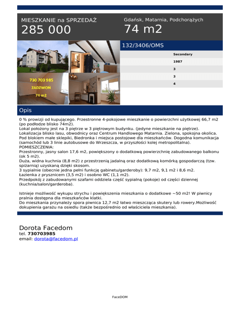 MIESZKANIE na SPRZEDAŻ 285 000 Gdańsk, Matarnia, Podchorążych 74 m2 132/3406/OMS Secondary 1987 3 3 4 Opis 0 % prowizji od kupującego. Przestronne 4-pokojowe mieszkanie o powierzchni użytkowej 66,7 m2 (po podłodze blisko 74m2). Lokal położony jest na 3 piętrze w 3 piętrowym budynku. (jedyne mieszkanie na piętrze). Lokalizacja blisko lasu, obwodnicy oraz Centrum Handlowego Matarnia. Zielona, spokojna okolica. Pod blokiem małe sklepiki, Biedronka i miejsca postojowe dla mieszkańców. Dogodna komunikacja (samochód lub 3 linie autobusowe do Wrzeszcza, w przyszłości kolej metropolitalna). POMIESZCZENIA: Przestronny, jasny salon 17,6 m2, powiększony o dodatkową powierzchnię zabudowanego balkonu (ok 5 m2). Duża, widna kuchnia (8,8 m2) z przestrzenią jadalną oraz dodatkową komórką gospodarczą (tzw. spiżarnią) uzyskaną dzięki skosom. 3 sypialnie (obecnie jedna pełni funkcję gabinetu/garderoby): 9,7 m2, 9,1 m2 i 8,6 m2. Łazienka z prysznicem (3,5 m2) i osobno WC (1,1 m2). Przedpokój z zabudowanymi szafami oddziela część sypialną (pokoje) od części dziennej (kuchnia/salon/garderoba). Istnieje możliwość wykupu strychu i powiększenia mieszkania o dodatkowe ~50 m2! W piwnicy pralnia dostępna dla mieszkańców klatki. Do mieszkania przynależy spora piwnica 12,7 m2 łatwo mieszcząca skutery lub rowery.Możliwość dokupienia garażu na osiedlu (także bezpośrednio od właściciela mieszkania). Dorota Facedom tel. 730703985 email: [email protected] FaceDOM Powered by TCPDF (www.tcpdf.org)