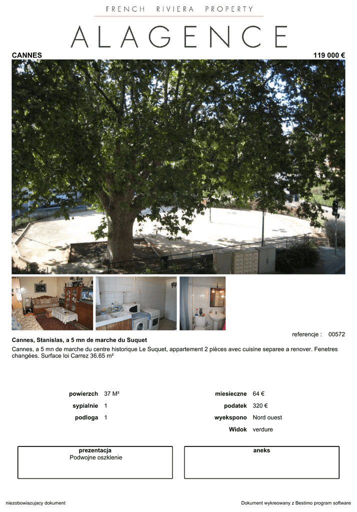 CANNES 119 000 € referencje : 00572 Cannes, Stanislas, a 5 mn de marche du Suquet Cannes, a 5 mn de marche du centre historique Le Suquet, appartement 2 pièces avec cuisine separee a renover. Fenetres changées. Surface loi Carrez 36.65 m² powierzch 37 M² miesieczne sypialnie 1 podatek podloga 1 wyekspono Widok prezentacja Podwojne oszklenie niezobowiazujacy dokument 64 € 320 € Nord ouest verdure aneks Dokument wykreowany z Bestimo program software