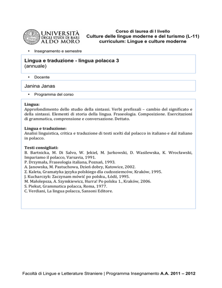 Corso di laurea di I livello Culture delle lingue moderne e del turismo (L-11) curriculum: Lingue e culture moderne • Insegnamento e semestre Lingua e traduzione - lingua polacca 3 (annuale) • Docente Janina Janas • Programma del corso Lingua: Approfondimento dello studio della sintassi. Verbi prefissali – cambio del significato e della sintassi. Elementi di storia della lingua. Fraseologia. Composizione. Esercitazioni di grammatica, comprensione e conversazione. Dettato. Lingua e traduzione: Analisi linguistica, critica e traduzione di testi scelti dal polacco in italiano e dal italiano in polacco. Testi consigliati: B. Bartnicka, M. Di Salvo, W. Jekiel, M. Jurkowski, D. Wasilewska, K. Wrocławski, Impariamo il polacco, Varsavia, 1991. P. Drzymała, Fraseologia italiana, Poznań, 1993. A. Janowska, M. Pastuchowa, Dzień dobry, Katowice, 2002. Z. Kaleta, Gramatyka języka polskiego dla cudzoziemców, Kraków, 1995. J. Kucharczyk: Zaczynam mówić po polsku., Łódź, 1995. M. Małolepsza, A. Szymkiewicz, Hurra! Po polsku 1., Kraków, 2006. S. Piekut, Grammatica polacca, Roma, 1977. C. Verdiani, La lingua polacca, Sansoni Editore. Facoltà di Lingue e Letterature Straniere | Programma Insegnamento A.A. 2011 – 2012