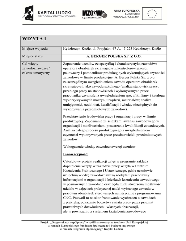 WIZYTA I Miejsce wyjazdu Miejsce stażu Cel wizyty zawodoznawczej / zakres tematyczny Kędzierzyn-Koźle, ul. Przyjaźni 47 A, 47-225 Kędzierzyn-Koźle A. BERGER POLSKA SP. Z O.O. Zapoznanie uczniów ze specyfiką i charakterystyką zawodów: operatora obrabiarek skrawających, kontrolerów jakości, pakowaczy i pomocników produkcyjnych wykonujących czynności zawodowe w firmie produkcyjnej A. Berger Polska Sp. z o.o. ze szczególnym uwzględnieniem zawodu operatora obrabiarek skrawających jako zawodu szkolnego (analiza stanowisk pracy, przebiegu pracy na stanowiskach i wykonywanych przez pracownika czynności z uwzględnieniem specyfiki firmy i katalogu wykorzystywanych maszyn, urządzeń, materiałów; analiza umiejętności, uzdolnień, kwalifikacji i wiedzy niezbędnych do wykonywania przedmiotowych zawodów). Przedstawienie środowiska pracy i organizacji pracy w firmie produkcyjnej. Zapoznanie ze ścieżkami awansu zawodowego w organizacji i możliwościami poszerzania kwalifikacji zawodowych. Analiza całego procesu produkcyjnego z uwzględnieniem czynności wykonywanych przez przedstawicieli przedmiotowych zawodów. Wzbogacenie wiedzy zawodoznawczej uczniów. Innowacyjność: Całościowy projekt realizacji zajęć w programie zakłada dopełnienie wizyty w zakładzie pracy wizytą w Centrum Kształcenia Praktycznego i Ustawicznego, gdzie uczniowie uzupełnią wiedzę zawodoznawczą zdobytą u pracodawcy informacjami o organizacji i ścieżkach kształcenia zawodowego w poznawanych zawodach oraz będą mieli stworzoną możliwość udziału w zajęciach praktycznej nauki wybranego zawodu w pracowni obrabiarek sterowanych numerycznie i programowania CNC. Pozwoli to na skonfrontowanie wyobrażeń o zawodach z praktyką, pokazanie bogactwa świata pracy przez pryzmat prawdziwych doświadczeń i własnych obserwacji, ale w powiązaniu z systemem kształcenia zawodowego Projekt „Drogowskazy współpracy” współfinansowany ze środków Unii Europejskiej w ramach Europejskiego Funduszu Społecznego i budżetu krajowego w ramach Programu Operacyjnego Kapitał Ludzki i ustawicznego. Patrz powiązanie wizyty I i V w niniejszym harmonogramie. Metody pracy doradcy oraz środki dydaktyczne Wykorzystywane metody pracy: praca z grupą, obserwacja uczestnicząca (czynności wykonywanych na stanowiskach pracy, obsługi i działania maszyn i urządzeń, środowiska pracy), możliwość samodzielnego wykonywania prostych zadanych czynności pod nadzorem, inscenizacja/pokaz, dyskusja. Środki dydaktyczne: prezentacje multimedialne, maszyny i urządzenia znajdujące się w parku maszynowym firmy (np. maszyny skrawające, urządzenia pomiarowe, stanowiska pracy wraz z wyposażeniem). Przebieg wizyty i wykorzystywane metody i środki: - - - - - prezentacja firmy obejmująca m.in jej historię, przegląd urządzeń, klientów i produktów poprowadzona przez przedstawiciela firmy Berger, wejście z technologiem zakładu na hale produkcyjne obserwacja i analiza stanowisk pracy i wykonywanych na nich czynności, specyfika i przebieg całościowego procesu produkcji, obserwacja działania maszyn i urządzeń z pokazem pracy maszyny skrawającej zrealizowanym przez operatora, spotkanie z uczniami odbywającymi praktyczną naukę zawodu w firmie, w zawodzie operatora obrabiarek skrawających, dział kontroli jakości w pokoju pomiarowym wykona dla uczestników wycieczki pokaz prowadzonych w trakcie produkcji pomiarów i zaprezentuje nowoczesne przyrządy pomiarowe wykorzystywane w codziennej produkcji, przedstawiciel firmy Berger omówi ścieżki awansu zawodowego dla operatorów maszyn (od dnia zatrudnienia do najwyższego stopnia awansu czyli ustawiacza maszyn) ze szczegółowym uwzględnieniem sytuacji osób uzyskujących wykształcenie kierunkowe w zawodzie operatora obrabiarek skrawających uzupełnione praktyką w firmie Berger, Projekt „Drogowskazy współpracy” współfinansowany ze środków Unii Europejskiej w ramach Europejskiego Funduszu Społecznego i budżetu krajowego w ramach Programu Operacyjnego Kapitał Ludzki w trakcie wszystkich etapów wizyty zawodoznawczej uczniowie będą mieli możliwość zadawania pytań pracownikom firmy, w tym również pracującym na maszynach operatorom. UWAGI Pracodawcy trzeba dostarczyć przed wizytą pełną listę uczestników wraz z ich rozmiarami obuwia – ze względu na przepisy BHP i wymóg posiadania obuwia ochronnego na halach produkcyjnych. WIZYTA II Miejsce wyjazdu Miejsce stażu Cel wizyty zawodoznawczej / zakres tematyczny Bierawa, ul. Gliwicka 8, 47 – 240 Bierawa ENERGOPOL-TP ELBUD S.A. Zapoznanie uczniów ze specyfiką i charakterystyką zawodów: elektromonter, ślusarz oraz inżynier elektryk wykonujących codzienne obowiązki zawodowe w firmie ENERGOPOL-TP ELBUD S.A. (analiza stanowisk pracy, przebiegu pracy na stanowiskach i wykonywanych przez pracowników czynności z uwzględnieniem specyfiki firmy i jej parku maszynowego, zaplecza materiałowego; analiza umiejętności, wiedzy i kwalifikacji zawodowych niezbędnych do wykonywania pracy w w/w zawodach). Przedstawienie uczniom środowiska pracy firmy prowadzącej działalność w środowisku międzynarodowym. Zapoznanie uczniów ze ścieżkami awansu zawodowego w organizacji a także polityką firmy odnoszącą się do zarządzania zasobami ludzkimi w zakresie wiedzy, kwalifikacji i umiejętności personelu mającego wpływ na jakość produkcji i usług świadczonych przez firmę. Konfrontacja wyobrażeń o zawodach z praktyką, pokazanie bogactwa świata pracy przez pryzmat prawdziwych doświadczeń i własnych obserwacji. Wzbogacenie wiedzy zawodoznawczej uczniów. Innowacyjność: Całościowy projekt realizacji zajęć w programie zakłada dopełnienie wizyty w zakładzie pracy wizytą w Centrum Projekt „Drogowskazy współpracy” współfinansowany ze środków Unii Europejskiej w ramach Europejskiego Funduszu Społecznego i budżetu krajowego w ramach Programu Opera