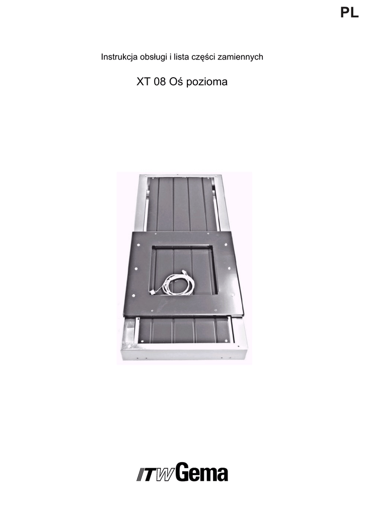 PL Instrukcja obs³ugi i lista czêœci zamiennych XT 08 Oœ pozioma Wydanie 02/02 XT 08 Oœ Pozioma Spis treœci 1. Bezpieczeñstwo pracy . . . . . . . . . . . . . . . . . . . . . . . . . . . . . . . . . . . . . . . . . . . . . . . . . . . . . . . . . 1.1 Bezpieczeñstwo obs³uguj¹cych . . . . . . . . . . . . . . . . . . . . . . . . . . . . . . . . . . . . . . . . . . . . . . . 1.2 Zasady bezpieczeñstwa . . . . . . . . . . . . . . . . . . . . . . . . . . . . . . . . . . . . . . . . . . . . . . . . . 1.3 Przeznaczenie u¿ycia . . . . . . . . . . . . . . . . . . . . . . . . . . . . . . . . . . . . . . . . . . . . . . . . . . . 1 1 1 1 2. Opis produktu . . . . . . . . . . . . . . . . . . . . . . . . . . . . . . . . . . . . . . . . . . . . . . . . . . . . . . . . . . . . . . . . 2.1 Zakres stosowania . . . . . . . . . . . . . . . . . . . . . . . . . . . . . . . . . . . . . . . . . . . . . . . . . . . . . . 2.2 Opis. . . . . . . . . . . . . . . . . . . . . . . . . . . . . . . . . . . . . . . . . . . . . . . . . . . . . . . . . . . . . . . . . . 2.3 Identyfikacja produktu . . . . . . . . . . . . . . . . . . . . . . . . . . . . . . . . . . . . . . . . . . . . . . . . . . . . 2.4 Parametry techniczne . . . . . . . . . . . . . . . . . . . . . . . . . . . . . . . . . . . . . . . . . . . . . . . . . . . . 2.5 Widok i funkcje . . . . . . . . . . . . . . . . . . . . . . . . . . . . . . . . . . . . . . . . . . . . . . . . . . . . . . . . . 2.5.1 Widok g³ówny . . . . . . . . . . . . . . . . . . . . . . . . . . . . . . . . . . . . . . . . . . . . . . . . . . 2.5.2 Opis funkcji . . . . . . . . . . . . . . . . . . . . . . . . . . . . . . . . . . . . . . . . . . . . . . . . . . . . 2.5.3 Sposoby zabezpieczania i monitorowania . . . . . . . . . . . . . . . . . . . . . . . . . . . . 2 2 2 3 4 4 4 5 5 3. Uruchomienie . . . . . . . . . . . . . . . . . . . . . . . . . . . . . . . . . . . . . . . . . . . . . . . . . . . . . . . . . . . . . . . . 3.1 Ustawienie i monta¿ . . . . . . . . . . . . . . . . . . . . . . . . . . . . . . . . . . . . . . . . . . . . . . . . . . . . . 3.1.1 Pod³¹czenie osi XT 08 do manipulatora ZA02 . . . . . . . . . . . . . . . . . . . . . . . . . 3.1.2 Instalacja i pole dzia³ania . . . . . . . . . . . . . . . . . . . . . . . . . . . . . . . . . . . . . . . . . 3.1.3 Zainicjowanie startu . . . . . . . . . . . . . . . . . . . . . . . . . . . . . . . . . . . . . . . . . . . . . 6 6 6 8 8 4. Dzia³anie . . . . . . . . . . . . . . . . . . . . . . . . . . . . . . . . . . . . . . . . . . . . . . . . . . . . . . . . . . . . . . . . . . . . . 8 5. Dozór . . . . . . . . . . . . . . . . . . . . . . . . . . . . . . . . . . . . . . . . . . . . . . . . . . . . . . . . . . . . . . . . . . . . . . . 9 5.1 Plan dozoru . . . . . . . . . . . . . . . . . . . . . . . . . . . . . . . . . . . . . . . . . . . . . . . . . . . . . . . . . . . . 9 6. Korygowanie b³êdów . . . . . . . . . . . . . . . . . . . . . . . . . . . . . . . . . . . . . . . . . . . . . . . . . . . . . . . . . . . 9 Wydanie 02/02 . . . . . . . . . . . . . . . . . . . . . . . . . . . . . . . . . . . . . . . . . . . . . . . . . . . . . . . . 10 . . 7. Lista czêœci zamiennych 7.1 Sposób zamawiania czêœci . . . . . . . . . . . . . . . . . . . . . . . . . . . . . . . . . . . . . . . . . . . . . . . 10 7.2 Lista czêœci zamiennych (oœ kompletna) . . . . . . . . . . . . . . . . . . . . . . . . . . . . . . . . . . . . . 10 7.3 Lista czêœci zamiennych (jednostka napêdowa) . . . . . . . . . . . . . . . . . . . . . . . . . . . . . . . 12 7.4 Lista czêœci zamiennych (³o¿yskowane ko³o toczne / ³o¿yskowane ko³o prowadz¹ce) . . . . . . . . . . . . . . . . . . . . . . . . . . . . . . . . . . . . . . . . . . . . 13 XT 08 Oœ Pozioma Wydanie 02/02 XT 08 Oœ Pozioma 1. Bezpieczeñstwo pracy 1.1 Bezpieczeñstwo obs³ugi Oœ poziom¹ mo¿na uruchomiæ i obs³ugiwaæ dopiero po dok³adnym przeczytaniu tej instrukcji obs³ugi. Niew³aœciwa obs³uga osi lub sterowania mo¿e prowadziæ do obra¿eñ personelu, tak¿e do uszkodzenia osi lub innych czêœci. Wszystkie ruchome osie musz¹ byæ zabezpieczone przed uruchomieniem i w czasie dzia³ania przez koñcowego odbiorcê. Zgodnie z lokalnymi przepisami nale¿y zabezpieczyæ obszar wokó³ urz¹dzenia. Przed uruchomieniem sprawdziæ uziemienie osi! Nie demontowaæ, otwarta pokrywa mo¿e stwarzaæ niebezpieczeñstwo zgniecenia lub prowadziæ do innych powa¿nych obra¿eñ. Zabezpieczenia ochronne musz¹ byæ stosowane przy pracy i nie nale¿y ich pomijaæ. Prace zwi¹zane z dozorem Osi poziomej XT 08 mog¹ byæ wykonywane tylko wtedy, gdy jednostka jest na podstawie. Jednostka musi byæ kompletnie wy³¹czona, a w³¹cznik g³ówny i inne przyciski zablokowane. 1.2 Zasady bezpieczeñstwa Oœ pozioma XT 08 jest podzespo³em jednostki zintegrowanej z systemem zabezpieczeñ ca³ego urz¹dzenia. Do niestandardowego zastosowania musz¹ dopasowane odpowiednie warunki pracy. Nale¿y u¿ywaæ tylko oryginalnych czêœci firmy ITW Gema. Stosowanie czêœci innego pochodzenia grozi utrat¹ gwarancji. Wszelkie naprawy osi mog¹ byæ wykonywane jedynie przez Serwis firmy ITW Gema. 1.3 Przeznaczenie u¿ycia Wydanie 02/02 Oœ pozioma ma zastosowanie tylko w dok³adnie okreœlonym zakresie dzia³ania. U¿ycie osi poza tym zakresem bêdzie uwa¿ane za niezgodne z przeznaczeniem. XT 08 Oœ Pozioma 1 2. Opis produktu 2.1 Zakres stosowania Oœ pozioma XT 08 ma zastosowanie tam, gdzie maluje siê detale o zró¿nicowanej g³êbokoœci w jednej operacji przy czêstych zmianach detalu. Oœ pozioma XT 08 mo¿e byæ u¿ywana razem z manipulatorami ZA0. 2.2 Opis Manipulator ZA Oœ Pozioma XT 08 Rys. 1 Oœ pozioma XT 08 z manipulatorem ZA0. Oœ XT 08 posiada nastêpuj¹c¹ charakterystykê: U¿ywanie tych samych jednostek steruj¹cych, co do manipulatora ZA02 Swobodne wybieranie pozycji poprzez sterownik CR03 Zainstalowane nó¿ki poziomuj¹ce Wymagana minimalna przestrzeñ dzia³ania Nie wymaga wiêcej wolnej prz