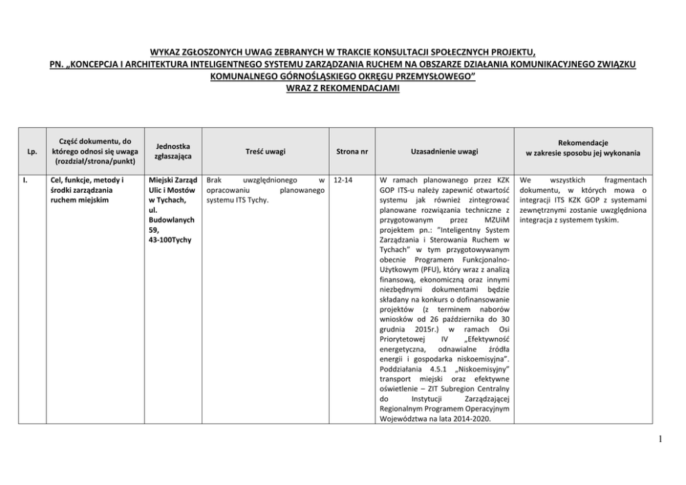 WYKAZ ZGŁOSZONYCH UWAG ZEBRANYCH W TRAKCIE KONSULTACJI SPOŁECZNYCH PROJEKTU, PN. „KONCEPCJA I ARCHITEKTURA INTELIGENTNEGO SYSTEMU ZARZĄDZANIA RUCHEM NA OBSZARZE DZIAŁANIA KOMUNIKACYJNEGO ZWIĄZKU KOMUNALNEGO GÓRNOŚLĄSKIEGO OKRĘGU PRZEMYSŁOWEGO” WRAZ Z REKOMENDACJAMI Lp. I. Część dokumentu, do którego odnosi się uwaga (rozdział/strona/punkt) Cel, funkcje, metody i środki zarządzania ruchem miejskim Jednostka zgłaszająca Miejski Zarząd Ulic i Mostów w Tychach, ul. Budowlanych 59, 43-100Tychy Treść uwagi Brak uwzględnionego w opracowaniu planowanego systemu ITS Tychy. Strona nr 12-14 Uzasadnienie uwagi W ramach planowanego przez KZK GOP ITS-u należy zapewnić otwartość systemu jak również zintegrować planowane rozwiązania techniczne z przygotowanym przez MZUiM projektem pn.: ”Inteligentny System Zarządzania i Sterowania Ruchem w Tychach” w tym przygotowywanym obecnie Programem FunkcjonalnoUżytkowym (PFU), który wraz z analizą finansową, ekonomiczną oraz innymi niezbędnymi dokumentami będzie składany na konkurs o dofinansowanie projektów (z terminem naborów wniosków od 26 października do 30 grudnia 2015r.) w ramach Osi Priorytetowej IV „Efektywność energetyczna, odnawialne źródła energii i gospodarka niskoemisyjna”. Poddziałania 4.5.1 „Niskoemisyjny” transport miejski oraz efektywne oświetlenie – ZIT Subregion Centralny do Instytucji Zarządzającej Regionalnym Programem Operacyjnym Województwa na lata 2014-2020. Rekomendacje w zakresie sposobu jej wykonania We wszystkich fragmentach dokumentu, w których mowa o integracji ITS KZK GOP z systemami zewnętrznymi zostanie uwzględniona integracja z systemem tyskim. 1 Sprint S.A ul. Canaletta 4, 00-099 Warszawa Celowość uzupełnienia koncepcji o: 1.Wyznaczenie buspasów – bez nich priorytet dla autobusów jest często nieefektywny. 2.Uwzględnienie funkcji i wydzielenie stref „zone 30”. 3.Uwzględnienie roli roweru miejskiego w koncepcji ITS. Texel Sp. z o.o. ul. Goplańska 6A, 02-954 Warszawa 1. według koncepcji system kontroli ruchu powinien rejestrować następujące wykroczenia: a) przejazd pojazdów na czerwonym świetle na wybranych skrzyżowaniach, b) przekroczenie prędkości w określonych punktach oraz określonych odcinkach pomiarowych, c) przekroczenie dopuszczalnych nacisków osi. Jednakże zmiany dokonane w ustawie o ruchu drogowym odbierają możliwość karania kierowców przez Straże Miejskie za przewinienia z punktu a i b oraz nigdy nie mogły kontrolować wagi pojazdów – punkt c. w takim razie czy KZK GOP uzgodniła z Głównym Inspektoratem Transportu Drogowego, że pracownicy GITD będą korzystać z zainstalowanych systemów (de facto GITD będzie operatorem systemu) i na podstawie udokumentowanych wykroczeń będą mogli nakładać na kierowców mandaty karne, czy 8-16 oraz wynikające z tego uzupełnienia w treści całego dokumentu, szczególnie rozdziału VI. 14 Nowoczesne systemy ITS opierają się na multimodalności, a nie tylko obsłudze pojazdów samochodowych. Zadaniem systemu jest zapewnienie sprawnego przemieszczania się człowieka, a nie pojazdu. 1. Zmiana ustawy o ruchu drogowym powoduje, iż implementacja systemów pomiaru prędkości, detekcji pojazdów przejeżdżających na czerwonym świetle przez zarządców infrastruktury w miastach odbywać się będzie tylko do celów statystycznych, gdyż tylko GITD może nakładać na kierowców mandaty karne za wykroczenia drogowe w postaci przekroczenia prędkości czy przejazdu na czerwonym świetle. Czy koncepcja będzie zmieniana w tym zakresie czy GITD stanie się kolejną Instytucją wyłączoną w przygotowanie specyfikacji w późniejsze działanie systemu? Koncepcja dotyczy budowy inteligentnego systemu zarządzania ruchem na obszarze KZK GOP, uwzględniając istniejącą infrastrukturę. Projekt ze względu na zasady finansowania ze środków UE nie przewiduje realizacji inwestycji drogowych, np. budowy buspasów. Kwestie, wskazane w uwadze powinny zostać rozstrzygnięte np. w miejskich planach mobilności. Na etapie opracowywania programu funkcjonalno – użytkowego KZK GOP poinformuje GITD i inne służby o projektowanej funkcjonalności systemu i możliwości jego wykorzystania przez te podmioty. 2 RAINFOREST Krzysztof Kardaś, ul. Łangowskiego 24, 41-800 Zabrze system będzie działał tylko dla celów statystycznych (licząc ilość wykroczeń). W przypadku włączenia w inwestycje GITD na jakich zasadach będzie oparte korzystanie z zainstalowanych systemów przez GITD? 1. Główny konstrukt myślowy Koncepcji sprowadza się do schematu a. Przesłanka 1: główna praca przewozowa w konurbacji spoczywa na transporcie autobusowym b. Przesłanka 2: nie ma możliwości wydzielenia bus pasów w obszarze miast c. Wniosek: należy doprowadzić do poprawy płynności ruchu samochodowego jako całości i w szczególności osiągnąć lepsze parametry świadczenia usług przez PTP 2. Rozwiązanie (System) projektowany w Koncepcji powinien stanowić bazę infrastrukturalną i informacyjną dla wdrażania takich modeli biznesowych w obszarze transportu zbiorowego, które spowodują odpowiednie zwiększenie jego udziału w globalnej sumie przewozów (np. Demand Responsive Transport, Harmonious Mobility Network (TOYOTA Global Vision) Mobility as a Service) 13 Ad. 1 Czas przygotowania projektu, jego przeprowadzenia i trwałości Ad. 1 Projekt ma być realizowany z środków UE, dlatego musi uwzględniać cele i ramy realizacyjne programu operacyjnego, z którego ma być finansowany. 13 Ad. 2 Zarówno podział na podsystemy i ich zakres jak i koszt budowy wskazują na inny priorytet: upłynnienie ruchu Ad. 2 Koncepcja nie jest dokumentem technicznym, dlatego też nie zawiera szczegółowych rozwiązań w tym zakresie. Wskazuje na ogólne założenia związane z wdrożeniem ITS na obszarze KZK GOP, z uwzględnieniem dostępnych rozwiązań technicznych. 3 3. Koncepcja powinna zawi