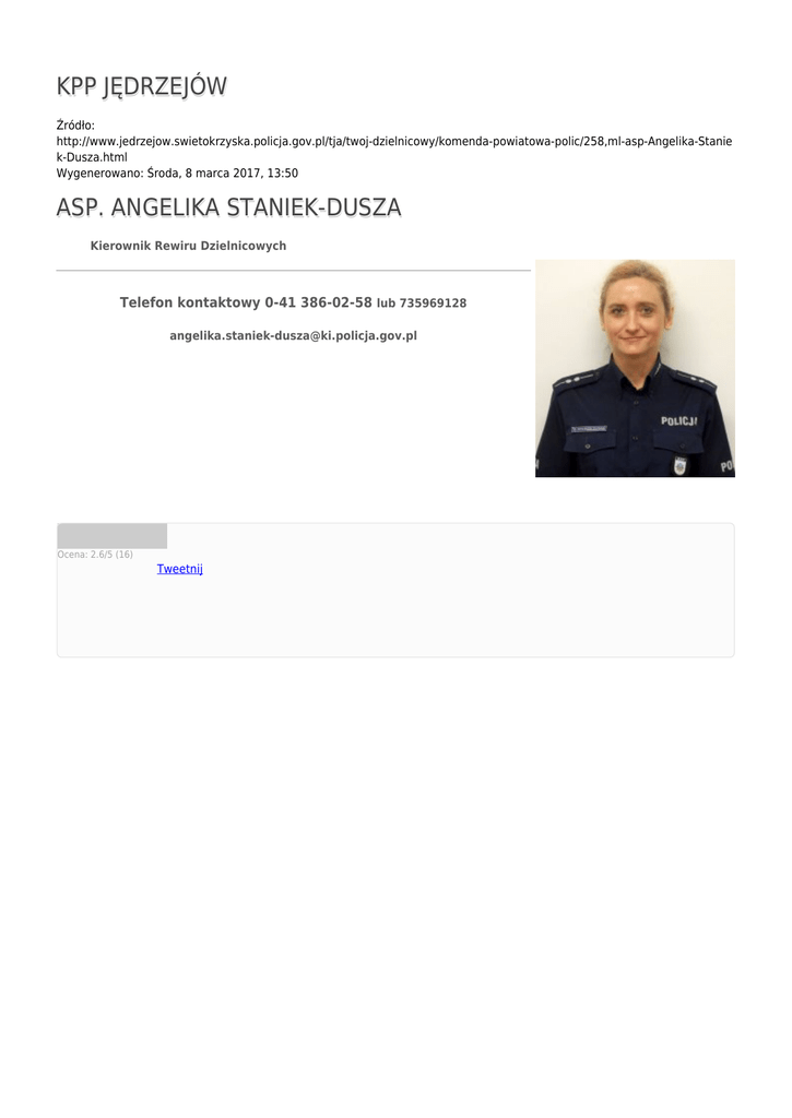 KPP JĘDRZEJÓW Źródło: http://www.jedrzejow.swietokrzyska.policja.gov.pl/tja/twoj-dzielnicowy/komenda-powiatowa-polic/258,ml-asp-Angelika-Stanie k-Dusza.html Wygenerowano: Środa, 8 marca 2017, 13:50 ASP. ANGELIKA STANIEK-DUSZA Kierownik Rewiru Dzielnicowych Telefon kontaktowy 0-41 386-02-58 lub 735969128 [email protected] Ocena: 2.6/5 (16) Tweetnij