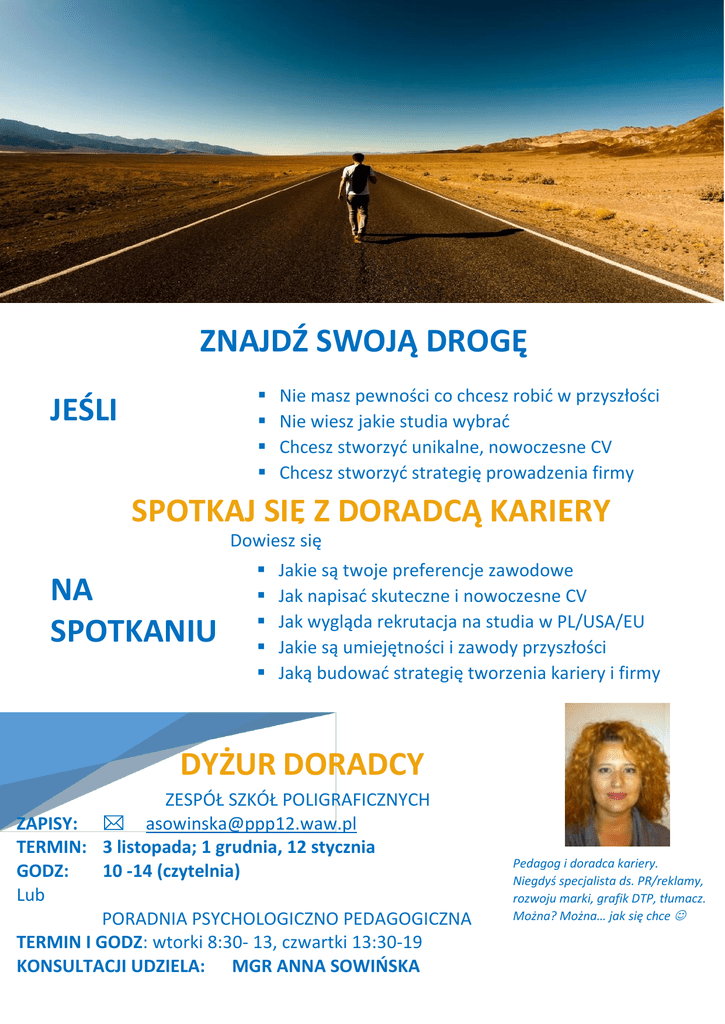 ZNAJDŹ SWOJĄ DROGĘ JEŚLI Nie masz pewności co chcesz robić w przyszłości Nie wiesz jakie studia wybrać Chcesz stworzyć unikalne, nowoczesne CV Chcesz stworzyć strategię prowadzenia firmy SPOTKAJ SIĘ Z DORADCĄ KARIERY Dowiesz się NA SPOTKANIU Jakie są twoje preferencje zawodowe Jak napisać skuteczne i nowoczesne CV Jak wygląda rekrutacja na studia w PL/USA/EU Jakie są umiejętności i zawody przyszłości Jaką budować strategię tworzenia kariery i firmy DYŻUR DORADCY ZESPÓŁ SZKÓŁ POLIGRAFICZNYCH ZAPISY: [email protected] TERMIN: 3 listopada; 1 grudnia, 12 stycznia GODZ: 10 -14 (czytelnia) Lub PORADNIA PSYCHOLOGICZNO PEDAGOGICZNA TERMIN I GODZ: wtorki 8:30- 13, czwartki 13:30-19 KONSULTACJI UDZIELA: MGR ANNA SOWIŃSKA Pedagog i doradca kariery. Niegdyś specjalista ds. PR/reklamy, rozwoju marki, grafik DTP, tłumacz. Można? Można… jak się chce
