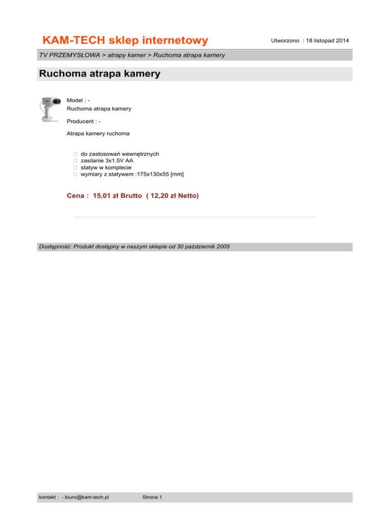 KAM-TECH sklep internetowy TV PRZEMYSŁOWA > atrapy kamer > Ruchoma atrapa kamery Ruchoma atrapa kamery Model : Ruchoma atrapa kamery Producent : Atrapa kamery ruchoma � do zastosowań wewnętrznych � zasilanie 3x1.5V AA � statyw w komplecie � wymiary z statywem :175x130x55 [mm] Cena : 15,01 zł Brutto ( 12,20 zł Netto) Dostępność: Produkt dostępny w naszym sklepie od 30 październik 2005 kontakt : - [email protected] Strona 1 Utworzono : 18 listopad 2014