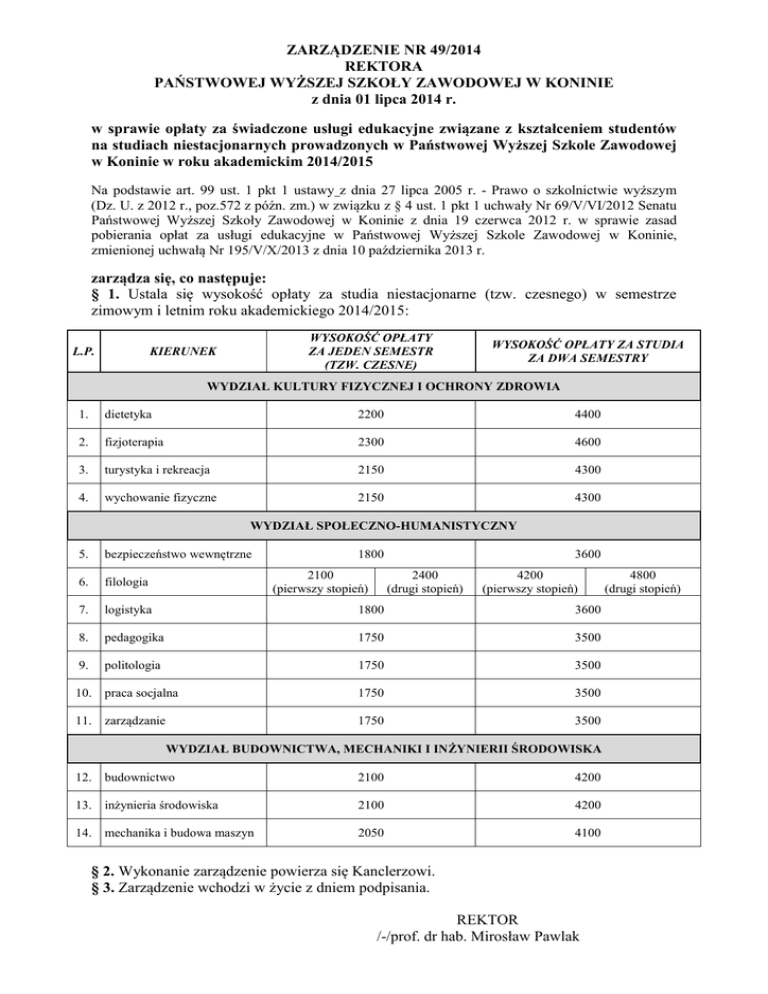 ZARZĄDZENIE NR 49/2014 REKTORA PAŃSTWOWEJ WYŻSZEJ SZKOŁY ZAWODOWEJ W KONINIE z dnia 01 lipca 2014 r. w sprawie opłaty za świadczone usługi edukacyjne związane z kształceniem studentów na studiach niestacjonarnych prowadzonych w Państwowej Wyższej Szkole Zawodowej w Koninie w roku akademickim 2014/2015 Na podstawie art. 99 ust. 1 pkt 1 ustawy z dnia 27 lipca 2005 r. - Prawo o szkolnictwie wyższym (Dz. U. z 2012 r., poz.572 z późn. zm.) w związku z § 4 ust. 1 pkt 1 uchwały Nr 69/V/VI/2012 Senatu Państwowej Wyższej Szkoły Zawodowej w Koninie z dnia 19 czerwca 2012 r. w sprawie zasad pobierania opłat za usługi edukacyjne w Państwowej Wyższej Szkole Zawodowej w Koninie, zmienionej uchwałą Nr 195/V/X/2013 z dnia 10 października 2013 r. zarządza się, co następuje: § 1. Ustala się wysokość opłaty za studia niestacjonarne (tzw. czesnego) w semestrze zimowym i letnim roku akademickiego 2014/2015: L.P. WYSOKOŚĆ OPŁATY ZA JEDEN SEMESTR (TZW. CZESNE) KIERUNEK WYSOKOŚĆ OPŁATY ZA STUDIA ZA DWA SEMESTRY WYDZIAŁ KULTURY FIZYCZNEJ I OCHRONY ZDROWIA 1. dietetyka 2200 4400 2. fizjoterapia 2300 4600 3. turystyka i rekreacja 2150 4300 4. wychowanie fizyczne 2150 4300 WYDZIAŁ SPOŁECZNO-HUMANISTYCZNY 5. bezpieczeństwo wewnętrzne 1800 6. filologia 7. logistyka 1800 3600 8. pedagogika 1750 3500 9. politologia 1750 3500 10. praca socjalna 1750 3500 11. zarządzanie 1750 3500 2100 (pierwszy stopień) 3600 2400 (drugi stopień) 4200 (pierwszy stopień) WYDZIAŁ BUDOWNICTWA, MECHANIKI I INŻYNIERII ŚRODOWISKA 12. budownictwo 2100 4200 13. inżynieria środowiska 2100 4200 14. mechanika i budowa maszyn 2050 4100 § 2. Wykonanie zarządzenie powierza się Kanclerzowi. § 3. Zarządzenie wchodzi w życie z dniem podpisania. REKTOR /-/prof. dr hab. Mirosław Pawlak 4800 (drugi stopień)