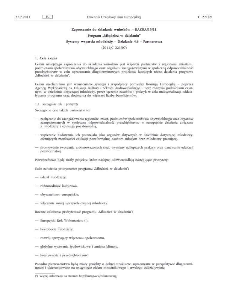 27.7.2011 PL Dziennik Urzędowy Unii Europejskiej Zaproszenie do składania wniosków – EACEA/13/11 Program „Młodzież w działaniu” Systemy wsparcia młodzieży – Działanie 4.6 – Partnerstwa (2011/C 221/07) 1. Cele i opis Celem niniejszego zaproszenia do składania wniosków jest wsparcie partnerstw z regionami, miastami, podmiotami społeczeństwa obywatelskiego oraz organami zaangażowanymi w społeczną odpowiedzialność przedsiębiorstw w celu opracowania długoterminowych projektów łączących różne działania programu „Młodzież w działaniu”. Celem mechanizmu jest wzmacnianie synergii i współpracy pomiędzy Komisją Europejską – poprzez Agencję Wykonawczą ds. Edukacji, Kultury i Sektora Audiowizualnego – oraz różnymi podmiotami czyn nymi w dziedzinie dotyczącej młodzieży, przez łączenie zasobów i praktyk w celu maksymalizacji oddzia ływania programu oraz docierania do większej liczby beneficjentów. 1.1. Szczególne cele i priorytety Szczególne cele takich partnerstw to: — zachęcanie do zaangażowania regionów, miast, podmiotów społeczeństwa obywatelskiego oraz organów zaangażowanych w społeczną odpowiedzialność przedsiębiorstw w europejskie działania związane z młodzieżą i edukacją pozaformalną, — wspieranie budowania ich potencjału jako organów aktywnych w dziedzinie dotyczącej młodzieży, oferujących możliwości edukacji pozaformalnej osobom młodym oraz młodzieży pracującej, — promowanie tworzenia zrównoważonych sieci, wymiany najlepszych praktyk oraz uznawanie edukacji pozaformalnej. Pierwszeństwo będą miały projekty, które najlepiej odzwierciedlają następujące priorytety: Stałe założenia priorytetowe programu „Młodzież w działaniu”: — udział młodzieży, — różnorodność kulturowa, — obywatelstwo europejskie, — włączenie mniej uprzywilejowanej młodzieży. Roczne założenia priorytetowe programu „Młodzież w działaniu”: — Europejski Rok Wolontariatu (1), — bezrobocie młodzieży, — rozwój sprzyjający włączeniu społecznemu, — globalne wyzwania środowiskowe i zmiana klimatu, — kreatywność i przedsiębiorczość. Ponadto pierwszeństwo będą miały projekty o dobrej strukturze, opracowane w perspektywie długotermi nowej i ukierunkowane na osiągnięcie efektu mnożnikowego i trwałego oddziaływania. (1) Więcej informacji na stronie: http://europa.eu/volunteering/ C 221/21 C 221/22 PL Dziennik Urzędowy Unii Europejskiej 1.2. Charakterystyka partnerstwa Niniejsze zaproszenie do składania wniosków ma na celu wspieranie rozwoju programu działań łączącego jedno lub kilka działań, które powstały na kanwie programu „Młodzież w działaniu”. Taki program działań może być: — realizowany bezpośrednio przez wnioskodawcę (procedura A), — lub realizowany we współpracy z „partnerem-współorganizatorem (partnerami-współorganizatorami)”, który jest w znacznym stopniu zaangażowany w opracowanie i realizację projektu i zostanie wskazany w czasie składania wniosku (procedura B). W obu przypadkach (procedura A i procedura B) w programie działań mogą brać udział „partnerzy stowarzyszeni”. Partnerzy stowarzyszeni biorą udział w realizacji proponowanych działań w ramach projektu, ale nie w takim samym stopniu i nie na takim samym poziomie udziału, jak partnerzy-współ organizatorzy. 2. Kwalifikujący się wnioskodawcy Wnioski są składane przez: — lokalny lub regionalny organ publiczny, — organizację nienastawioną na zysk prowadzącą działalność w dziedzinie pracy z młodzieżą na poziomie europejskim (ENGO), skupiającą organizacje członkowskie z co najmniej ośmiu krajów programu „Młodzież w działaniu”, — firmę, przedsiębiorstwo, organizację dochodową zaangażowaną w społeczną odpowiedzialność przed siębiorstw na rzecz młodzieży. Jeżeli projekt wskazuje na możliwość realizacji programu działań we współpracy z jednym lub większą liczbą współorganizatorów (procedura B), organizacje te mogą być: — lokalnymi lub regionalnymi organami publicznymi, lub — organizacjami pozarządowymi nienastawionymi na zysk, lub — organizacjami nienastawionymi na zysk prowadzącymi działalność w dziedzinie pracy z młodzieżą na szczeblu europejskim (ENGO), skupiającymi organizacje członkowskie z co najmniej ośmiu krajów programu „Młodzież w działaniu”, — firmami/przedsiębiorstwami/organizacjami dochodowymi zaangażowanymi w społeczną odpowiedzial ność przedsiębiorstw na rzecz młodzieży. Wnioskodawcy muszą posiadać osobowość prawną oraz muszą – w dniu upłynięcia terminu składania wniosków – co najmniej od dwóch lat posiadać oficjalną siedzibę w jednym z krajów uczestniczących w programie. Następujące kraje uczestniczą w programie: — państwa członkowskie Unii Europejskiej: Austria, Belgia, Bułgaria, Cypr, Czechy, Dania, Estonia, Finlandia, Francja, Grecja, Hiszpania, Holandia, Irlandia, Litwa, Luksemburg, Łotwa, Malta, Niemcy, Polska, Portugalia, Rumunia, Słowacja, Słowenia, Szwecja, Węgry, Wielka Brytania i Włochy, (1) (1) Osoby pochodzące z krajów i terytoriów zamorskich oraz, w stosownych przypadkach, instytucje publiczne lub prywatne mające tam siedzibę, kwalifikują się do udziału w programie „Młodzież w działaniu” według zasad okre ślonych w programie i ustaleń obowiązujących państwo członkowskie, z którym są związane. Lista krajów i terytoriów zamorskich znajduje się w załączniku 1A do decyzji Rady 2001/822/WE z 27 listopada 2001 r. w sprawie stowarzyszenia krajów i terytoriów zamorskich ze Wspólnotą Europejską („Decyzja o Stowarzyszeniu Zamorskim”) (Dz.U. L 314 z 30.11.2001): http://eur-lex.europa.eu/LexUriServ/LexUriServ.do?uri=CONSLEG: 2001D0822:20011202:PL:PDF 27.7.2011 27.7.2011 PL Dziennik Urzędowy Unii Europejskiej — państwa członkowskie Europejskiego Stowarzysze
