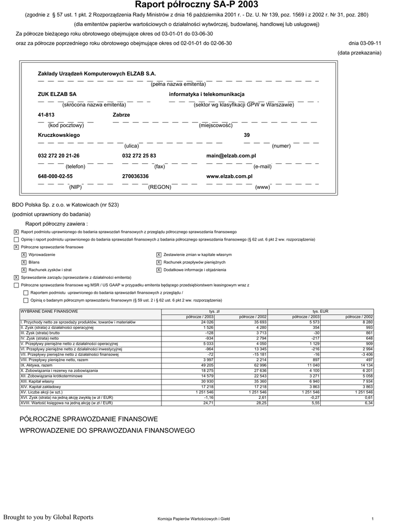 Raport póároczny SA-P 2003 (zgodnie z § 57 ust. 1 pkt. 2 Rozporządzenia Rady Ministrów z dnia 16 października 2001 r. - Dz. U. Nr 139, poz. 1569 i z 2002 r. Nr 31, poz. 280) (dla emitentów papierów wartościowych o działalności wytwórczej, budowlanej, handlowej lub usługowej) Za półrocze bieżącego roku obrotowego obejmujące okres od 03-01-01 do 03-06-30 oraz za półrocze poprzedniego roku obrotowego obejmujące okres od 02-01-01 do 02-06-30 dnia 03-09-11 (data przekazania) Zakáady UrządzeĔ Komputerowych ELZAB S.A. (pełna nazwa emitenta) ZUK ELZAB SA informatyka i telekomunikacja (skrócona nazwa emitenta) 4-83 (sektor wg klasyfikacji GPW w Warszawie) Zabrze (kod pocztowy) (miejscowość) Kruczkowskiego 39 (ulica) 032 272 20 2-26 (numer) 032 272 25 83 (telefon) 648-000-02-55 [email protected] (fax) (e-mail) 270036336 (NIP) www.elzab.com.pl (REGON) (www) BDO Polska Sp. z o.o. w Katowicach (nr 523) (podmiot uprawniony do badania) Raport półroczny zawiera : X Raport podmiotu uprawnionego do badania sprawozdań finansowych z przeglądu półrocznego sprawozdania finansowego Opinię i raport podmiotu uprawnionego do badania sprawozdań finansowych z badania półrocznego sprawozdania finansowego (§ 62 ust. 6 pkt 2 ww. rozporządzenia) X Półroczne sprawozdanie finansowe X Wprowadzenie X Zestawienie zmian w kapitale własnym X Bilans X Rachunek przepływów pieniężnych X Rachunek zysków i strat X Dodatkowe informacje i objaśnienia X Sprawozdanie zarządu (sprawozdanie z działalności emitenta) Półroczne sprawozdanie finansowe wg MSR / US GAAP w przypadku emitenta będącego przedsiębiorstwem leasingowym wraz z Raportem podmiotu uprawnionego do badania sprawozdań finansowych z przeglądu / Opinią o badanym półrocznym sprawozdaniu finansowym (§ 59 ust. 2 i § 62 ust. 6 pkt 2 ww. rozporządzenia) WYBRANE DANE FINANSOWE tys. zł półrocze / 2003 24 026 1 526 -128 -934 5 033 -964 -72 3 997 49 205 18 275 14 579 30 930 17 218 1 251 546 -1,16 24,71 I. Przychody netto ze sprzedaży produktów, towarów i materiałów II. Zysk (strata) z działalności operacyjnej III. Zysk (strata) brutto IV. Zysk (strata) netto V. Przepływy pieniężne netto z działalności operacyjnej VI. Przepływy pieniężne netto z działalności inwestycyjnej VII. Przepływy pieniężne netto z działalności finansowej VIII. Przepływy pieniężne netto, razem IX. Aktywa, razem X. Zobowiązania i rezerwy na zobowiązania XII. Zobowiązania krótkoterminowe XIII. Kapitał własny XIV. Kapitał zakładowy XV. Liczba akcji (w szt.) XVI. Zysk (strata) na jedną akcję zwykłą (w zł / EUR) XVIII. Wartość księgowa na jedną akcję (w zł / EUR) półrocze / 2002 35 693 4 280 3 713 2 794 4 050 13 345 -15 181 2 214 62 996 27 636 22 543 35 360 17 218 1 251 546 2,61 28,25 tys. EUR półrocze / 2003 5 573 354 -30 -217 1 129 -216 -16 897 11 040 4 100 3 271 6 940 3 863 1 251 546 -0,27 5,55 półrocze / 2002 8 280 993 861 648 909 2 994 -3 406 497 14 134 6 201 5 058 7 934 3 863 1 251 546 0,61 6,34 PÓŁROCZNE SPRAWOZDANIE FINANSOWE WPROWADZENIE DO SPRAWOZDANIA FINANSOWEGO Brought to you by Global Reports Komisja Papierów Wartościowych i Giełd 1 Raport biegáego rewidenta z przeglądu sprawozdania finansowego obejmującego okres od .0.2003 roku do 30.06.2003 roku Dla Akcjonariuszy, Rady Nadzorczej i Zarządu Zakáadów UrządzeĔ Komputerowych „ELZAB” S.A. Dokonaliśmy przeglądu załączonego sprawozdania finansowego Zakáadów UrządzeĔ Komputerowych „ELZAB” S.A. z siedzibą w Zabrzu, ul. Kruczkowskiego 39, na które składają się: − wprowadzenie do sprawozdania finansowego, − bilans sporządzony na dzień 30 czerwca 2003 roku, który po stronie aktywów i pasywów wykazuje sumę 49.205.00,84 zá, − rachunek zysków i strat za okres od 1 stycznia do 30 czerwca 2003 roku wykazujący stratę netto w wysokości 934.272,44 zá, − zestawienie zmian w kapitale własnym wykazujące zmniejszenie kapitału własnego o sumę 3.049.460,2 zá, − rachunek przepływów pieniężnych wykazujący zwiększenie stanu środków pieniężnych w okresie od 1 stycznia do 30 czerwca 2003 roku o kwotę 3.996.487,03 zá − dodatkowe informacje i objaśnienia. Za sporządzenie tego sprawozdania odpowiada Zarząd Zakładów Urządzeń Komputerowych „ELZAB” S.A. Naszym zadaniem było dokonanie przeglądu tego sprawozdania. Przegląd ten przeprowadziliśmy stosownie do przepisów ustawy o rachunkowości oraz norm wykonywania zawodu biegłego rewidenta, wydanych przez Krajową Radę Biegłych Rewidentów. Normy nakładają na nas obowiązek zaplanowania i przeprowadzenia przeglądu w taki sposób, aby uzyskać umiarkowaną pewność, że sprawozdanie finansowe nie zawiera istotnych nieprawidłowości. Przeglądu dokonaliśmy głównie drogą analizy danych sprawozdania finansowego, wglądu w księgi rachunkowe oraz wykorzystania informacji uzyskanych od kierownictwa oraz personelu odpowiedzialnego za finanse i księgowość spółki. Brought to you by Global Reports Zakres i metoda przeglądu śródrocznego sprawozdania finansowego istotnie różni się od badań leżących u podstaw opinii wydawanej o rzetelności, prawidłowości i jasności rocznego sprawozdania finansowego, dlatego nie możemy wydać takiej opinii o załączonym sprawozdaniu. Spółka posiada inwestycje długoterminowe w postaci akcji Geneza System S.A. o wartości 3.950 tys. zł. Z uwagi na fakt ujemnego kapitału własnego tej Spółki, istnieje ryzyko zawyżenia wartości akcji o kwotę 1.675 tys. zł, co skutkowałoby dodatkowym odpisem aktualizującym Uwzględniając powyższe, dokonany przez nas przegląd nie wykazał potrzeby dokonania innych istotnych zmian w załączonym sprawozdaniu finansowym, aby przedstawiało ono prawidłowo, rzetelnie i jasno sytuację majątkową i finansową spółki na dzień 30 czerwca 2003 roku oraz jej wynik finansowy za okres od 1 stycznia do 30 czerwca 2003 roku zgodnie z zasadami rachun