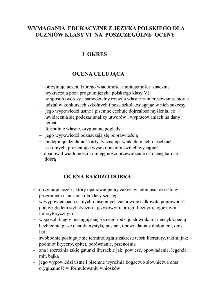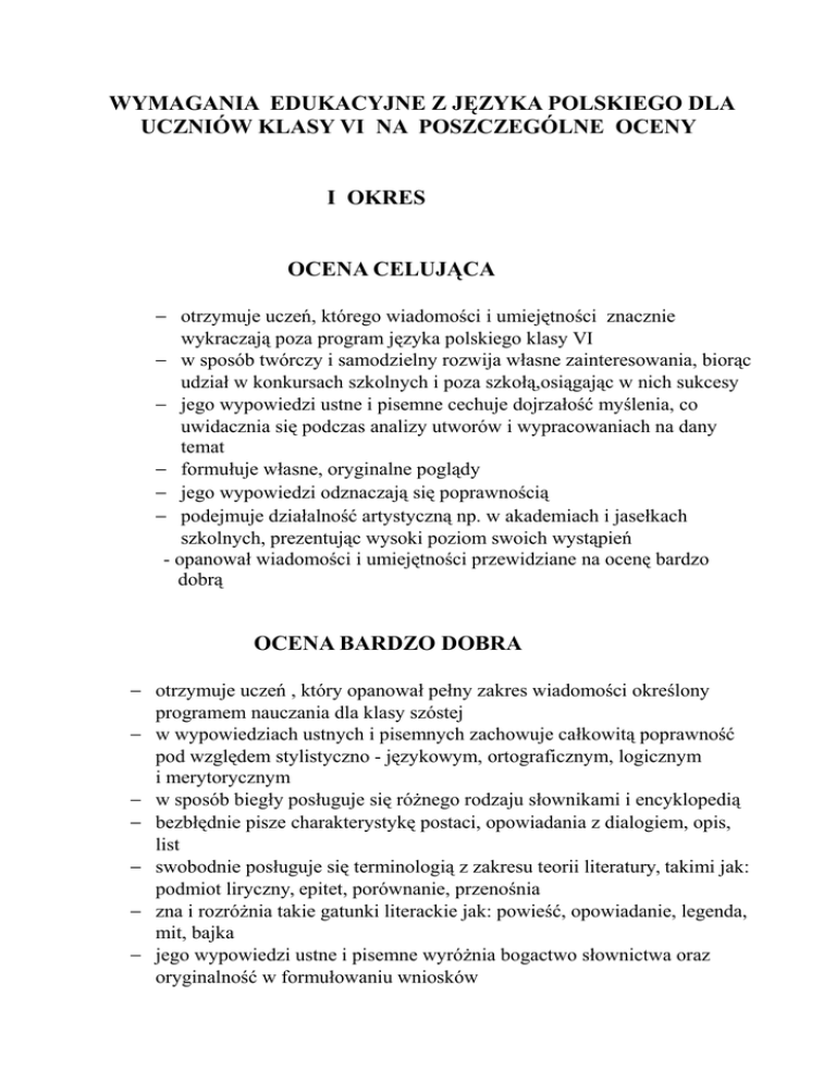 WYMAGANIA EDUKACYJNE Z JĘZYKA POLSKIEGO DLA UCZNIÓW KLASY VI NA POSZCZEGÓLNE OCENY I OKRES OCENA CELUJĄCA otrzymuje uczeń, którego wiadomości i umiejętności znacznie wykraczają poza program języka polskiego klasy VI w sposób twórczy i samodzielny rozwija własne zainteresowania, biorąc udział w konkursach szkolnych i poza szkołą,osiągając w nich sukcesy jego wypowiedzi ustne i pisemne cechuje dojrzałość myślenia, co uwidacznia się podczas analizy utworów i wypracowaniach na dany temat formułuje własne, oryginalne poglądy jego wypowiedzi odznaczają się poprawnością podejmuje działalność artystyczną np. w akademiach i jasełkach szkolnych, prezentując wysoki poziom swoich wystąpień - opanował wiadomości i umiejętności przewidziane na ocenę bardzo dobrą OCENA BARDZO DOBRA otrzymuje uczeń , który opanował pełny zakres wiadomości określony programem nauczania dla klasy szóstej w wypowiedziach ustnych i pisemnych zachowuje całkowitą poprawność pod względem stylistyczno - językowym, ortograficznym, logicznym i merytorycznym w sposób biegły posługuje się różnego rodzaju słownikami i encyklopedią bezbłędnie pisze charakterystykę postaci, opowiadania z dialogiem, opis, list swobodnie posługuje się terminologią z zakresu teorii literatury, takimi jak: podmiot liryczny, epitet, porównanie, przenośnia zna i rozróżnia takie gatunki literackie jak: powieść, opowiadanie, legenda, mit, bajka jego wypowiedzi ustne i pisemne wyróżnia bogactwo słownictwa oraz oryginalność w formułowaniu wniosków zna poznane dotąd części mowy i ich podział na części mowy odmienne i nieodmienne potrafi stosować ich poprawne formy zna części zdania i potrafi narysować wykres zdania pojedynczego zna podział zdań złożonych i umie rozpoznać rodzaj zdania złożonego oraz narysować jego wykres zna podział głosek i umie je nazwać potrafi zanalizować wyraz pod względem słowotwórczym bardzo dobrze zna treść omawianych lektur zna poznane zasady ortograficzne i pisze w sposób poprawny OCENA DOBRA otrzymuje uczeń, który opanował wiadomości i umiejętności zawarte w podstawie programowej oraz wybrane elementy przewidziane programem nauczania w klasie szóstej poprawnie czyta i stosuje zasady stosownej intonacji oraz akcentowania podejmuje próby wypowiadania się w formach trudniejszych niż te, które określone są w podstawie programowej na przykład opowiadanie twórcze z dialogiem, z elementami opisu czy sprawozdanie z wydarzenia kulturalnego jego wypowiedzi zawierają jednak błędy zna treść lektur, ale nie zawsze potrafi zinterpretować dobrze sens formułuje wnioski oczywiste, bez własnej inwencji zna części mowy, umie je rozpoznać i potrafi tworzyć ich formy zazwyczaj poprawnie zna i stosuje zdania złożone i ich rodzaje zazwyczaj poprawnie potrafi zanalizować budowę słowotwórczą wyrazu zna podstawowe reguły ortograficzne, jednak nie zawsze pisze w sposób poprawny OCENA DOSTATECZNA otrzymuje uczeń, który w zakresie umożliwiającym jego dalsze postępy w nauce, opanował wiedzę i umiejętności zawarte w podstawie programowej w swoich wypowiedziach ustnych i pisemnych na ogół przestrzega zasad poprawności składniowej, ortograficznej i słownikowej w miarę samodzielnie lub przy niewielkiej pomocy nauczyciela posługuje się poznanymi formami wypowiedzi technika czytania ucznia pozwala na zrozumienie tekstu zna treść lektur pobieżnie, w związku z czym jego wypowiedzi ustne i pisemne na ich temat są skrótowe i pozbawione głębszej analizy w zakresie wiadomości z gramatyki zna części mowy, ale czasami ma problem ze wskazaniem ich w tekście zna budowę składniową zdania pojedynczego i złożonego, ale nie zawsze potrafi wykorzystać tę wiedzę w praktyce zna budowę słowotwórczą wyrazu, ale również nie zawsze potrafi samodzielnie omówić budowę konkretnego wyrazu zna podstawowe zasady ortograficzne, ale często popełnia w pisowni dużo błędów OCENA DOPUSZCZAJĄCA otrzymuje uczeń, którego wiedza i umiejętności pozwalają na samodzielne lub przy pomocy nauczyciela wykonanie zadań o niewielkim stopniu trudności jego technika czytania pozwala na zrozumienie tekstu w wypowiedziach ustnych i pisemnych popełnia wiele błędów różnego rodzaju podejmuje próby pisania poznanych form wypowiedzi, ale o niewielkim stopniu trudności lub z pomocą nauczyciela również przy pomocy nauczyciela rozpoznaje części mowy i określa ich funkcję w zdaniu odróżnia zdanie pojedyncze od złożonego potrafi zanalizować słowotwórczo tylko proste wyrazy treść lektur zna bardzo pobieżnie zna tylko niektóre reguły ortograficzne, popełnia w wypowiedziach pisemnych nawet podstawowe błędy OCENA NIEDOSTATECZNA otrzymuje uczeń, który nie opanował podstawowych wiadomości przewidzianych przez podstawę programową nie opanował w stopniu zadowalającym techniki czytania jego wypowiedzi nie są poprawne pod względem rzeczowym, językowym, stylistycznym, ortograficznym i interpunkcyjnym nie zna treści lektur i nie potrafi się na ich temat wypowiedzieć II OKRES Ucznia obowiązują wymagania na poszczególne oceny za I okres oraz ponadto: OCENA CELUJĄCA wiedza i umiejętności ucznia wykraczają znacznie poza obowiązujący program nauczania uczeń proponuje rozwiązania oryginalne w zakresie omawiania utworów, wypracowań czy głoszonych poglądów bierze udział w konkursach na terenie szkoły i poza nią, zajmując wysokie miejsca, a podczas przygotowania do tychże konkurów znacznie wzbogaca swoją wiedzę jego wypowiedzi ustne i pisemne cechuje bogactwo języka - opanował wiadomości i umiejętności przewidziane na ocenę bardzo dobrą OCENA BARDZO DOBRA otrzymuje uczeń, który opanował pełny zakres wiadomości określony programem nauczania dla klasy szóstej bezbłędnie pisze charakterystykę postaci, dziennik, określa motywację czynów bohaterów, ocenia ich 