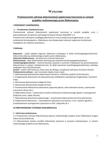Wytyczne Przetworzenie cyfrowe dokumentacji papierowej tworzonej w ramach projektu realizowanego przez Wykonawcę. I PRZEDMIOT ZAMÓWIENIA 1. Przedmiotem Zamówienia jest: Przetworzenie cyfrowe dokumentacji papierowej tworzonej w ramach projektu wraz z wprowadzeniem do Systemu Cyfrowego Archiwum Danych AQUANET S. A. Przetworzeniu cyfrowemu podlegają dokumenty w wersji ostatecznej przygotowane, w celu przekazania Zamawiającemu. Wykonawca musi dysponować własnym zapleczem technicznym niezbędnym do realizacji zamówienia. I Definicje Dokument - każdy odrębny logicznie dokument wchodzący w skład teczki/segregatora/kartonu. Dokumenty dotyczą realizowanego projektu przez Wykonawcę. Dokument Elektroniczny – przetworzony cyfrowo Dokument. Dokumentacja - zbiór Dokumentów stanowiących zawartość teczki/segregatora/kartonu. Teczka/segregator/karton - materiał biurowy używany w systemie tradycyjnym do przechowywania dokumentacji w postaci nieelektronicznej. W skład zawartości teczki/segregatora/kartonu wchodzą znajdujące się w niej Dokumenty. System - system informatyczny, który służy do obsługi i zarządzania Cyfrowym Archiwum Danych. Przetworzenie cyfrowe – jest rozumiane między innymi, jako: 1. Dekompozycja dokumentów papierowych (rozszycie, rozłożenie, podział na formaty itp.), 2. Przygotowanie dokumentu do skanowania (np. podklejenie uszkodzonych fragmentów, rozłożenie map), 3. Skanowanie dokumentacji małego formatu, 4. Skanowanie dokumentacji dużego formatu, 5. Przetwarzanie elektroniczne dokumentu (poprawa jakości, ukierunkowanie obrazu, ewentualne czyszczenie obrazu itp.), 6. Skład elektroniczny – wytworzenie struktury dokumentu elektronicznego zgodne z wymaganiami (kolejność stron, układ, format), 7. Rekompozycja dokumentu papierowego – przywrócenie dokumentów do formy pierwotnej, 8. Indeksowanie dokumentu – wprowadzenie dokumentu do Systemu wraz z opisem zgodnie z przedstawionymi wymaganiami zapisanymi w OPZ i Załączniku Nr 1 III PRZETWORZENIE CYFROWE DOKUMENTACJI 1. Informacje podstawowe. 1.1 Przetwarzana cyfrowo Dokumentacja dotyczy realizowanego projektu przez Wykonawcę mające status wersji ostatecznej. 1.2 Dokumentacja zawiera wszelkie Dokumenty tworzone w procesie inwestycyjnym, w ramach realizowanego projektu przez Wykonawcę. 1 1.3 Wykonanie przetworzenia cyfrowego Dokumentacji odbywać się będzie poza siedzibą Spółki z zastrzeżeniem, że Wykonawca na żądanie Zamawiającego udostępnieni w Systemie, określony w zgłoszeniu Dokument. 1.4 Zamawiający zobowiązuje się przygotować zestaw etykiet samoprzylepnych wraz z nadrukowanymi kodami kreskowymi, w celu oklejenia dokumentów przez Wykonawcę. 1.5 Zamawiający zobowiązuje się przygotować strukturę katalogową w Systemie, niezbędną dla realizacji projektu. 1.6 Przetworzona cyfrowo Dokumentacja oraz opis zawartości teczek/segregatorów/kartonów będzie podlegał weryfikacji przez Zamawiającego. Sposób i metoda dotycząca weryfikacji jest opisana w pkt III. 3. 1.7 Zamawiający wskaże osobę, która będzie pełnić funkcję konsultanta merytorycznego. Konsultacje mogą odbywać się telefonicznie, mailowo lub na miejscu w lokalizacji siedziby Spółki. 1.8 Zamawiający zobowiązuje się dostarczyć Wykonawcy licencję umożliwiającą dostęp do Systemu na czas realizacji projektu. 1.9 Parametry skanowania przedstawia Załącznik Nr 2. 1.10 Po zakończeniu Umowy Wykonawca jest zobowiązany do zwrotu wszystkich materiałów, które stanowiły podstawę do wprowadzenia Dokumentów Elektronicznych do Systemu. 1.11 Zamawiający nabywa pełne prawa autorskie do wszelkich utworów powstałych w wyniku realizacji Umowy. 2. Przetworzenie cyfrowe i opis Teczki/Segregatora/Kartonu oraz Dokumentu 2.1 Skanować należy wszystkie dokumenty, łącznie z okładkami teczek/segregatorów/kartonów (fronty i strony tytułowe), opisanymi kopertami i kartami tytułowymi opracowań oraz pieczęciami. 2.2 Cyfrowe obrazy dokumentów muszą zachowywać format wielkości oryginału. Dopuszcza się korygowanie tła dokumentu, z zastrzeżeniem zachowania informacji zawartych na dokumencie. 2.3 Dokumenty mają być skanowane w całości (bez rozcinania i dzielenia obrazów na fragmenty). Nie dopuszczalna jest dekompozycja obrazu pojedynczych stron dokumentów. 2.4 Wykonawca ma umożliwić kontrolę poprawności skanowania dokumentów i jakości dokumentów elektronicznych na żądanie Zamawiającego poprzez System. 2.5 Wykonawca w chwili przetworzenia elektronicznego dokumentacji musi zaindeksować ją zgodnie z wytycznymi przedstawionymi w Załączniku Nr 1, w Systemie Archiwum Cyfrowego Danych. 2.6 Wykonawca zobowiązany jest do postępowania przy wykonaniu zamówienia zgodnie z przepisami Ustawy z dnia 29 sierpnia 1997 r. o ochronie danych osobowych. 3. Kontrola poprawności realizacji przetworzenia cyfrowego. 3.1 Zamawiający przeprowadzi kontrolę przetworzenia cyfrowego, każdej przekazanej Dokumentacji od Wykonawcy. 3.2 Zamawiający zweryfikuje przetworzone cyfrowo Dokumentacje przekazane od Wykonawcy, w celu sprawdzenia jej, jakości, pod kątem ilości, zawartości i ułożenia. Zamawiający przeprowadzi kontrolę w zakresach przedstawionych w punktach 3.3 -3.6. W przypadku stwierdzenia błędów, Zamawiający przekaże Dokumentację do poprawy, w celu usunięcia błędów. 3.3 Zamawiający przeprowadzi kontrolę zgodności rekompozycji teczki/segregatora/kartonu po otrzymaniu Dokumentacji od Wykonawcy. Za błąd uznane zostanie: - niezgodność zawartości teczki/segregatora/kartonu ze spisem zawartości, 2 - błędna kolejność stron teczki/segregatora/kartonu, - nieprawidłowo złożone Dokumenty wielkoformatowe (dokumenty muszą być złożone do wielkości teczki/segregatora/kartonu), - błędna indeksacja, - nietrwałe (odklejające się, ścierające) kody kreskowe naklejone na dokumenty papierowe i teczki/segregatora/kartonu, - inne, wpływające, na jakość wykonywa
