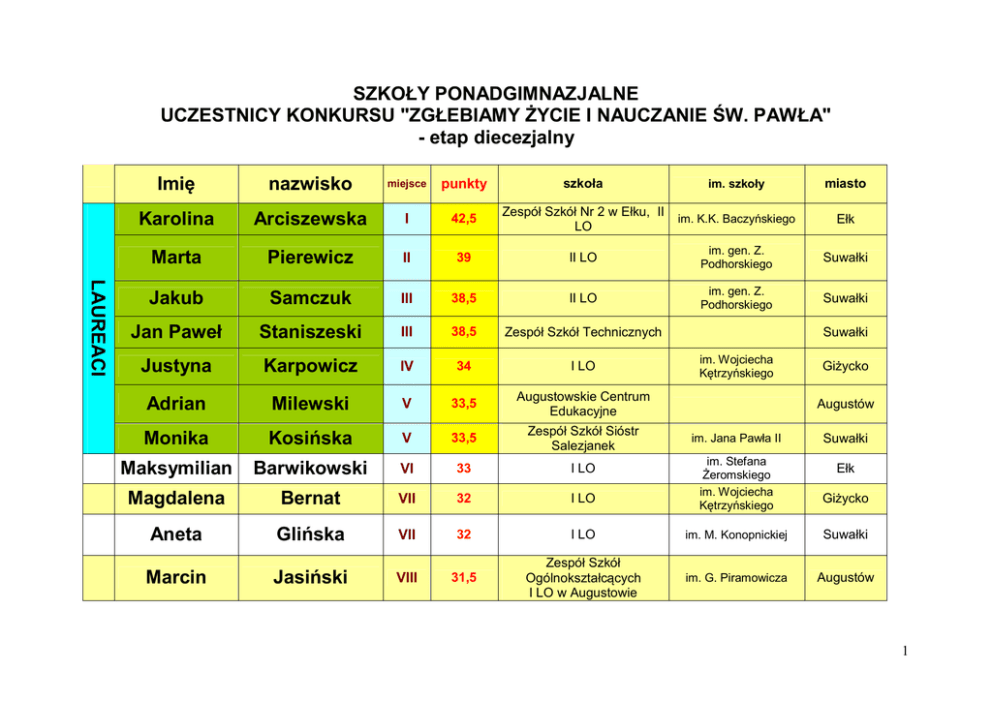 SZKOŁY PONADGIMNAZJALNE UCZESTNICY KONKURSU "ZGŁEBIAMY ŻYCIE I NAUCZANIE ŚW. PAWŁA" - etap diecezjalny LAUREACI Imię nazwisko miejsce punkty szkoła im. szkoły miasto Karolina Arciszewska I 42,5 Zespół Szkół Nr 2 w Ełku, II LO im. K.K. Baczyńskiego Ełk Marta Pierewicz II 39 II LO im. gen. Z. Podhorskiego Suwałki Jakub Samczuk III 38,5 II LO im. gen. Z. Podhorskiego Suwałki Jan Paweł Staniszeski III 38,5 Zespół Szkół Technicznych Justyna Karpowicz IV 34 I LO Adrian Milewski V 33,5 Monika Kosińska V 33,5 Maksymilian Barwikowski VI 33 I LO Magdalena Bernat VII 32 I LO Aneta Glińska VII 32 I LO im. M. Konopnickiej Suwałki Marcin Jasiński VIII 31,5 Zespół Szkół Ogólnokształcących I LO w Augustowie im. G. Piramowicza Augustów Augustowskie Centrum Edukacyjne Zespół Szkół Sióstr Salezjanek Suwałki im. Wojciecha Kętrzyńskiego Giżycko Augustów im. Jana Pawła II im. Stefana Żeromskiego im. Wojciecha Kętrzyńskiego Suwałki Ełk Giżycko 1 Klaudia Karwowska IX 31 Zespół Szkół Nr 1 Mateusz Grygo X 30,5 Liceum Ogólnokształcace im. Jana Pawła II Gołdapi Tobiasz Stasiński X 30,5 Liceum Ogólnokształcace im. Jana Pawła II Gołdapi Agata Prostko X 30,5 I LO im. Stefana Żeromskiego Ełk Łukasz Moćkun XI 30 I LO im. M. Konopnickiej Suwałki Weronika Popiełuszko XII 29 Agnieszka Kierzel XII 29 Barbara Karwowska XIII Paulina Markiewicz Magdalena Wierzbicka Piszu Augustowskie Centrum Edukacyjne Zespół Szkół Kształtowania Środowiska i Agrobiznesu im. I Dywizji T. Kościuszki Giżycko 27,5 Zespół Szkół Nr 5 im. K. Brzostowskiego Ełk XIV 25,5 I LO im. Stefana Żeromskiego Ełk XV 18 Zespół Szkół Ogólnokształcących I LO w Augustowie im. G. Piramowicza Augustów Augustów 2